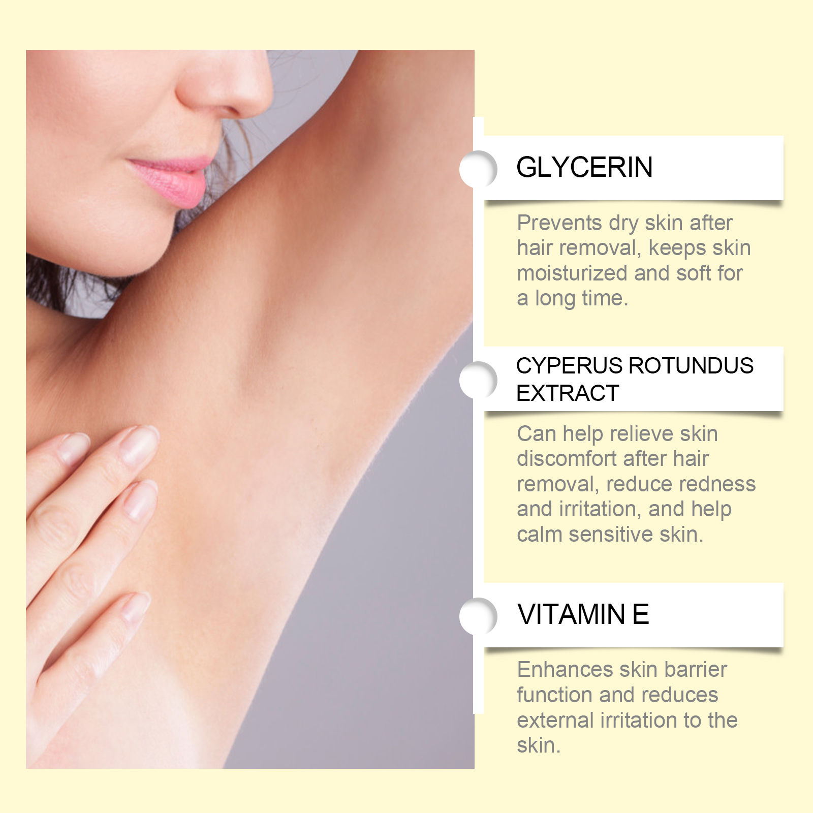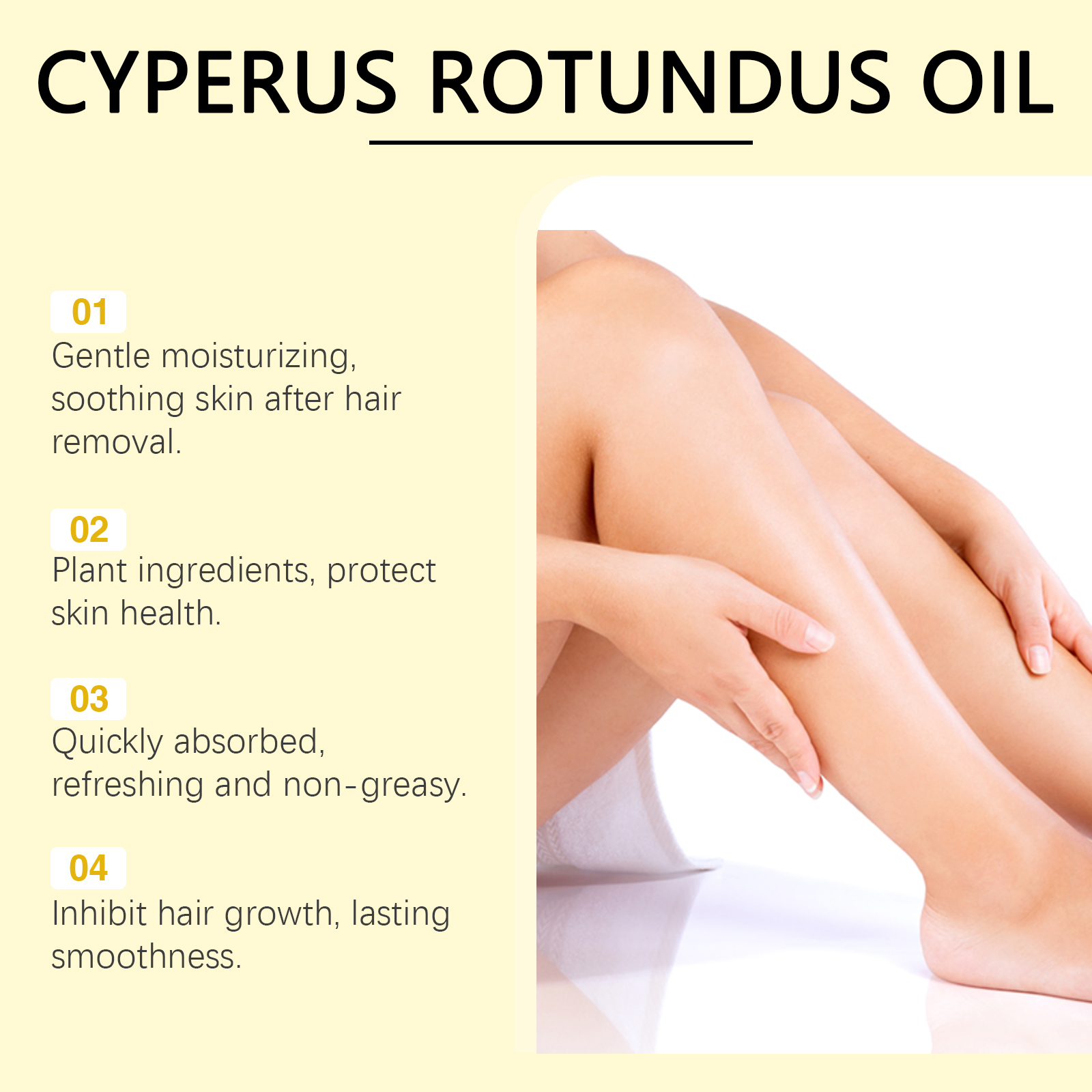 我们的香附脱毛护理油含有霍霍巴籽油、向日葵提取物。它可以深层滋养,帮助缓解脱毛后的干燥和不适。它的使用方法很简单:1.清洁皮肤并保持干燥。2.使用滴管取适量本品均匀涂抹于全身肌肤;3.轻轻地打圈按摩,让它完全被吸收。有助于延缓头发生长周期,保持皮肤光滑细腻。