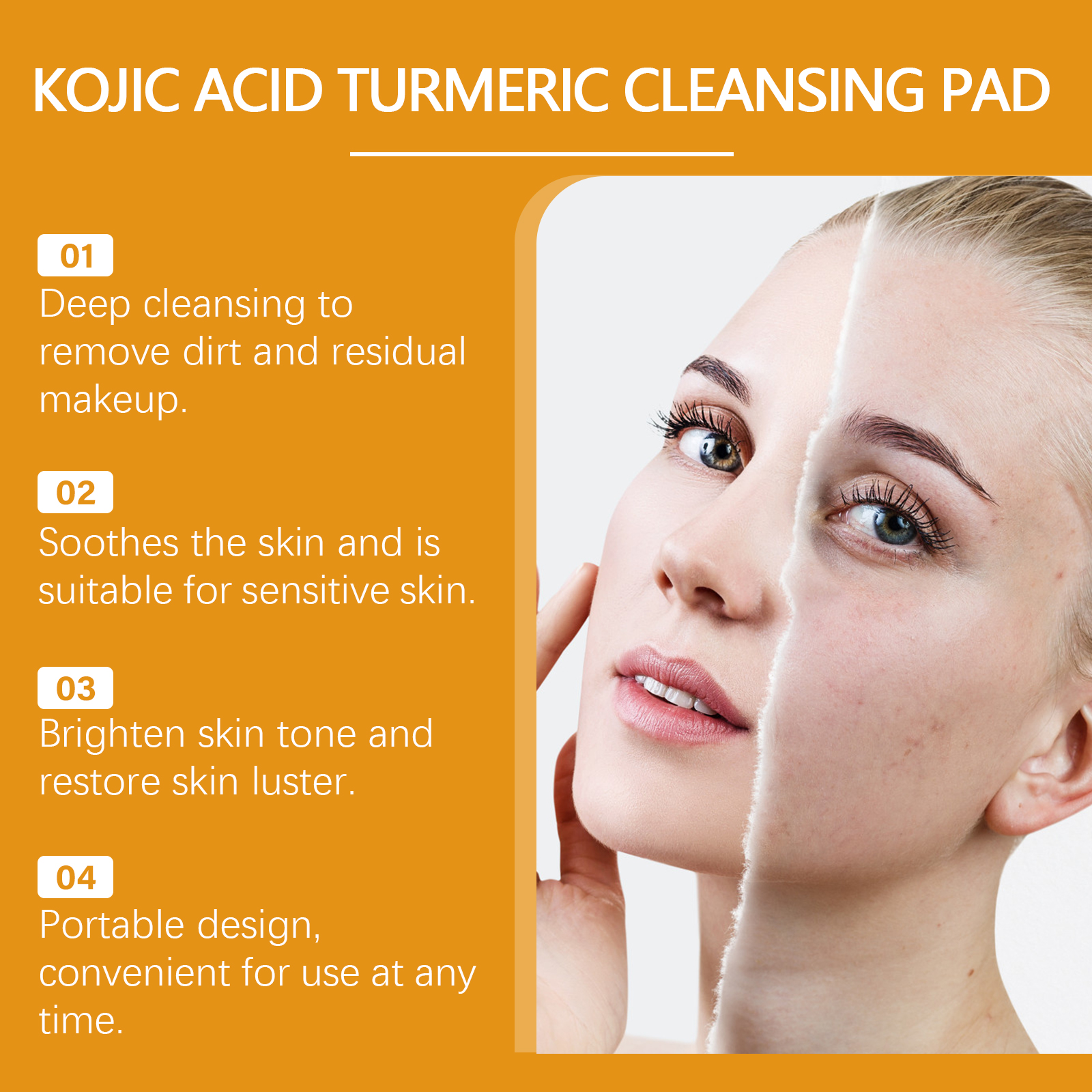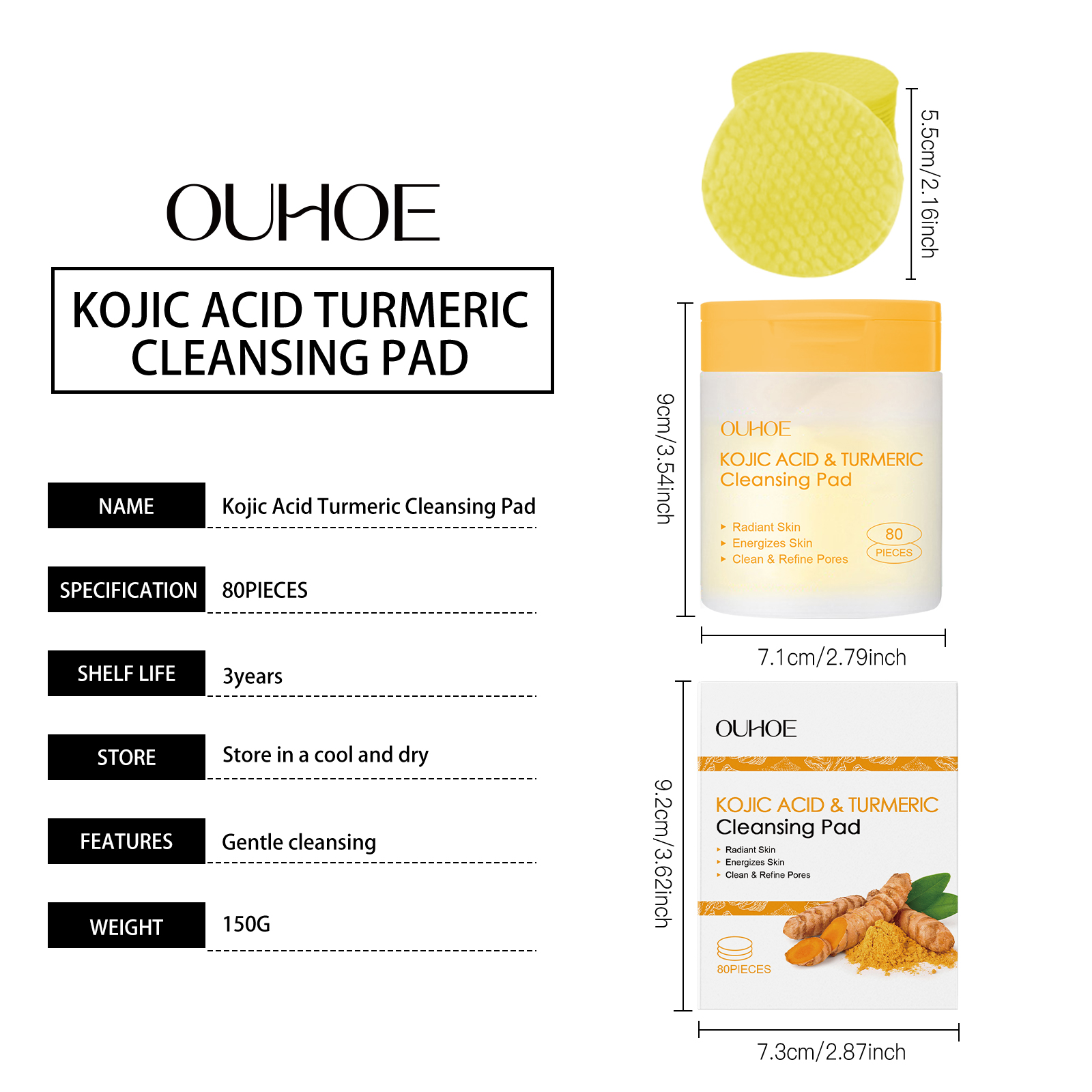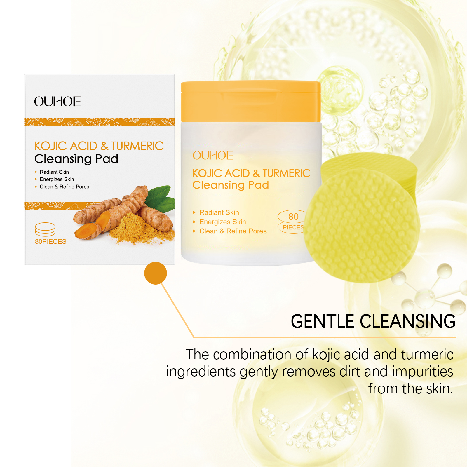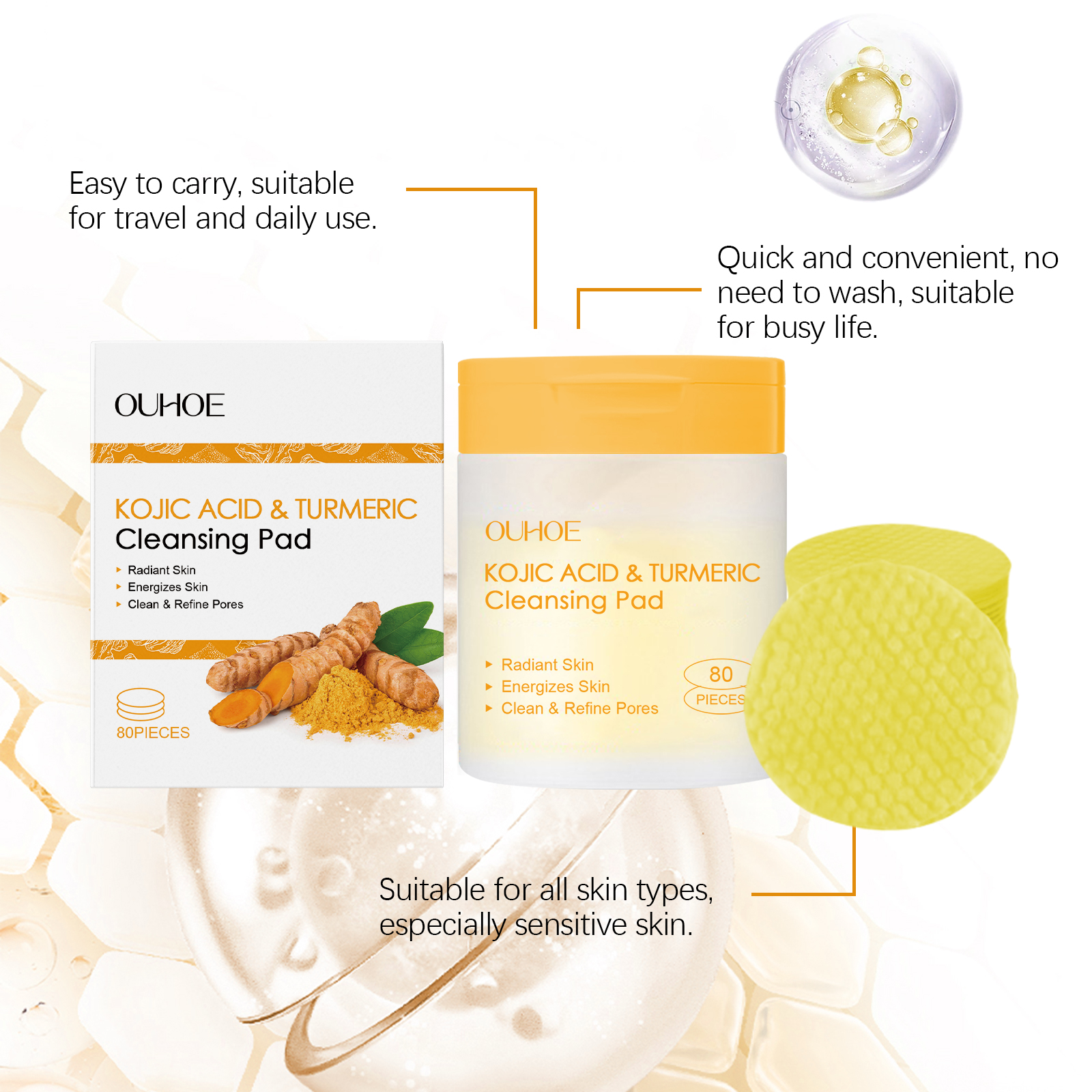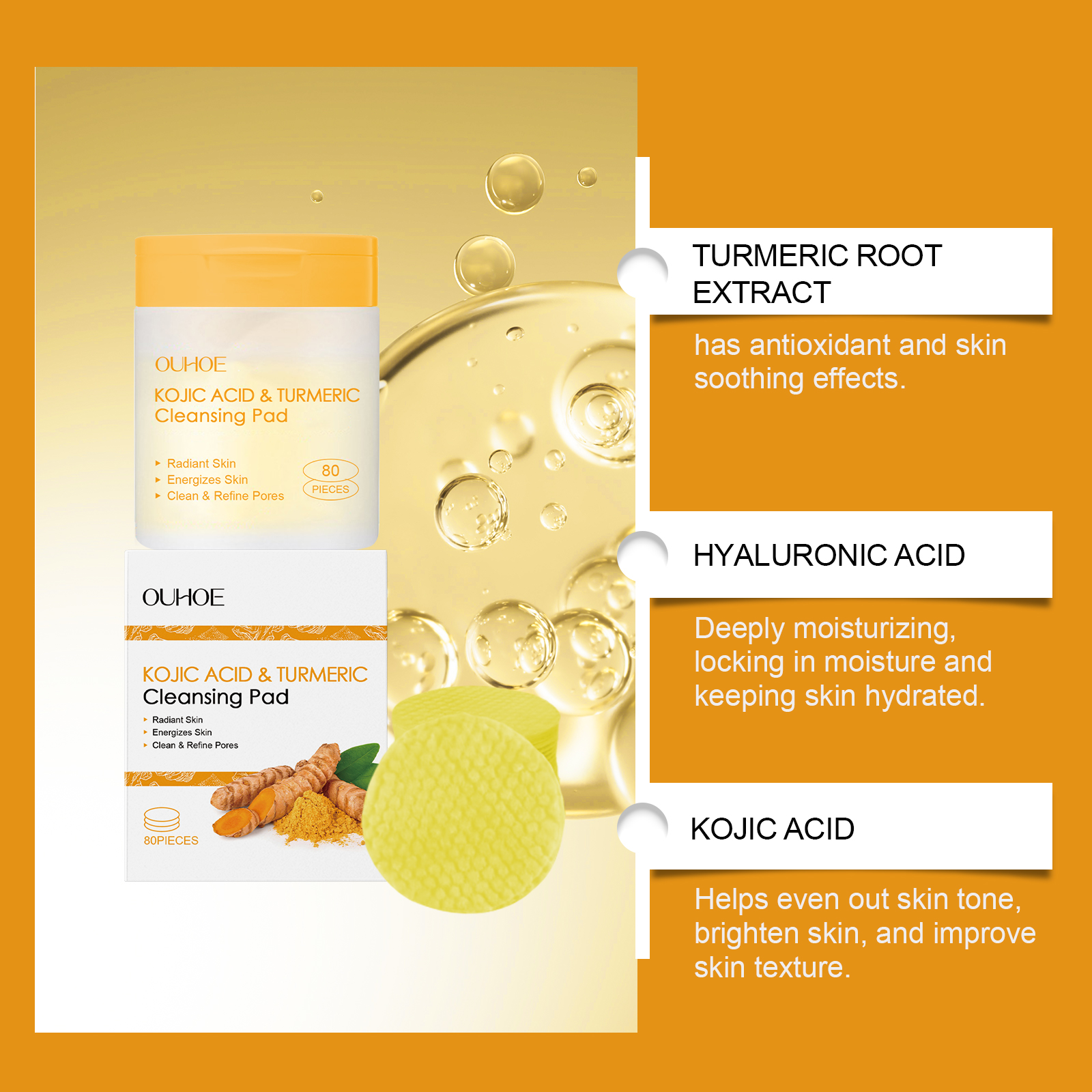 我们的曲酸姜黄清洁棉片含有姜黄根提取物、透明质酸、芦荟提取物。它可以有效去除污垢和多余油脂,收缩毛孔,改善肤质。促进肌肤细胞更新,增强肌肤活力。轻松方便,可随时随地进行护肤。它的使用方法很简单:1.清洁和滋润皮肤;2.取一片本品,轻轻擦拭于皮肤上。玻尿酸深层滋润肌肤,锁住水分,避免肌肤干燥。芦荟提取物有舒缓作用,缓解皮肤不适。