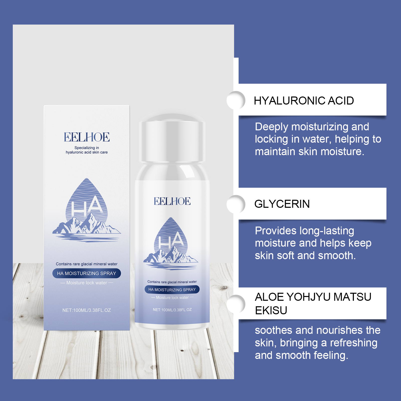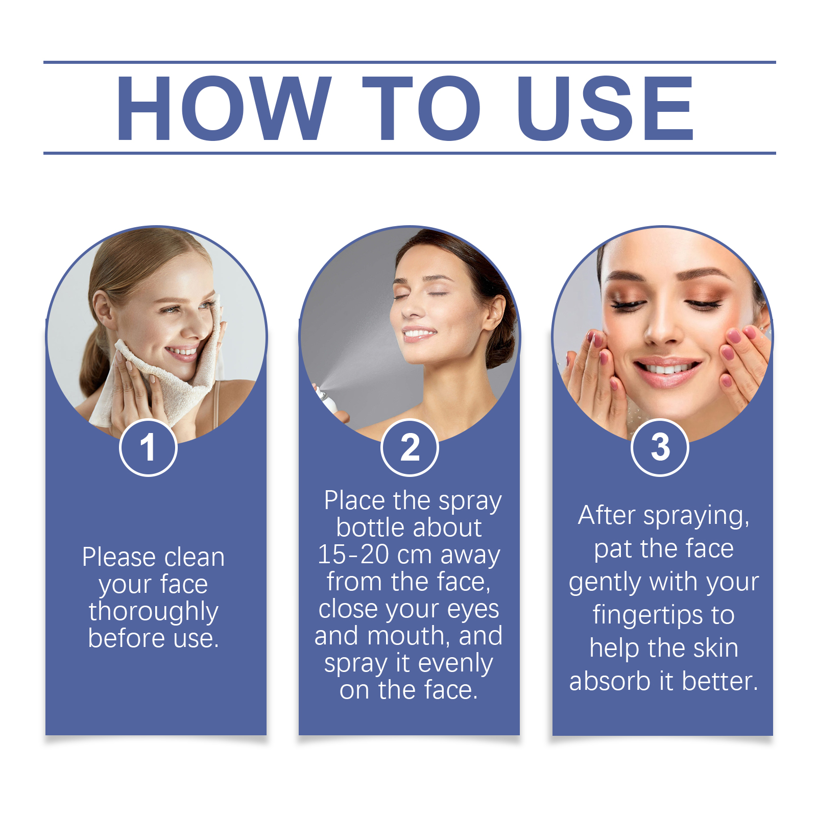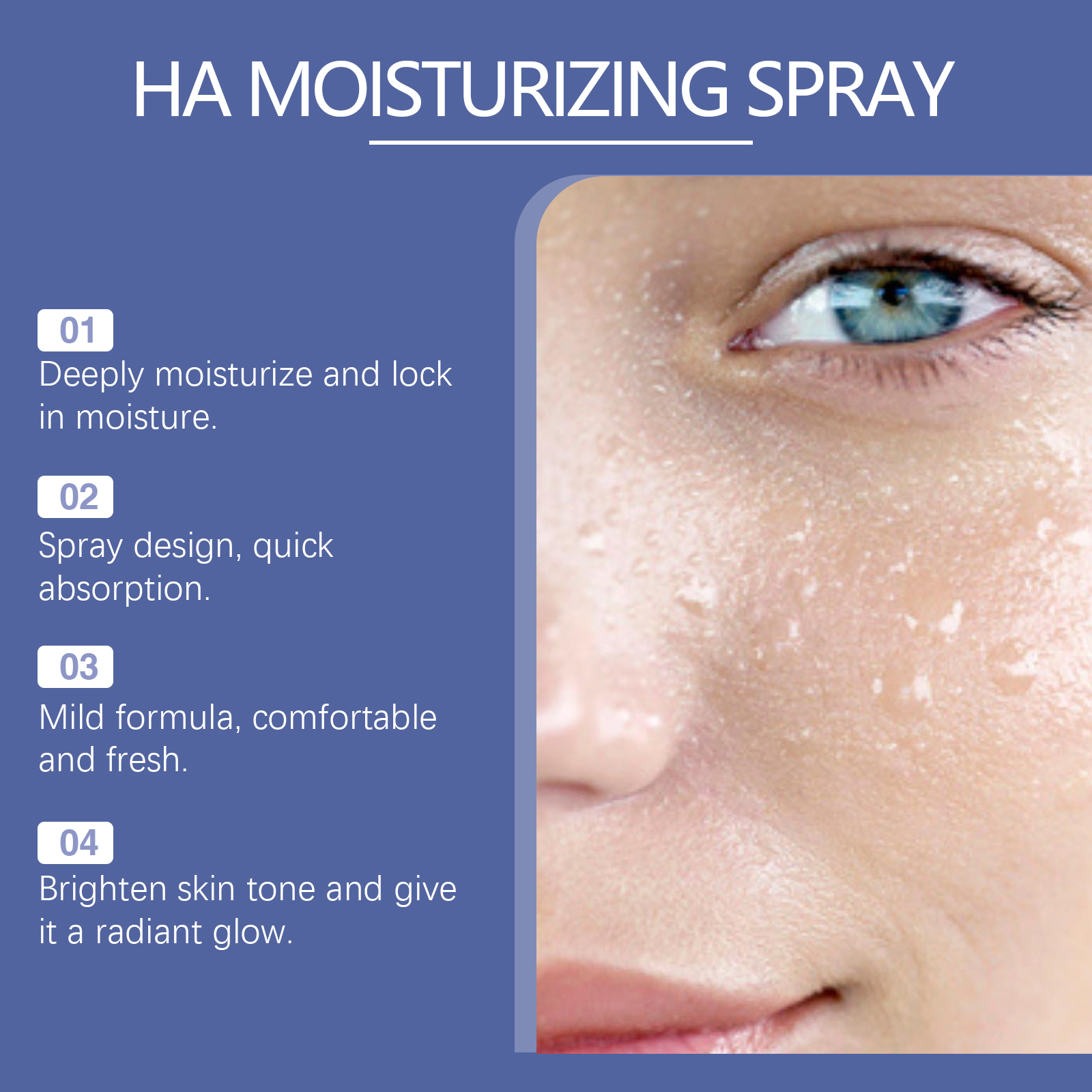 我们的玻尿酸补水喷雾含有芦荟提取物、小叶海藻提取物。它可以高效渗透,快速向肌肤注入水分,保持肌肤长时间保湿。它的使用方法很简单:使用前请彻底清洁脸部。将喷雾瓶放置在离面部约15-20厘米处,闭上眼睛和嘴巴,均匀地喷在脸上。喷完后,用指尖轻轻拍打脸部,帮助肌肤更好地吸收。并且喷雾质地轻柔,喷雾后迅速吸收,不粘腻不油腻。