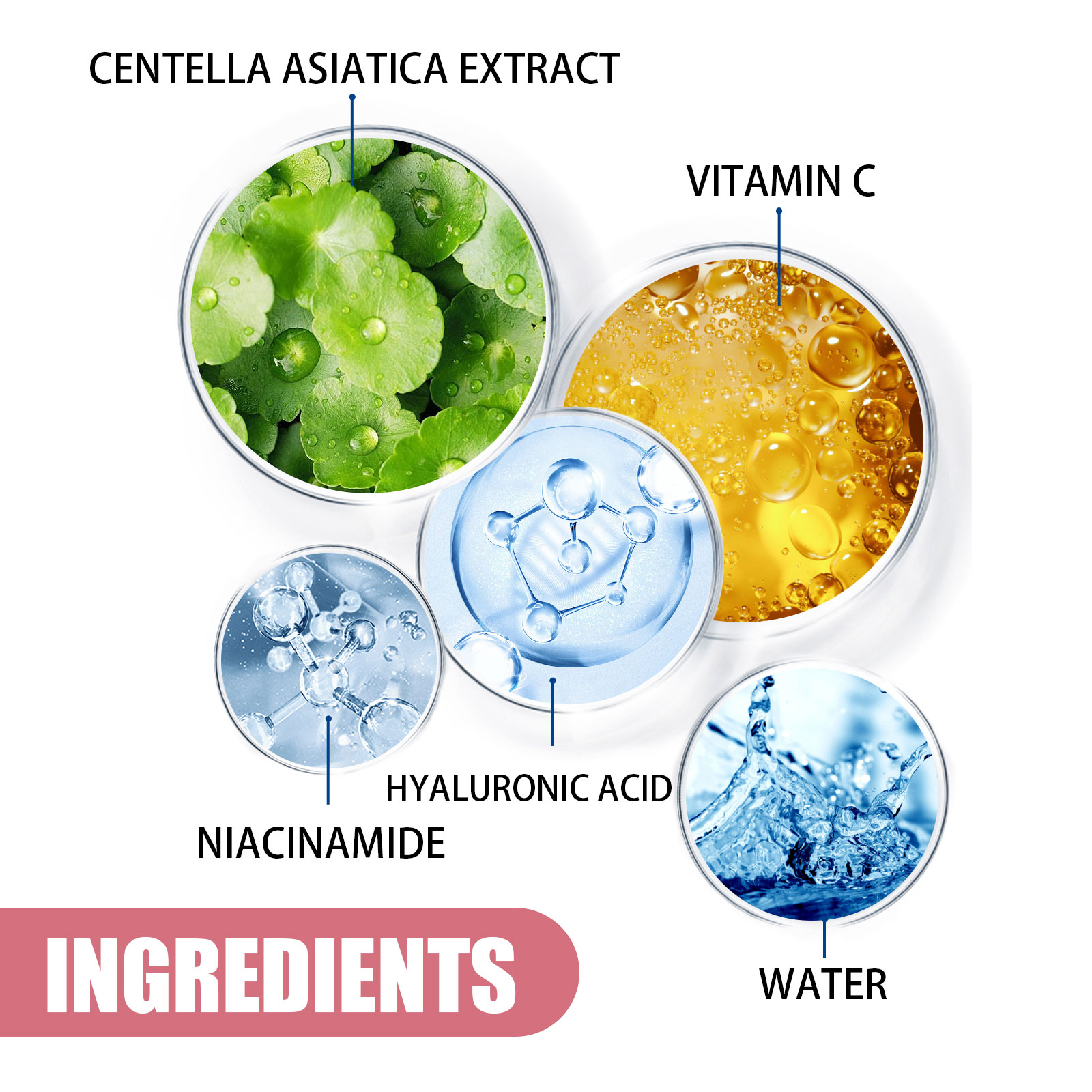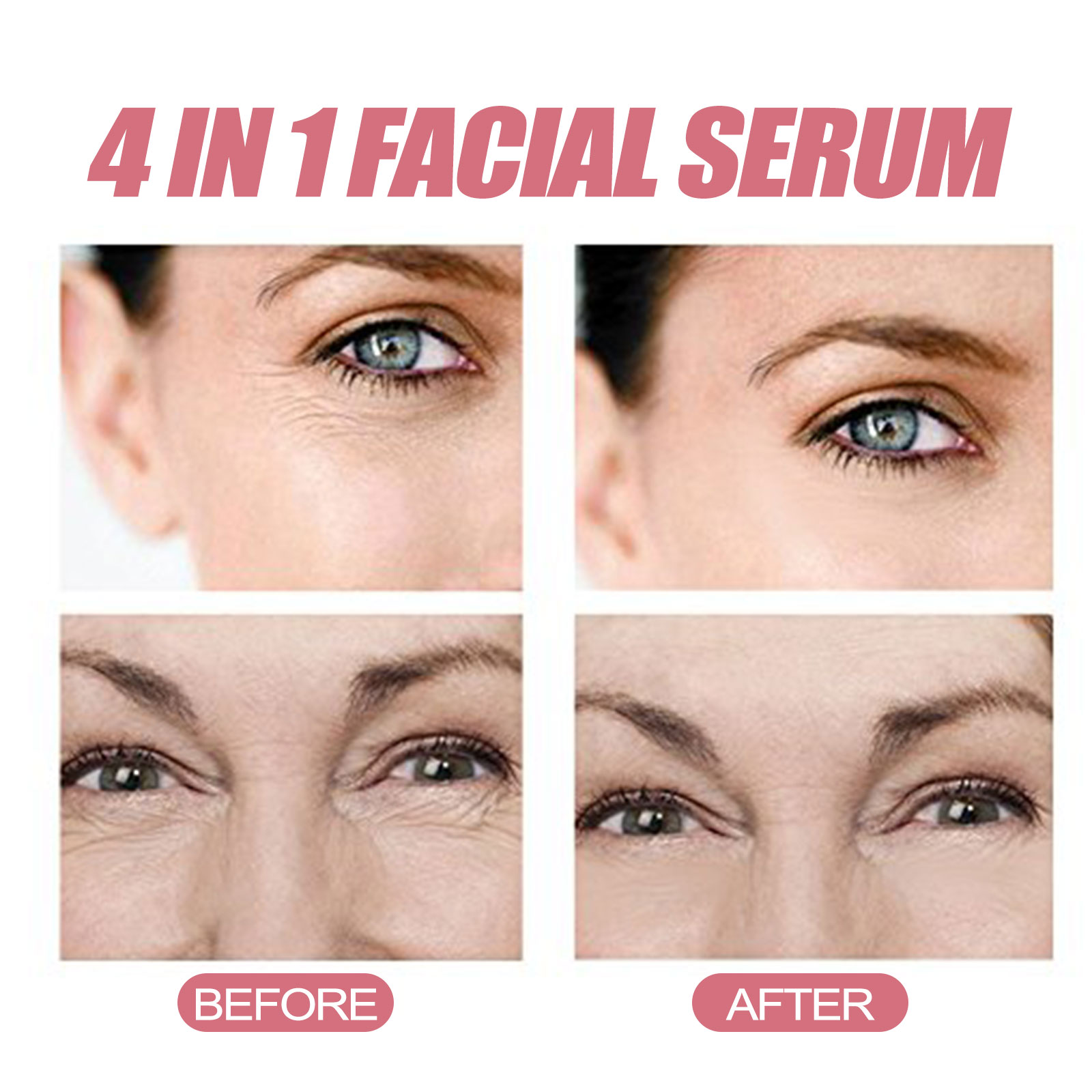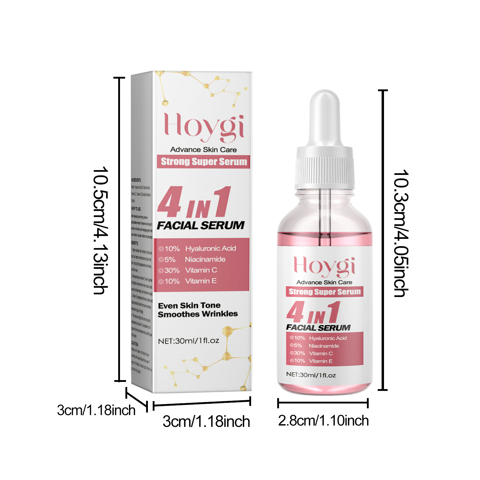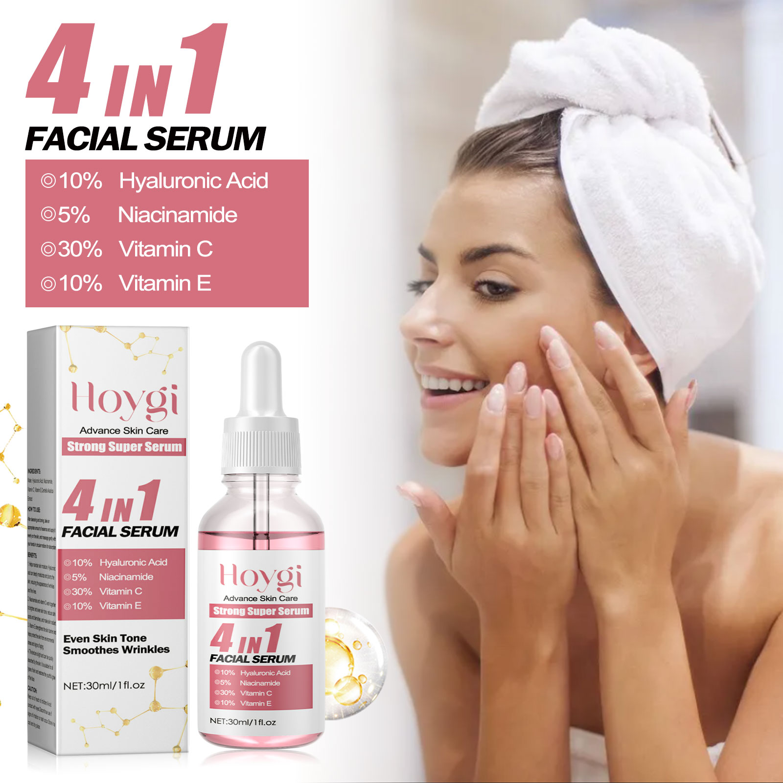 我们的4合1面部精华液含有透明质酸、烟酰胺、维生素C。它可以滋养和保护抗氧化超级食物透明质酸深度水合减少皱纹和细纹视黄醇它的使用方法很简单:洁面爽肤后,取适量均匀涂抹于肌肤,用手轻轻打圈按摩至吸收。并且可以恢复你的皮肤年轻光彩。