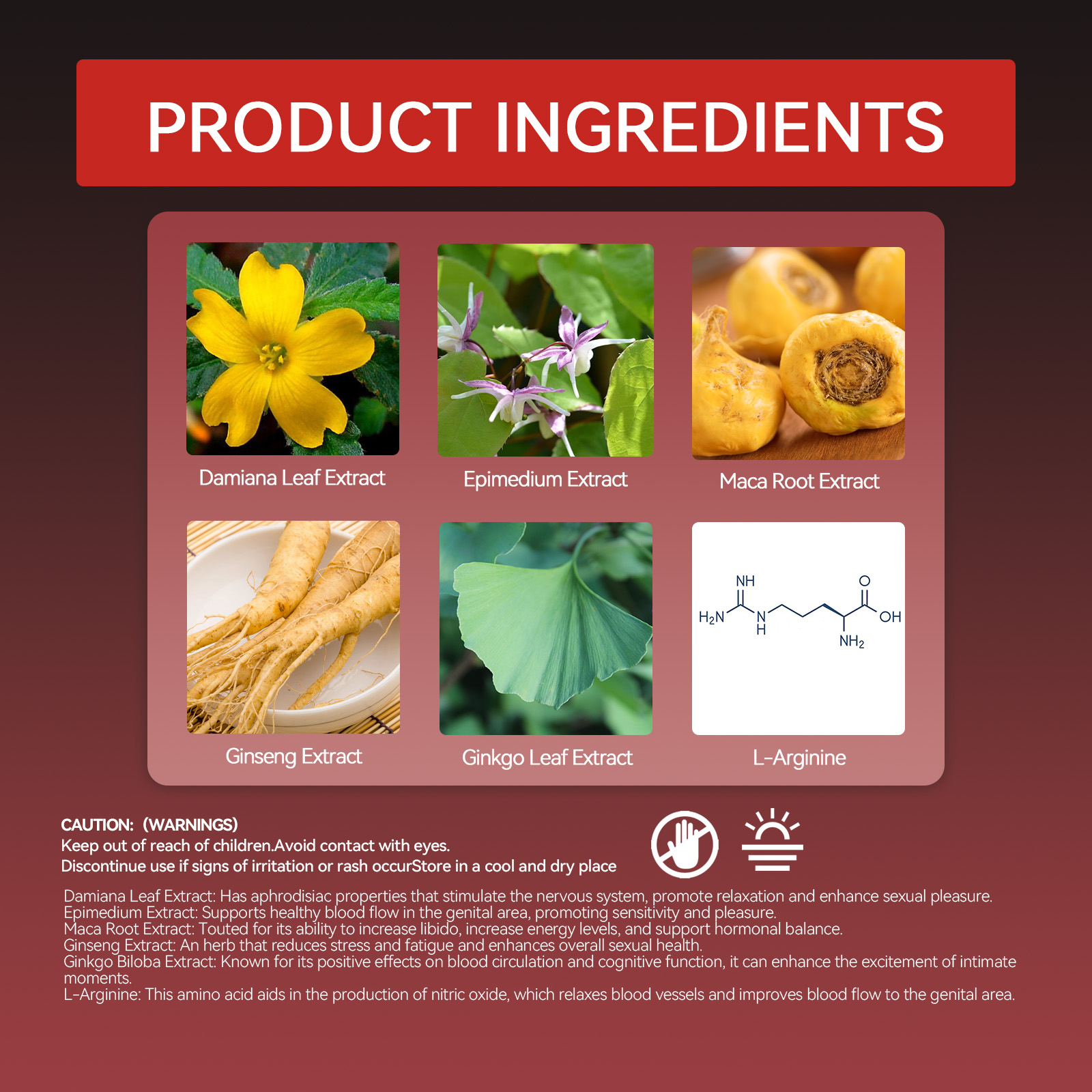 我们的女性护理精油含有达米阿那叶提取物、淫羊藿提取物、玛卡根提取物。它可以解决生理和心理问题缺乏性技巧和刺激单调乏味的性生活。它的使用方法很简单:清洁干燥的身体肌肤取1-2滴本品,均匀地抹在大腿内侧或额头上,享受充满激情的亲密时刻等待5-10分钟让它生效。并且可以通过激活女性负责亲密关系的内部神经,增强女性对激情的敏感度,提高女性亲密关系的活力。加速血液循环加速血液循环,将营养物质输送到全身,提高整体体力,减少疲劳,提振女性精神。点燃爱的火花释放压力和焦虑,增强放松和积极情绪,点燃爱的火花,让女性沉醉在浪漫的氛围中。增强你们对彼此的热情增强彼此的热情,有助于增进伴侣之间的亲密关系。