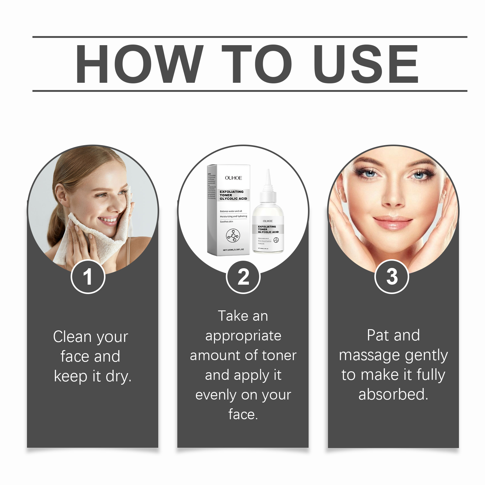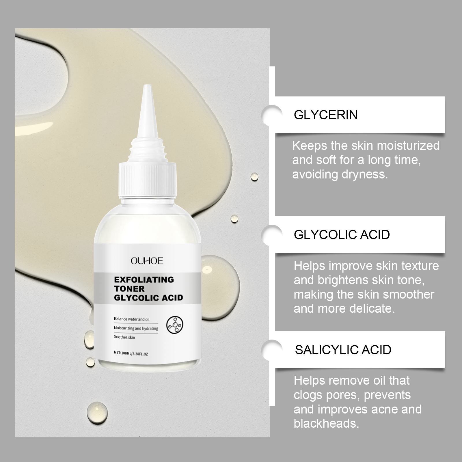 我们的去角质保湿爽肤水含有甘油、芦荟叶提取物、乙醇酸。它可以去除多余油脂,净化肌肤。收缩毛孔,改善肤质,展现娇嫩肌肤。它的使用方法很简单:1.清洁面部,保持干燥。2.取适量爽肤水均匀涂在脸上。3.轻轻拍打和按摩,使其完全吸收。深层滋养,为肌肤提供充足的水分,保持肌肤保湿。