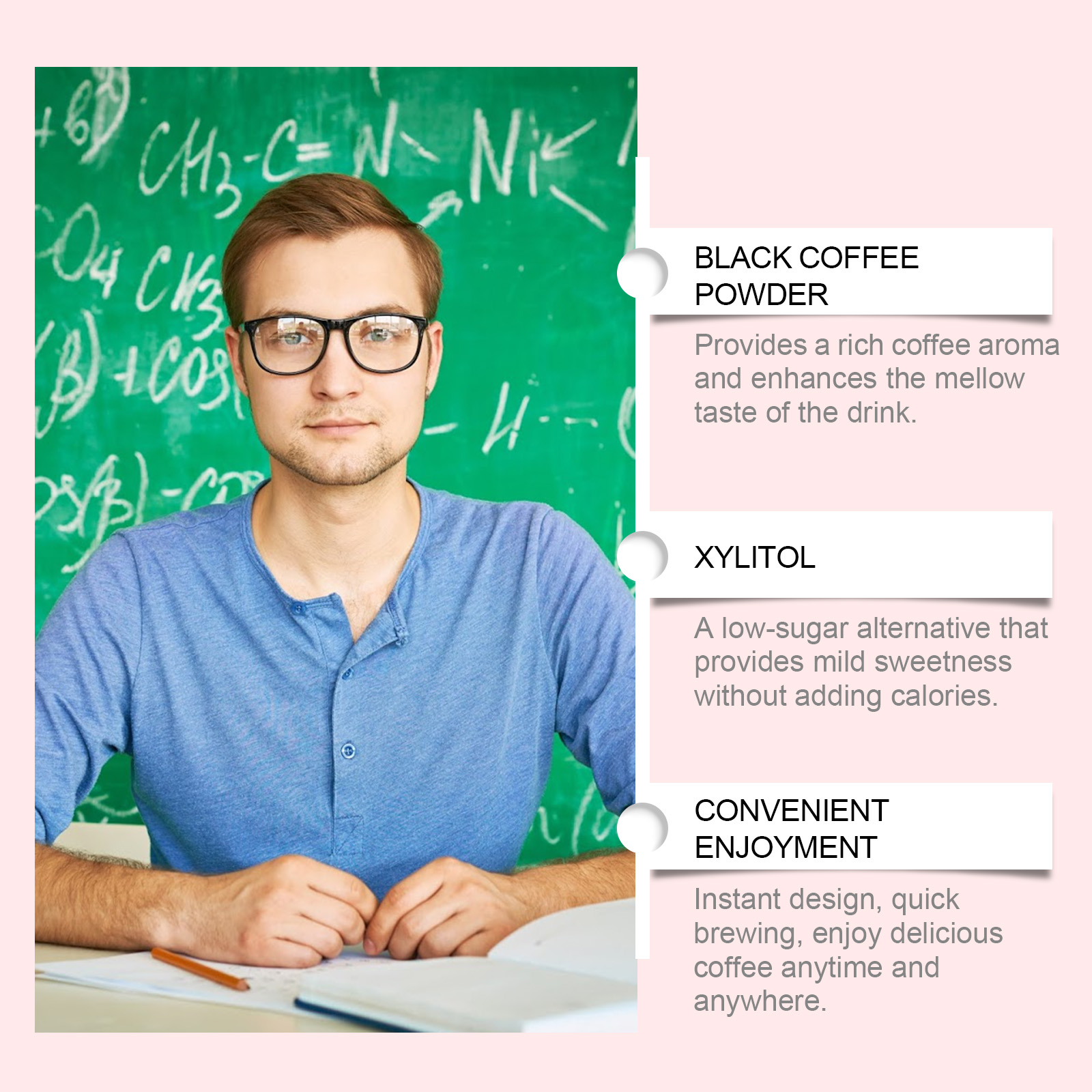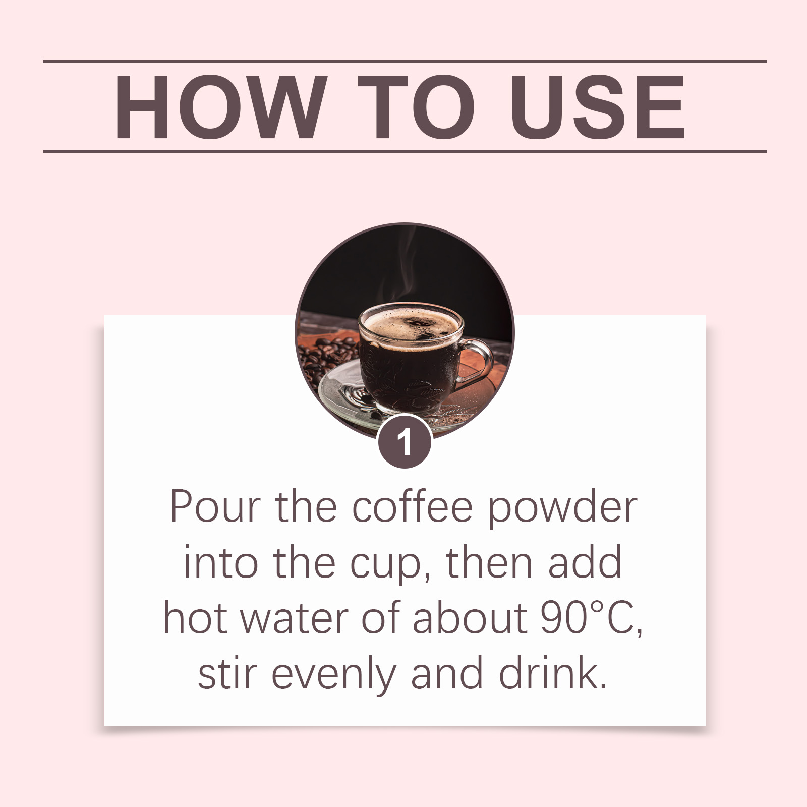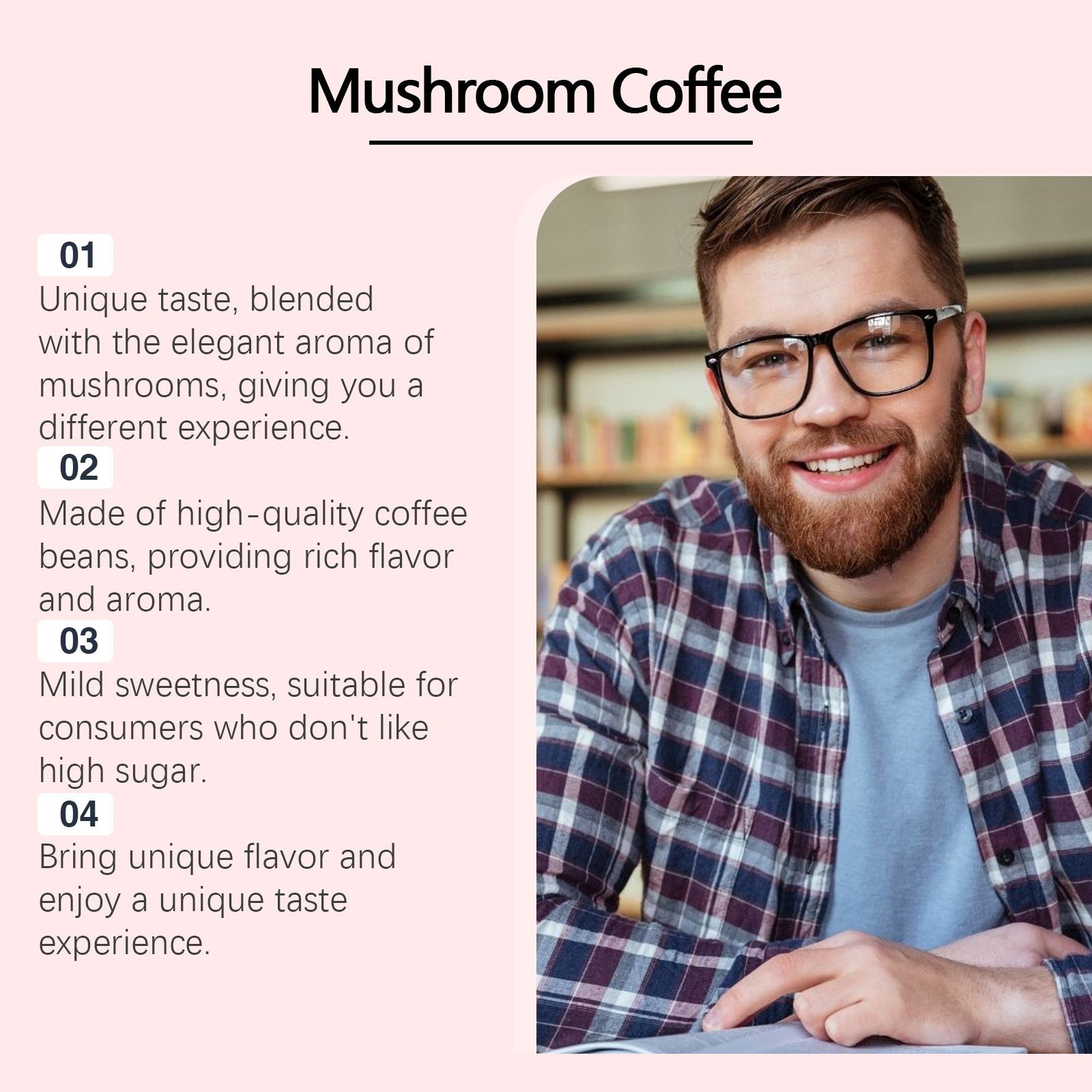 我们的蘑菇速溶咖啡含有黑咖啡粉、木糖醇。它可以代替传统糖,含糖量低,热量低:适合健康饮食。它的使用方法很简单:将咖啡粉倒入杯中,再加入约90°C的热水,搅拌均匀后即可饮用。并且可以提高注意力,增强精神活力。