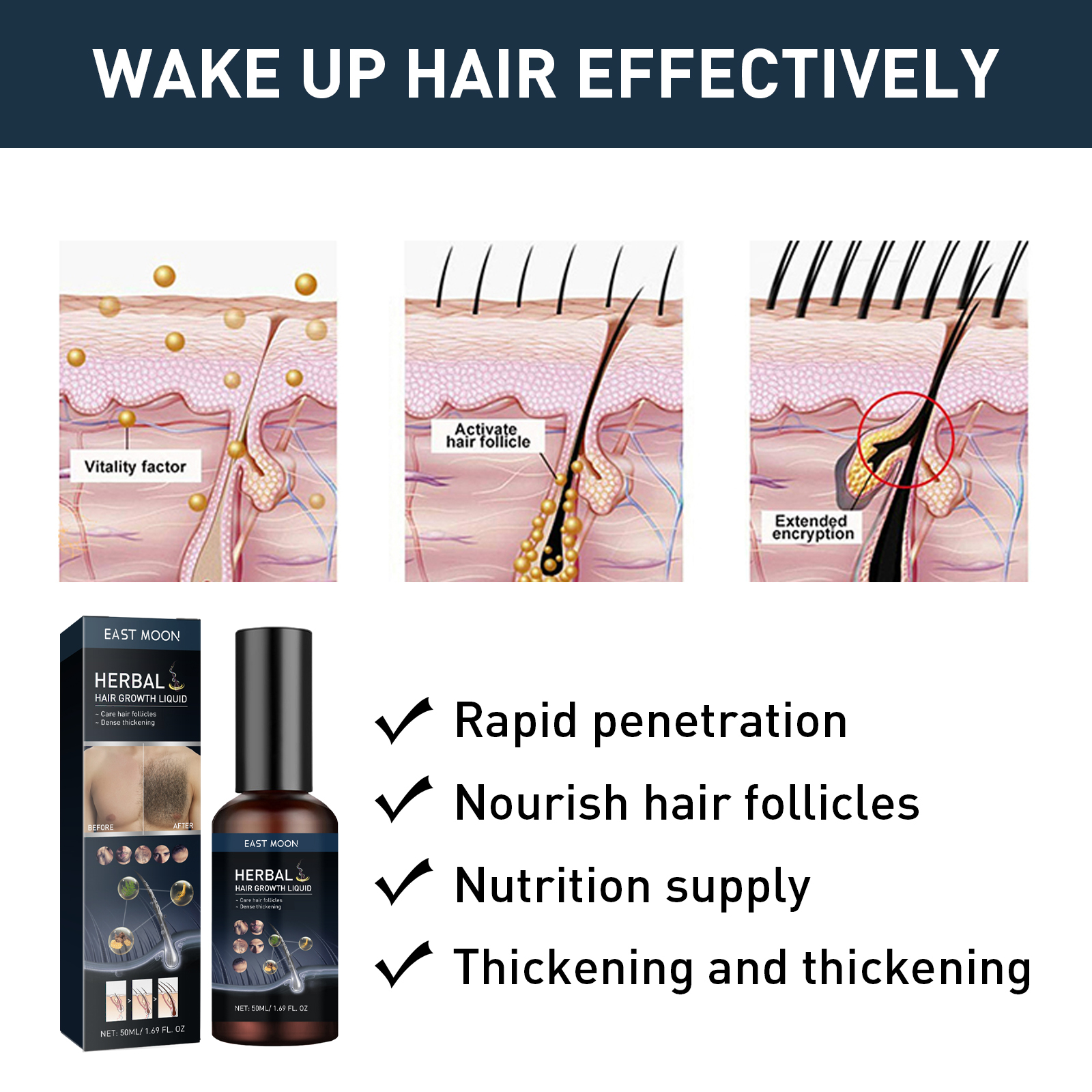 我们的体毛生长液含有侧柏提取物、何首乌提取物。它可以快速渗透滋养毛囊营养,使头发变得浓密。它的使用方法很简单:清洗和干燥所需的皮肤区域。取适量本品均匀涂抹于皮肤上。轻轻地做循环按摩以吸收。并且可以唤醒毛囊,强化发根 。