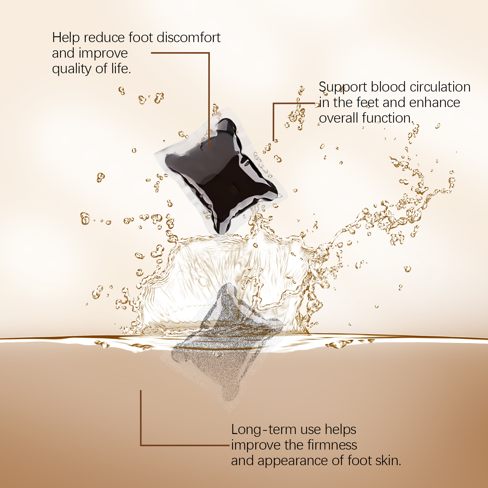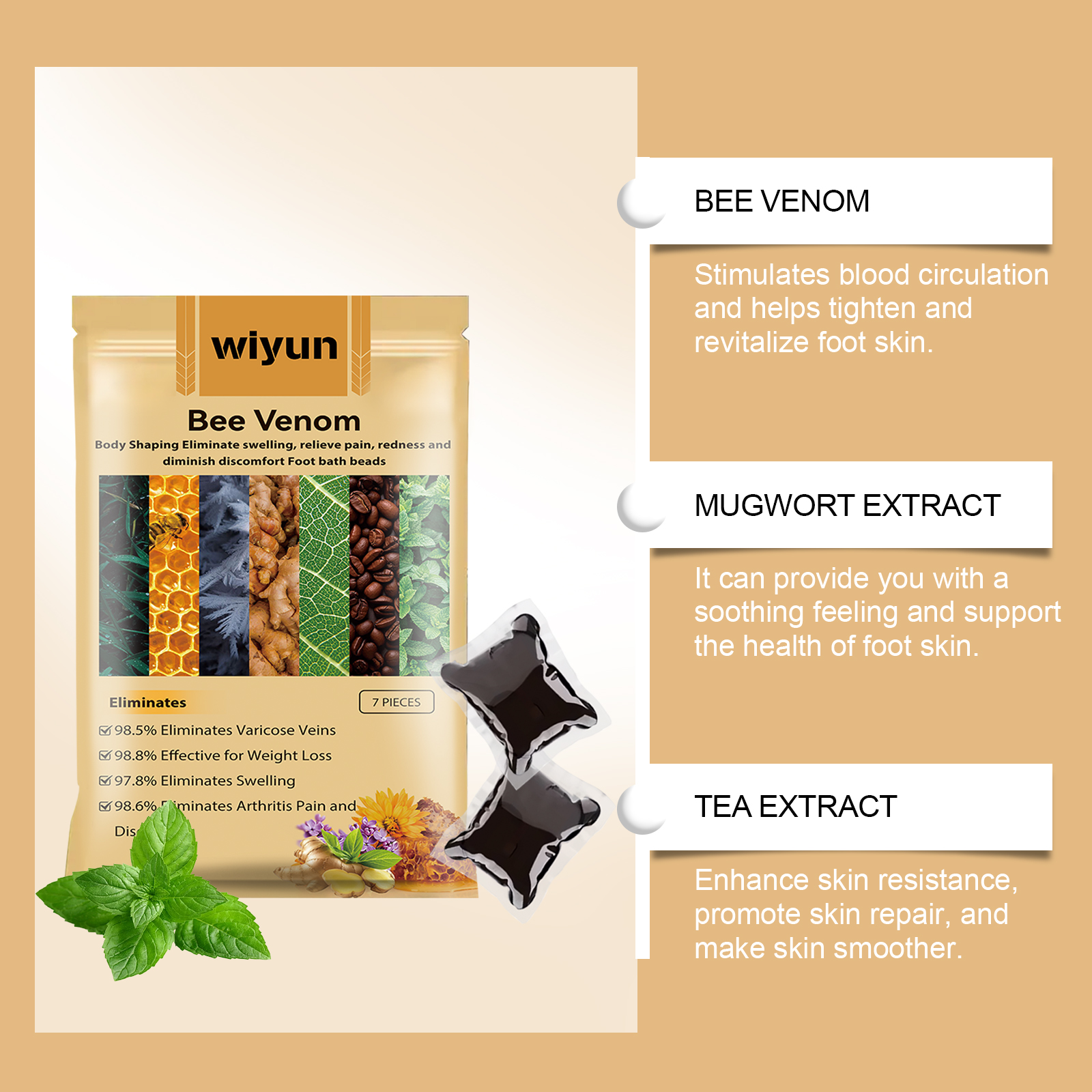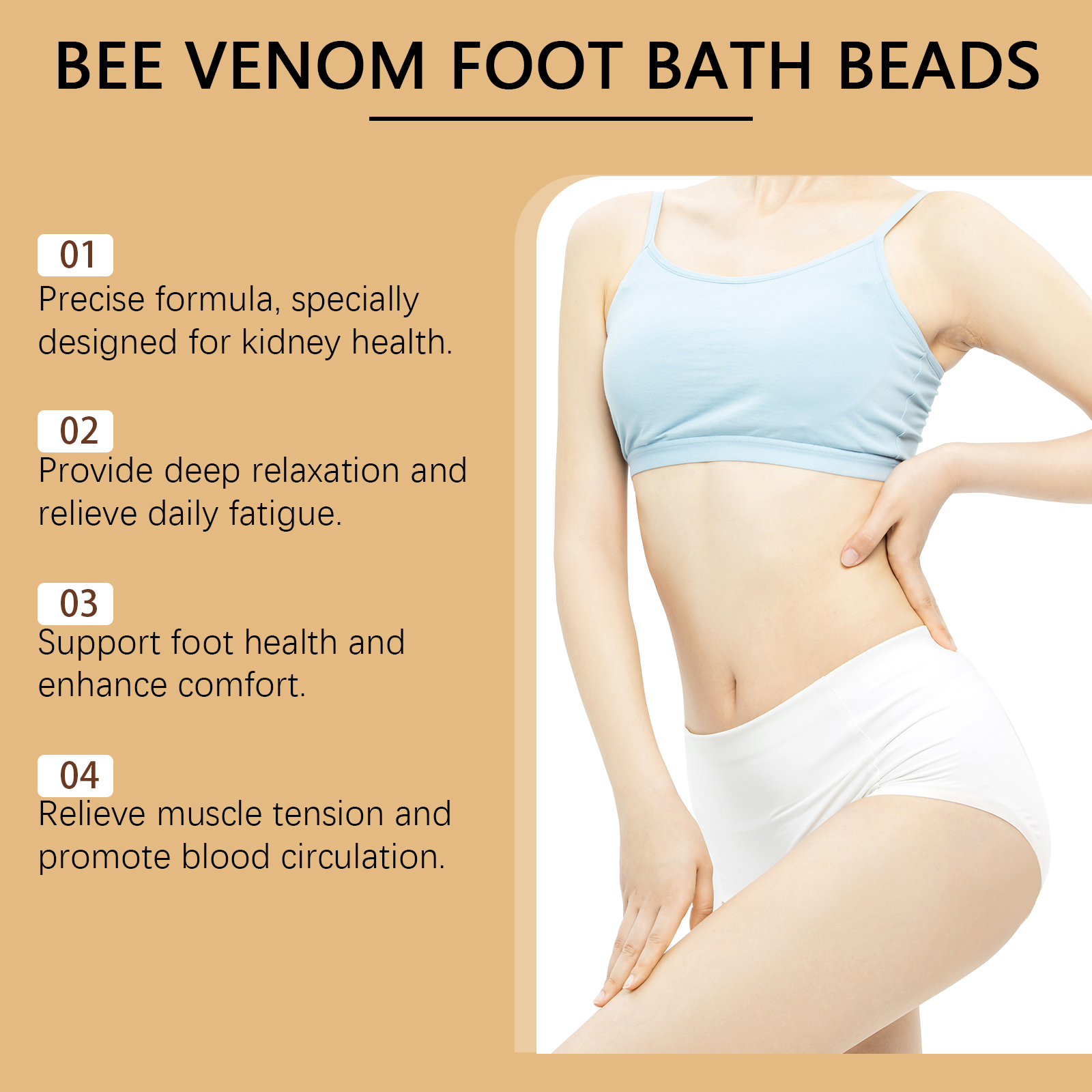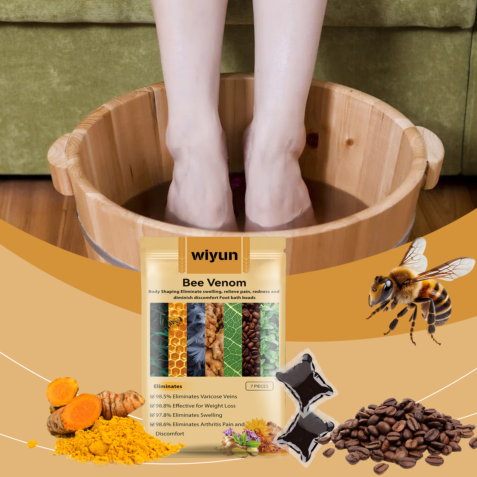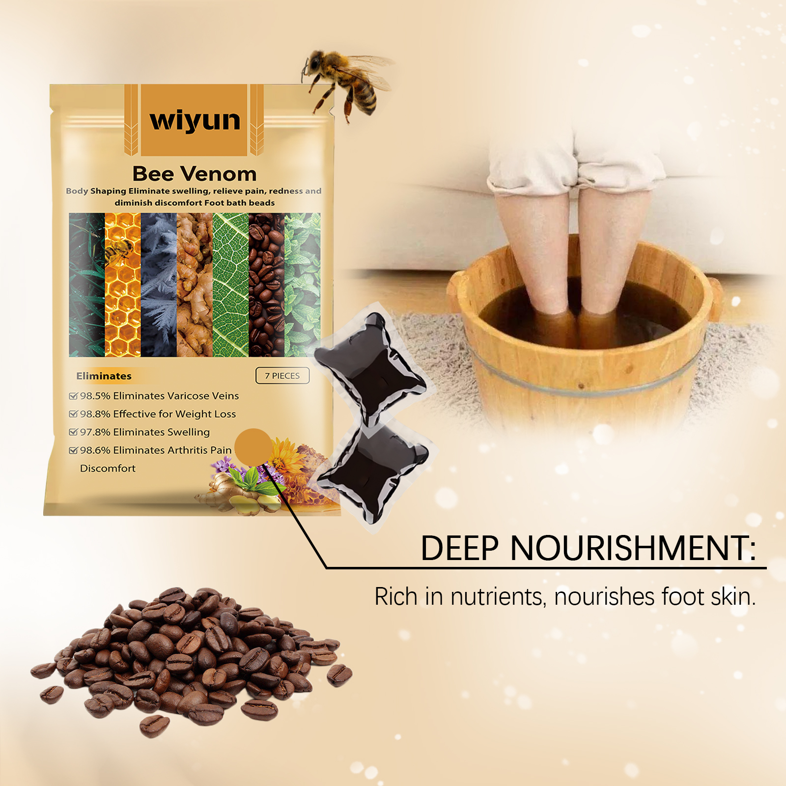 我们的蜂毒泡脚凝珠含有蜂毒、姜根提取物、绿茶提取物。它可以促进足部温暖,加速血液循环。瞬间降温,缓解足部疲劳。它的使用方法很简单:1.取出浴珠,将其溶解在温水中。2.混合均匀后,浸泡脚。3.浸泡15-30分钟。刺激血液循环,帮助紧致和活化足部皮肤。它能给你舒缓的感觉,支持足部皮肤的健康。增强肌肤抵抗力,促进肌肤修复,令肌肤更光滑。