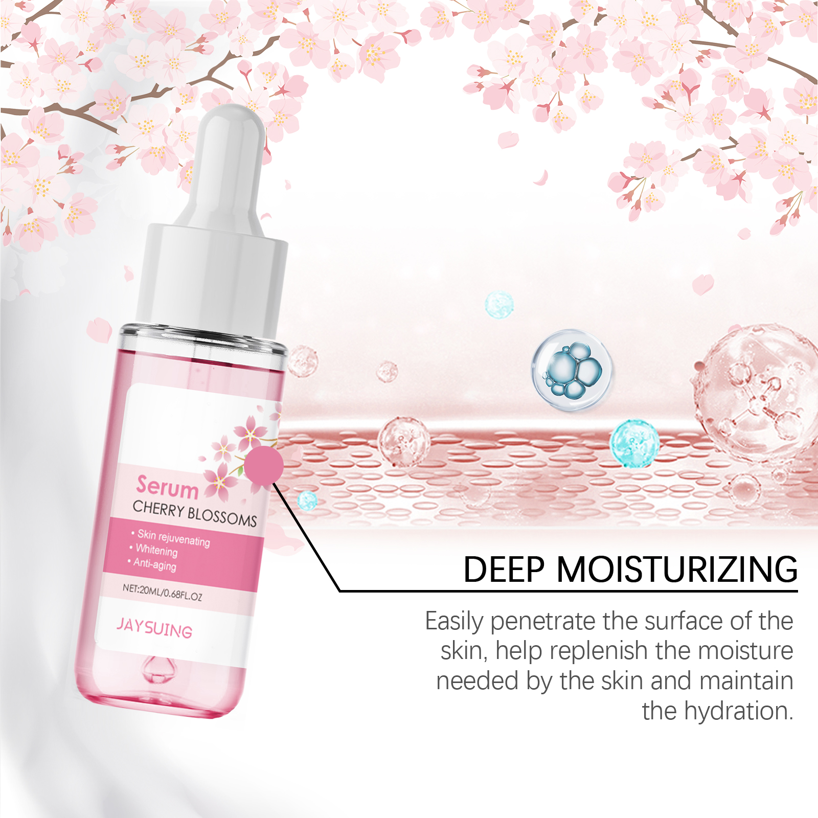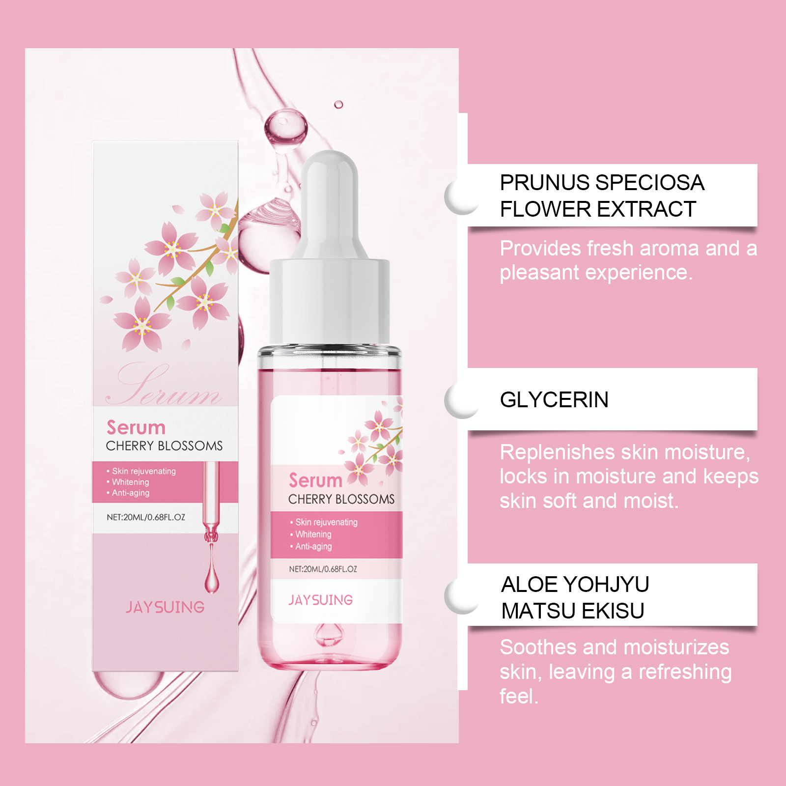 我们的樱花水润精华液含有樱花提取物、甘油、生育酚。它可以迅速渗透肌肤,帮助肌肤恢复水分平衡,使肌肤水润光滑。它的使用方法很简单:1.使用前用温水清洁皮肤。2.取适量本品滴于额头、面颊、下巴和鼻子处。3.从内到外轻拍或按摩直至吸收。经常使用有助于改善暗沉的皮肤,并保持柔软和明亮。易于渗透肌肤表层,帮助补充肌肤所需的水分,保持肌肤水分。