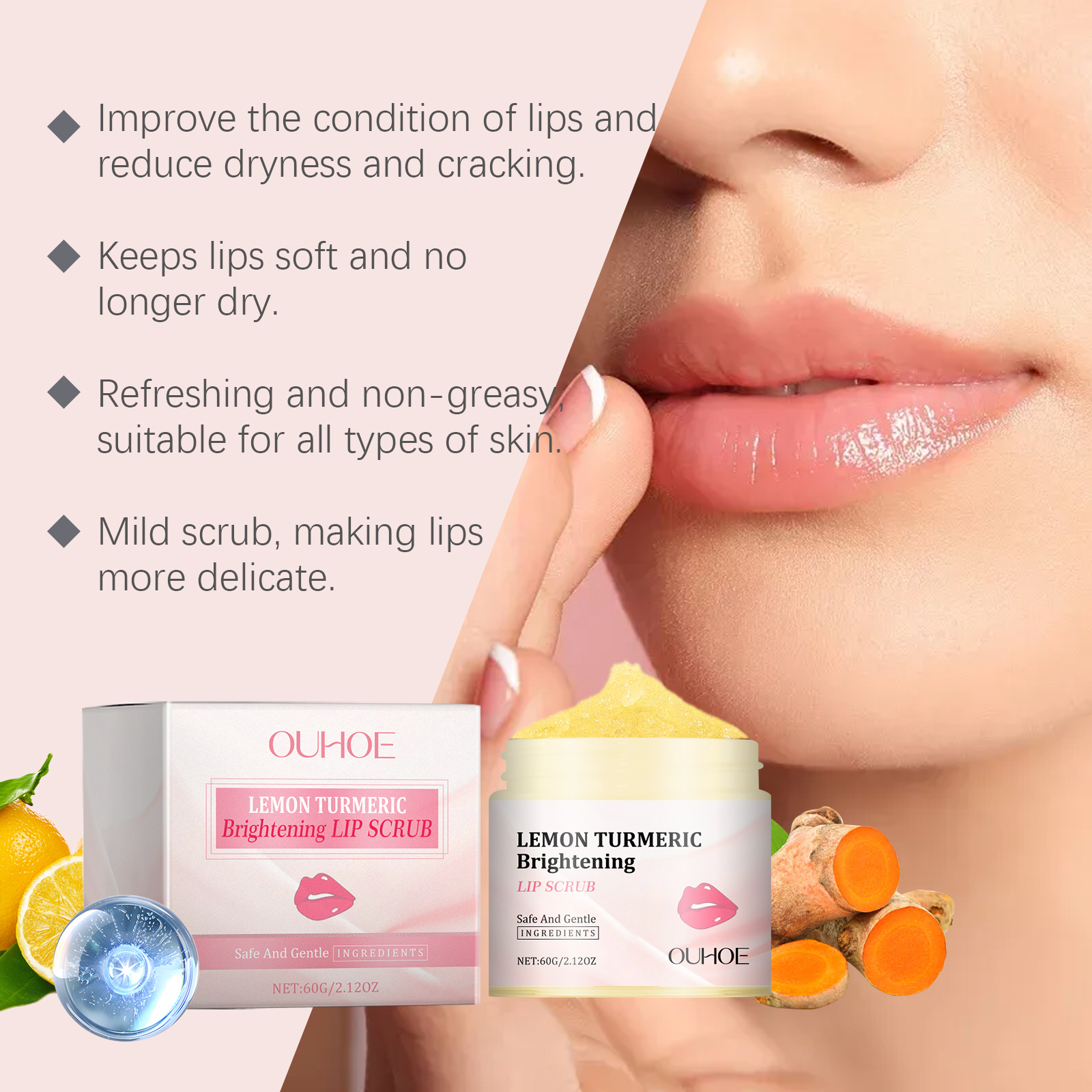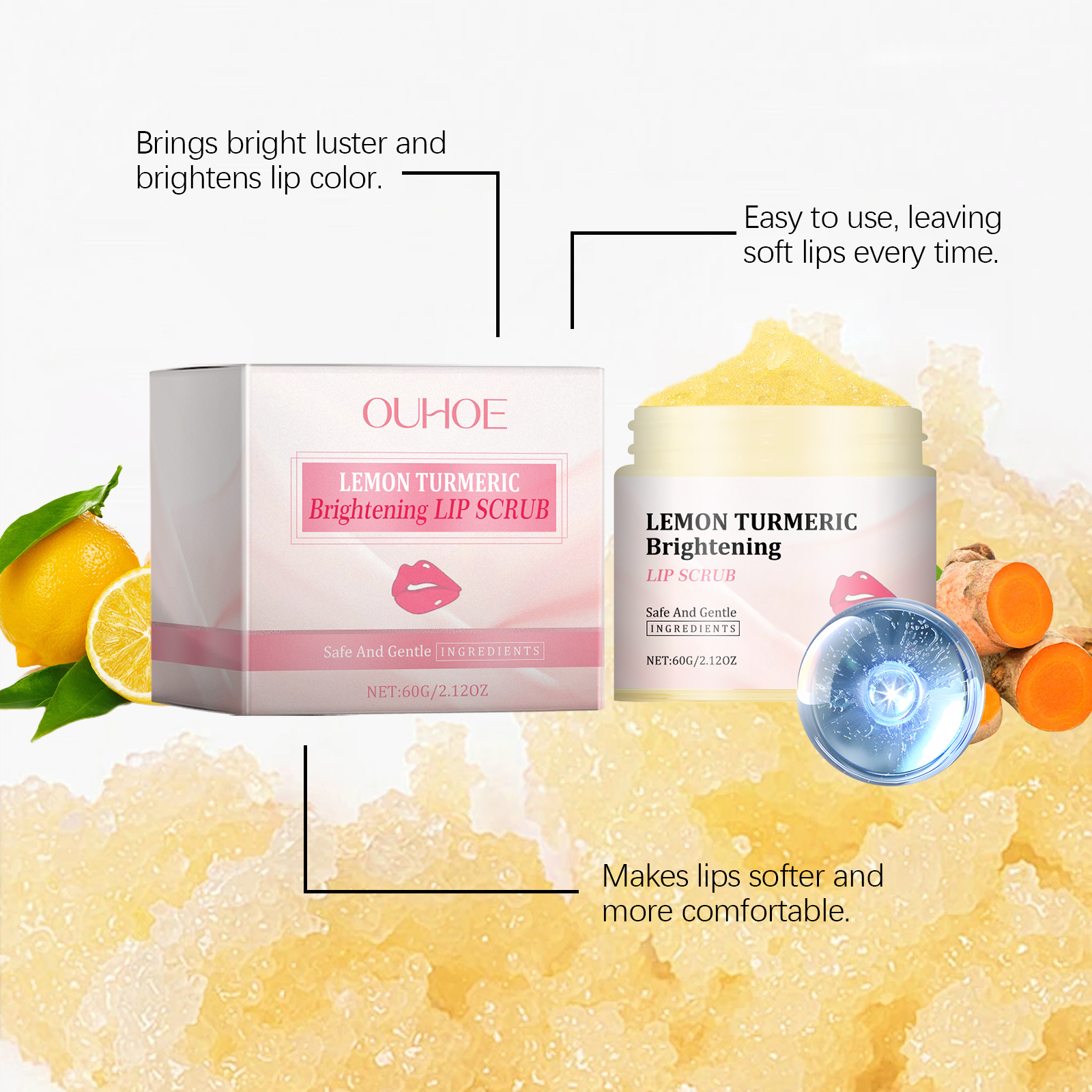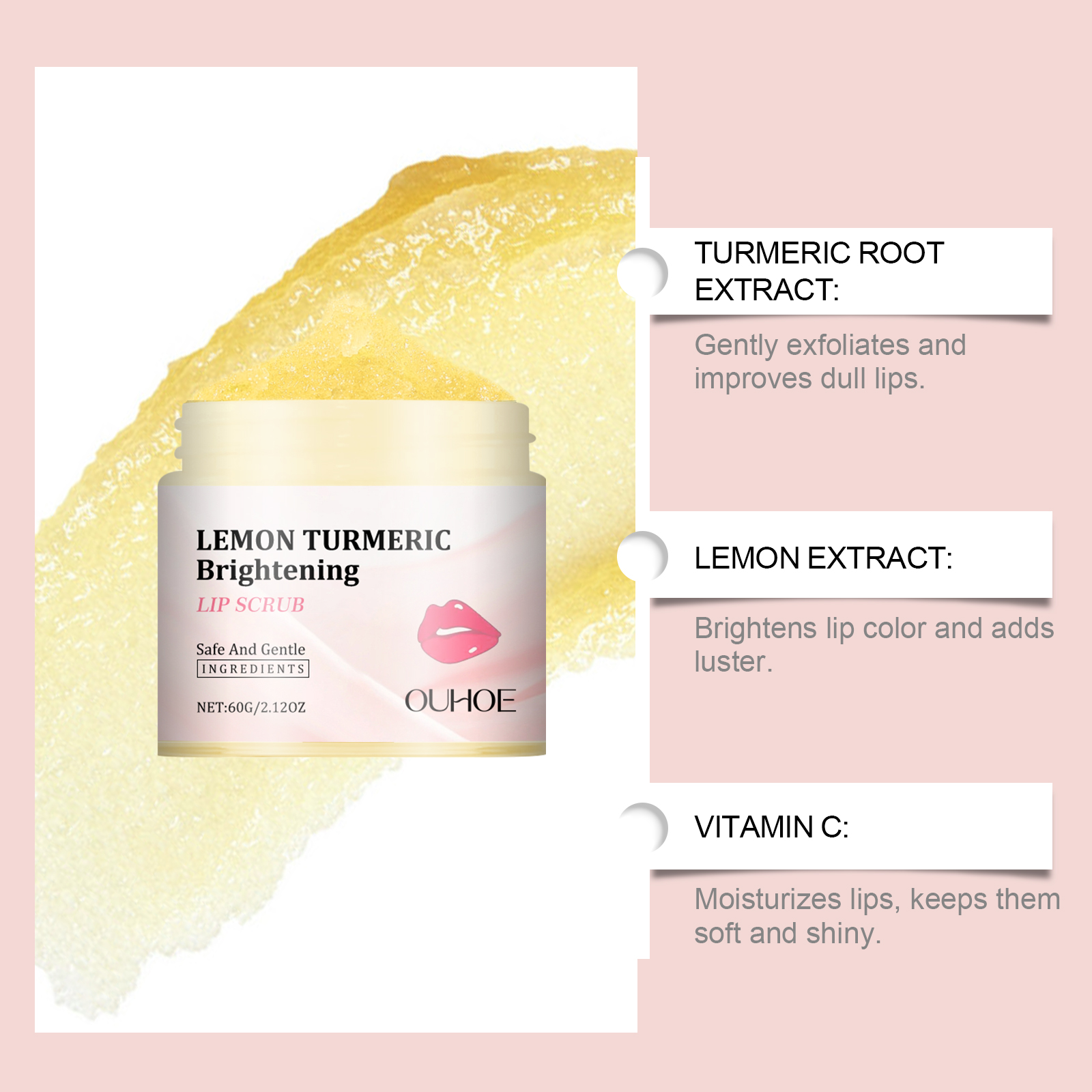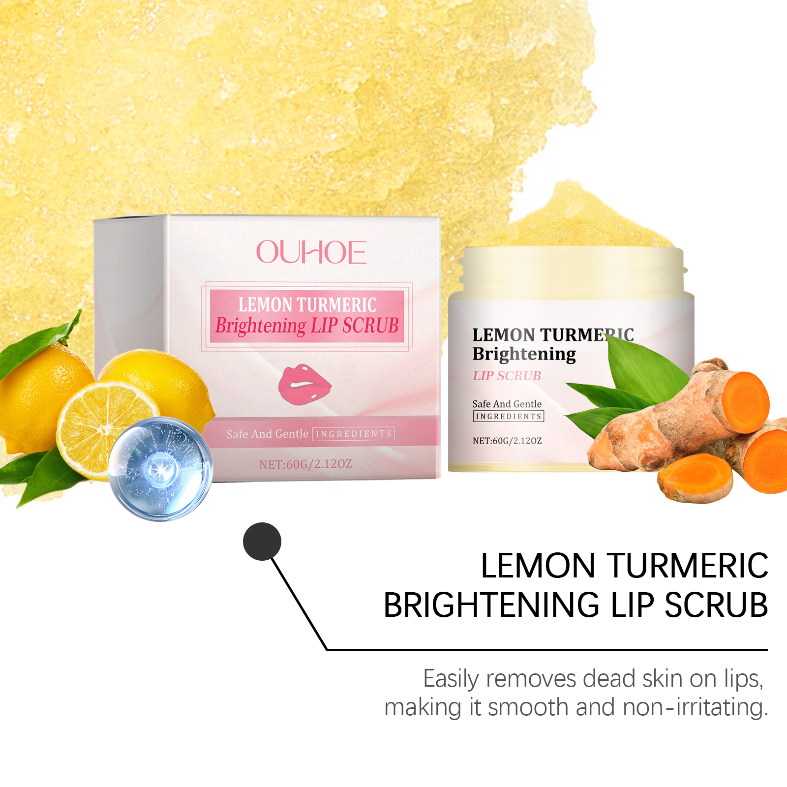 我们的姜黄唇部磨砂膏含有甘油、姜黄根提取物、柠檬提取物。它可以改善暗哑的嘴唇,让嘴唇更亮。轻松去除唇部死皮,保持柔滑触感。它的使用方法很简单:用清水洗嘴唇,然后把嘴唇擦干。取适量本品均匀涂抹于唇部,打圈按摩1-2分钟。用清水洗净即可。并且可以清爽配方使双唇保持水分。