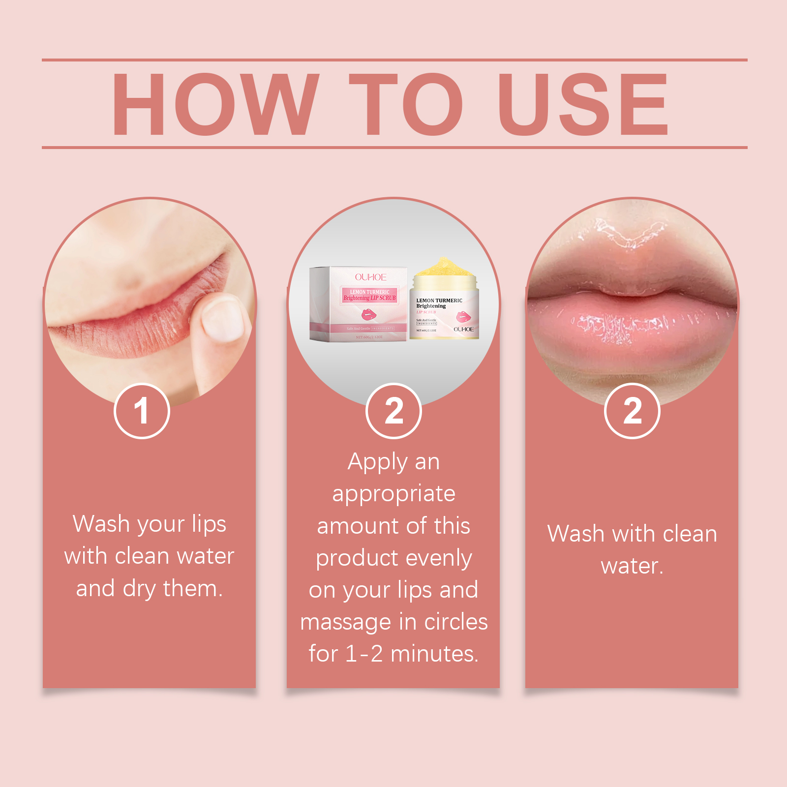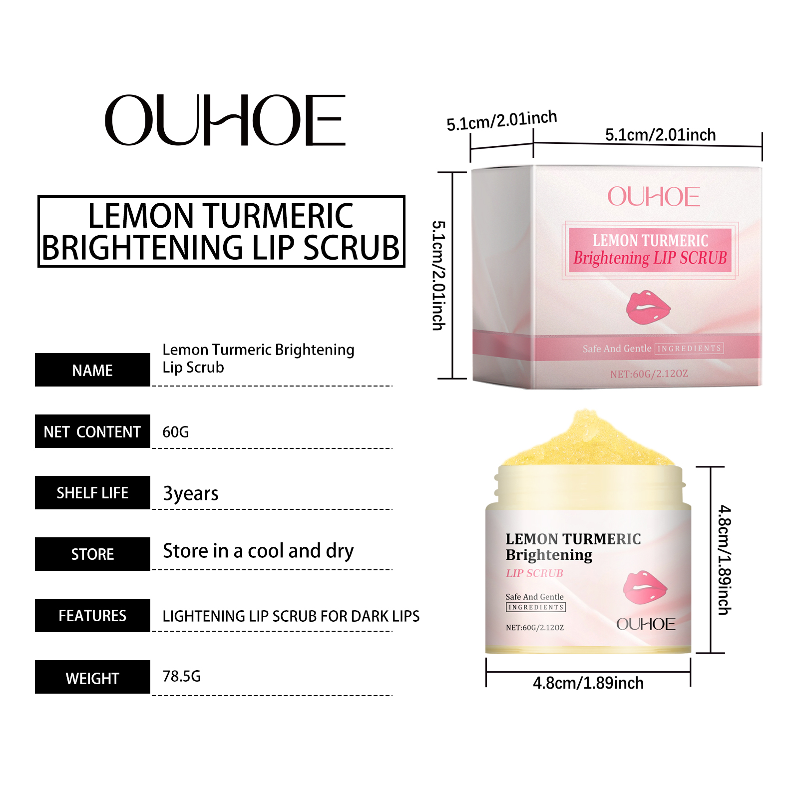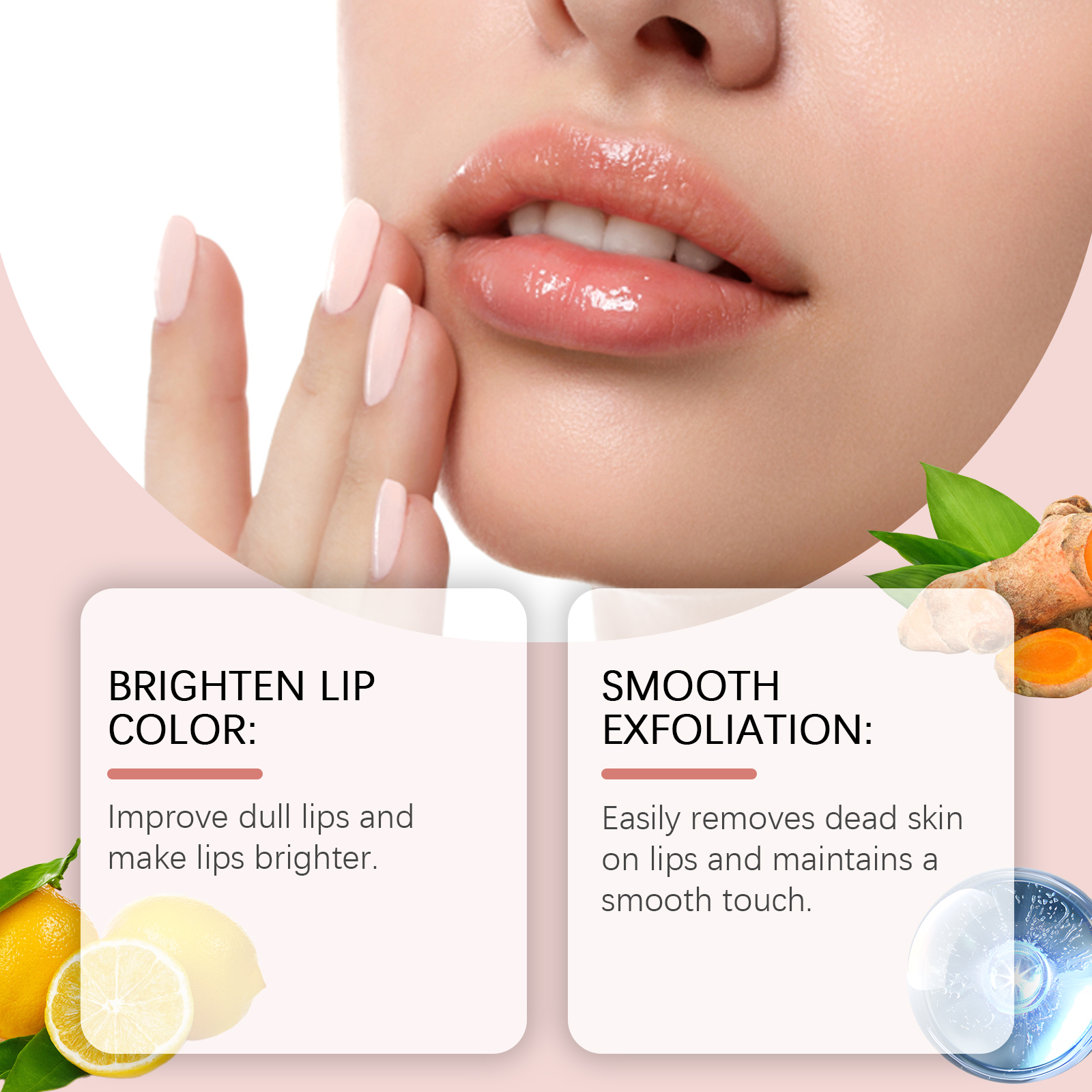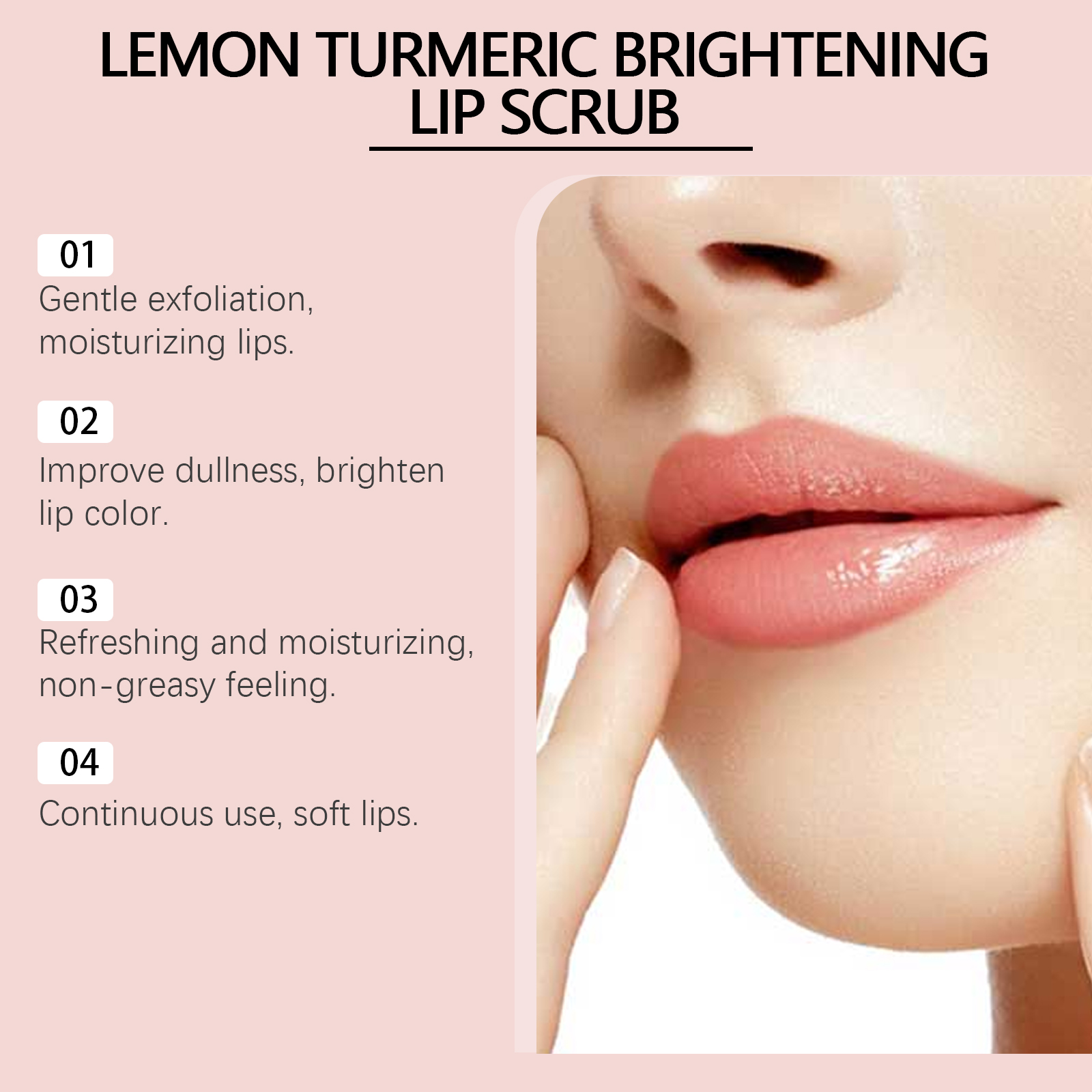 我们的姜黄唇部磨砂膏含有甘油、姜黄根提取物、柠檬提取物。它可以改善暗哑的嘴唇,让嘴唇更亮。轻松去除唇部死皮,保持柔滑触感。它的使用方法很简单:用清水洗嘴唇,然后把嘴唇擦干。取适量本品均匀涂抹于唇部,打圈按摩1-2分钟。用清水洗净即可。并且可以清爽配方使双唇保持水分。