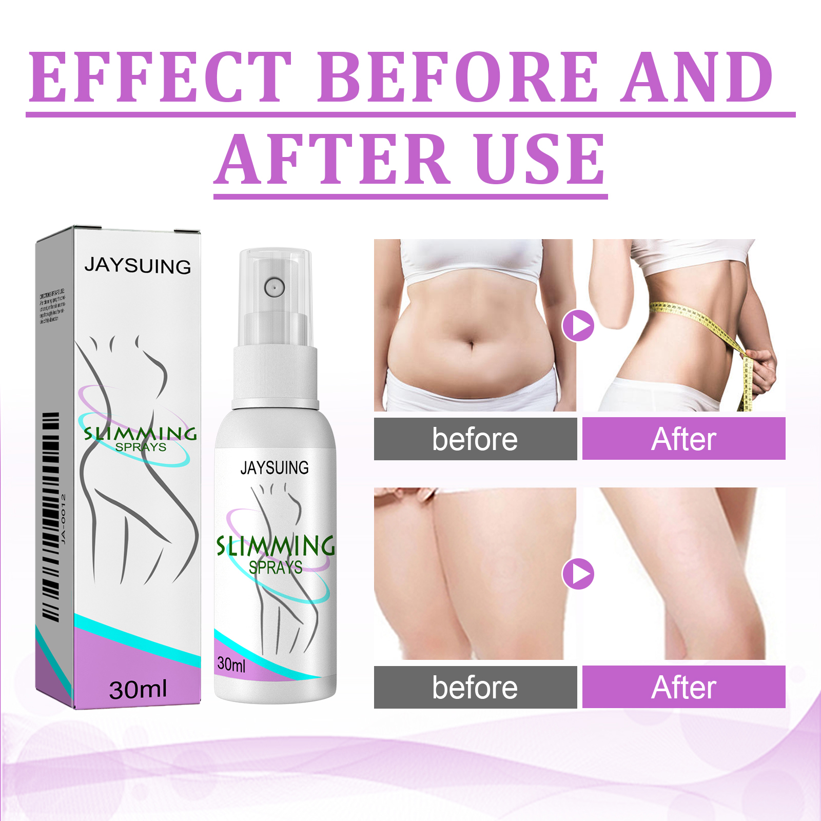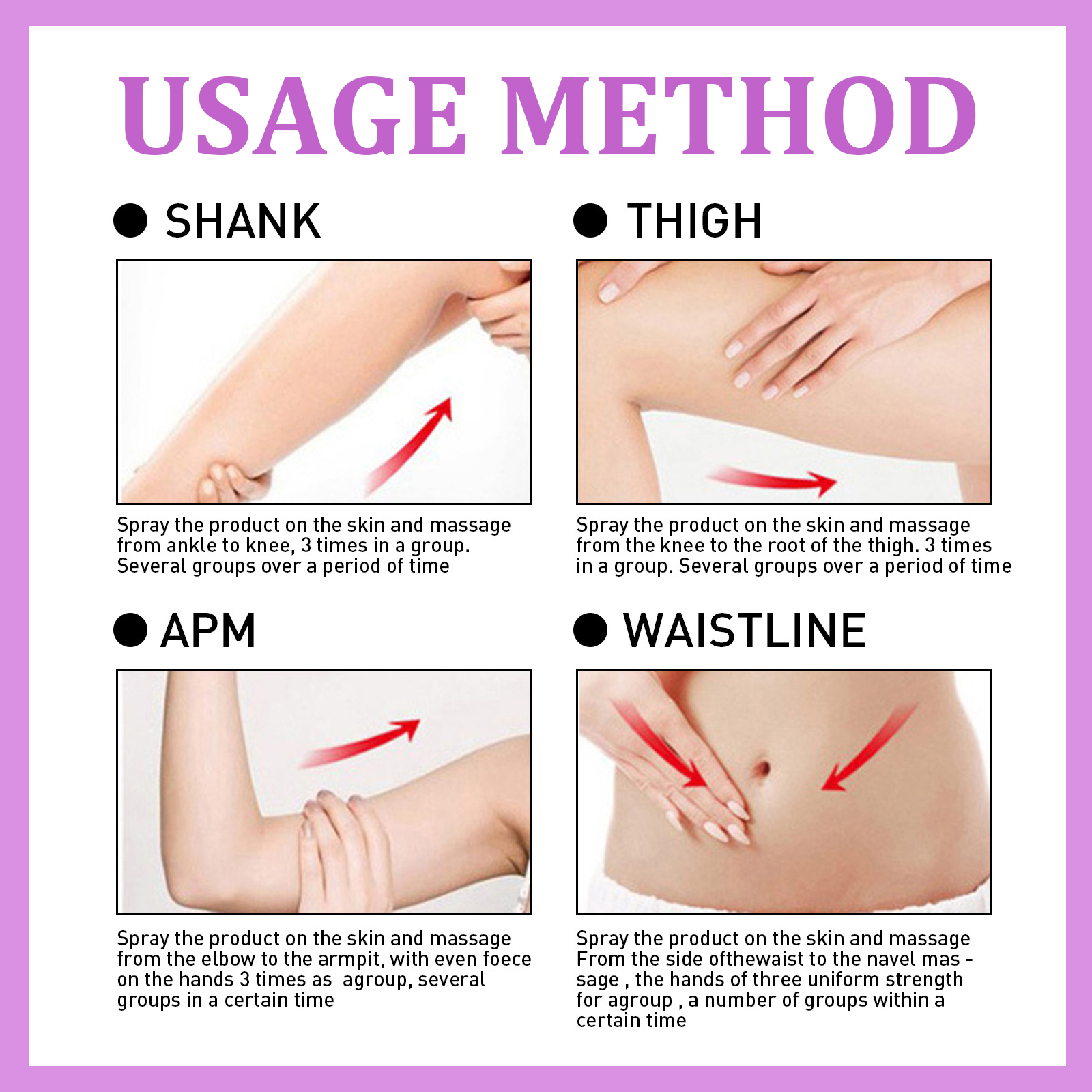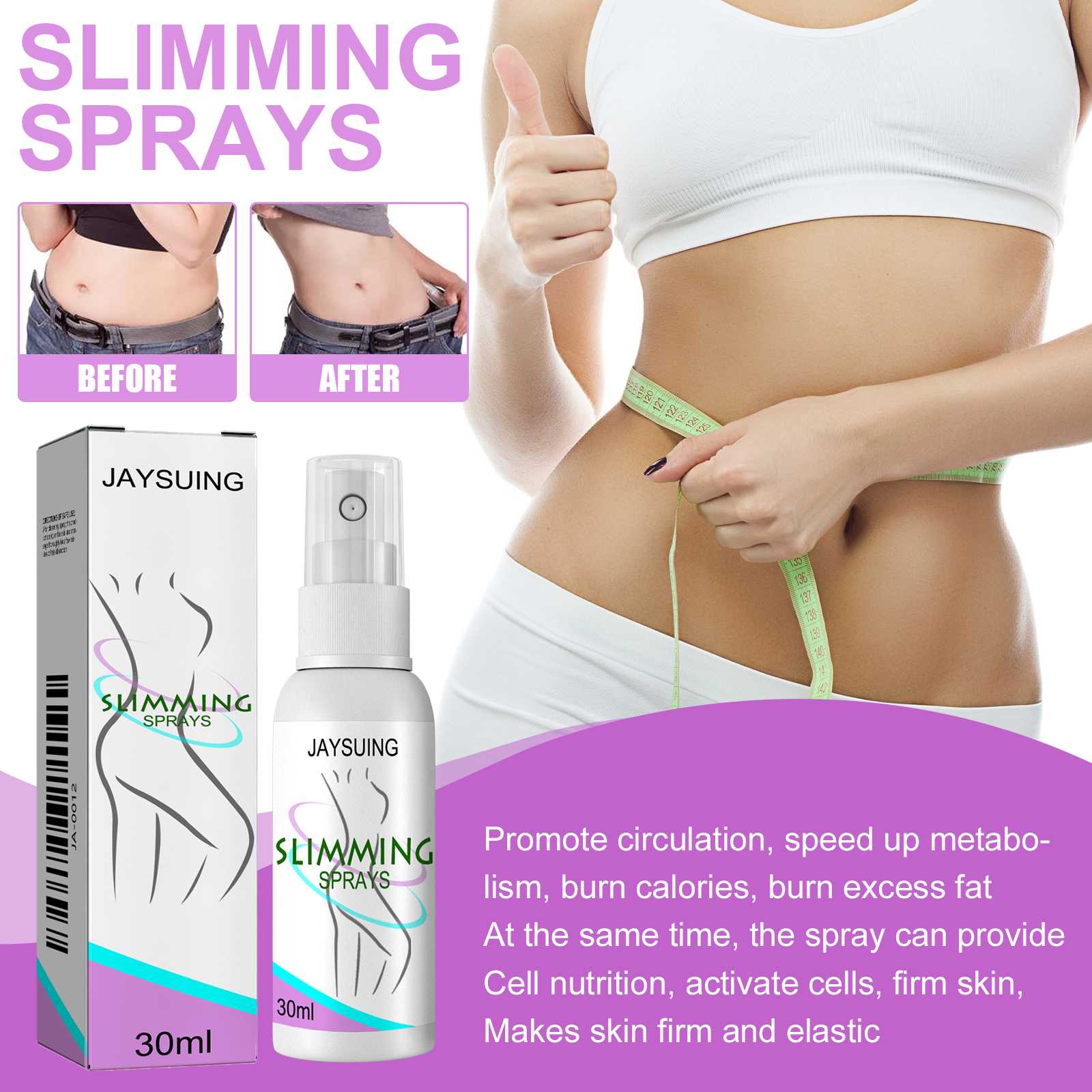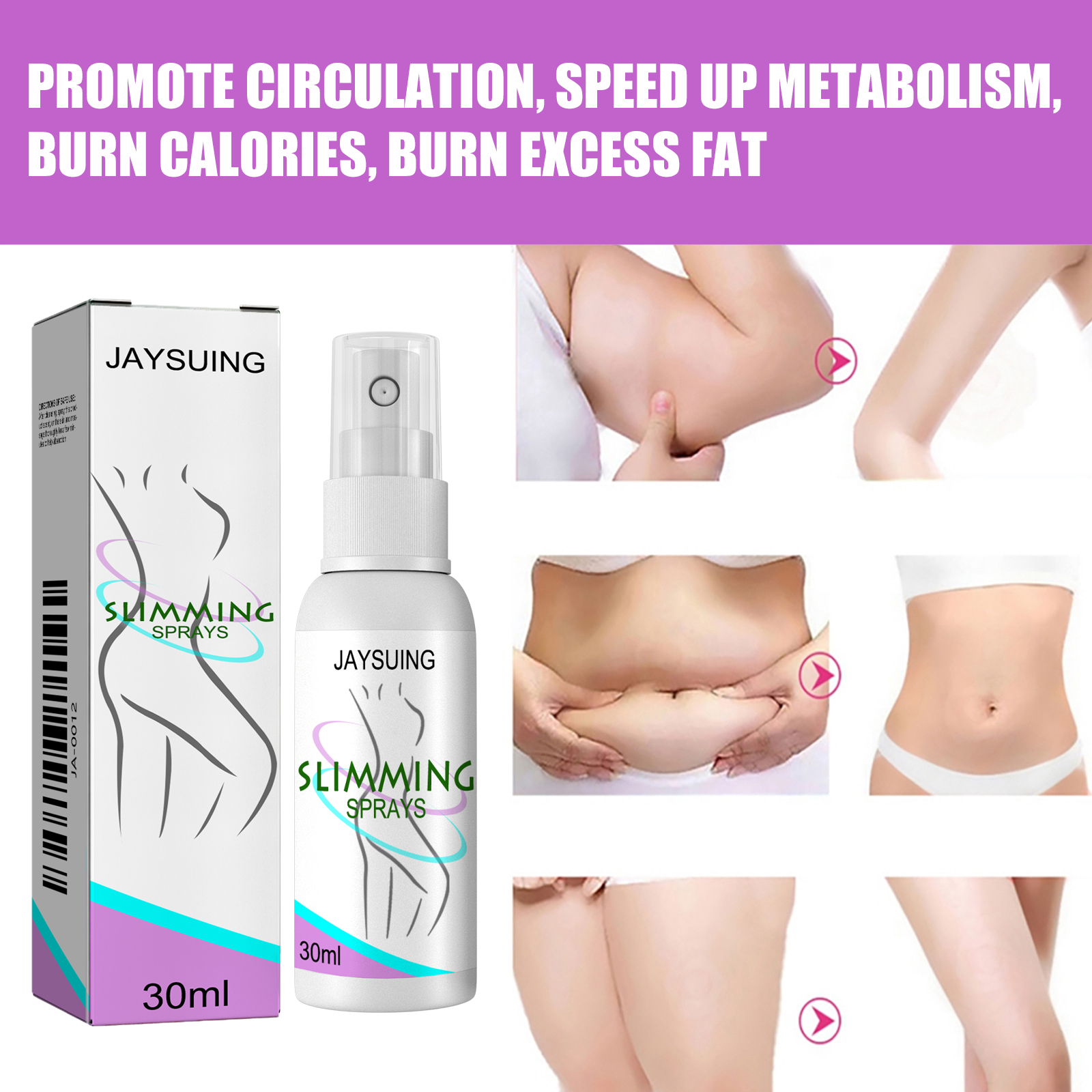 我们的塑身喷雾含有甘油、羟乙基纤维素。它可以促进血液循环,加快新陈代谢,燃烧卡路里,燃烧多余脂肪同时,喷雾可以提供细胞营养,活化细胞,紧致肌肤使皮肤紧致有弹性。它的使用方法很简单:小腿,将本品喷在皮肤上,从脚踝按摩到膝盖。一组3次。在一段时间内分成几个小组;大腿,将本品喷于皮肤上,从膝盖按摩至大腿根部。一组3次。在一段时间内分成几个小组;手臂,将本品喷于皮肤上,从肘部至腋窝处按摩,双手均匀用力3次为一组,分几组在一定时间内按摩;腰围,将本品喷在皮肤上按摩,从腰部侧面到肚脐按摩,双手三次均匀用力为一组,一定时间内多次按摩。促进血液循环,加快新陈代谢,燃烧卡路里,燃烧多余的脂肪。