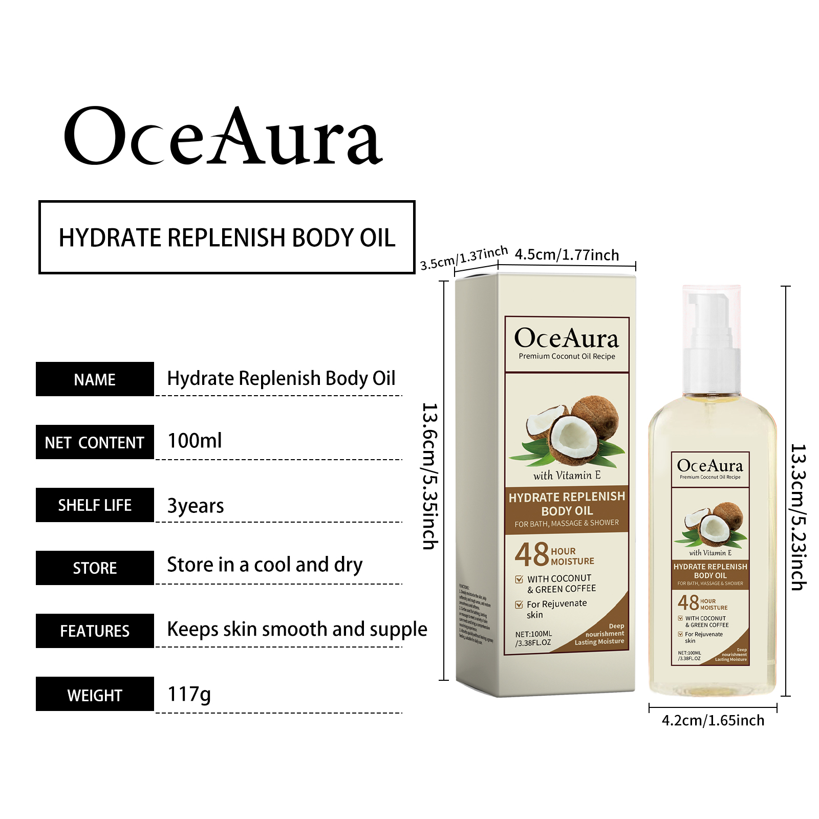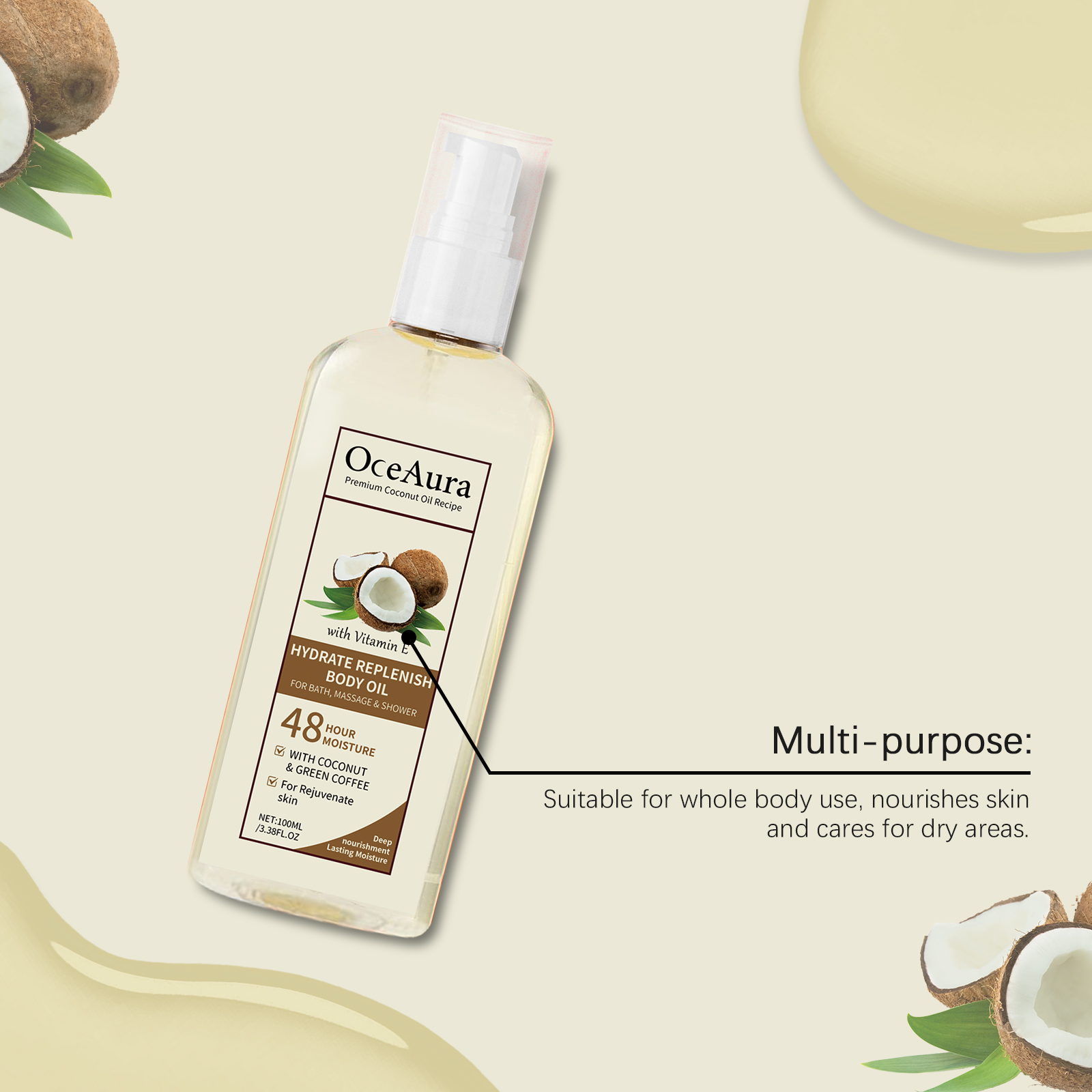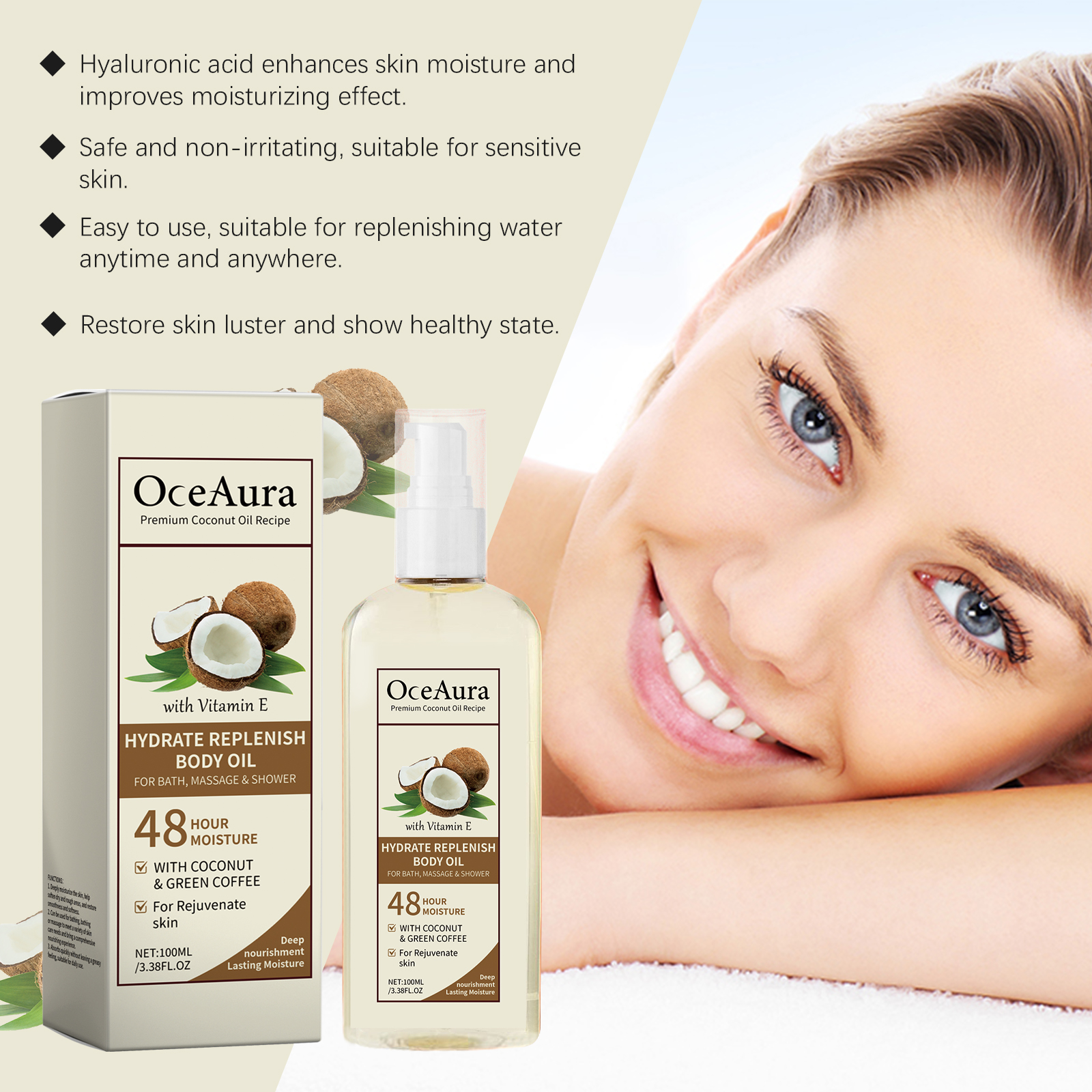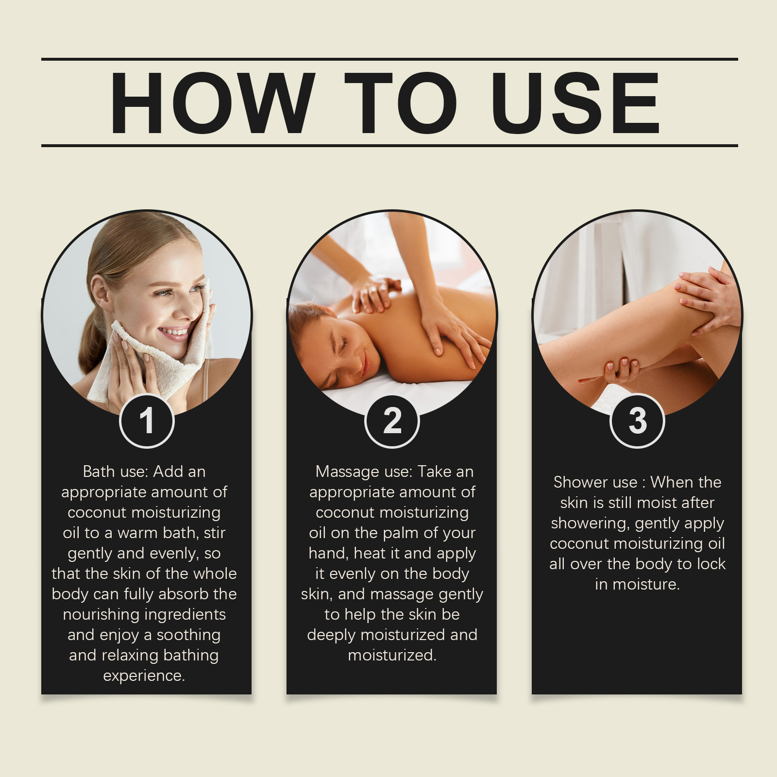 我们的椰子润肤油含有霍霍巴籽油、椰子油。它可以有效滋养并保持皮肤滋润。吸收迅速不留油腻感,适合日常使用。它的使用方法很简单:沐浴使用:在温水中加入适量的椰子保湿油,轻轻均匀搅拌,使全身皮肤能够充分吸收滋养成分,享受舒缓放松的沐浴体验。按摩使用:取适量椰子保湿油在手心,温热后均匀涂抹于身体肌肤,轻轻按摩帮助肌肤深层滋润保湿;沐浴用法:沐浴后皮肤还湿润时,轻柔地在全身涂抹椰子保湿油,锁住水分。并且可以咖啡萃取物和维生素E有助于抵抗自由基,延缓衰老。