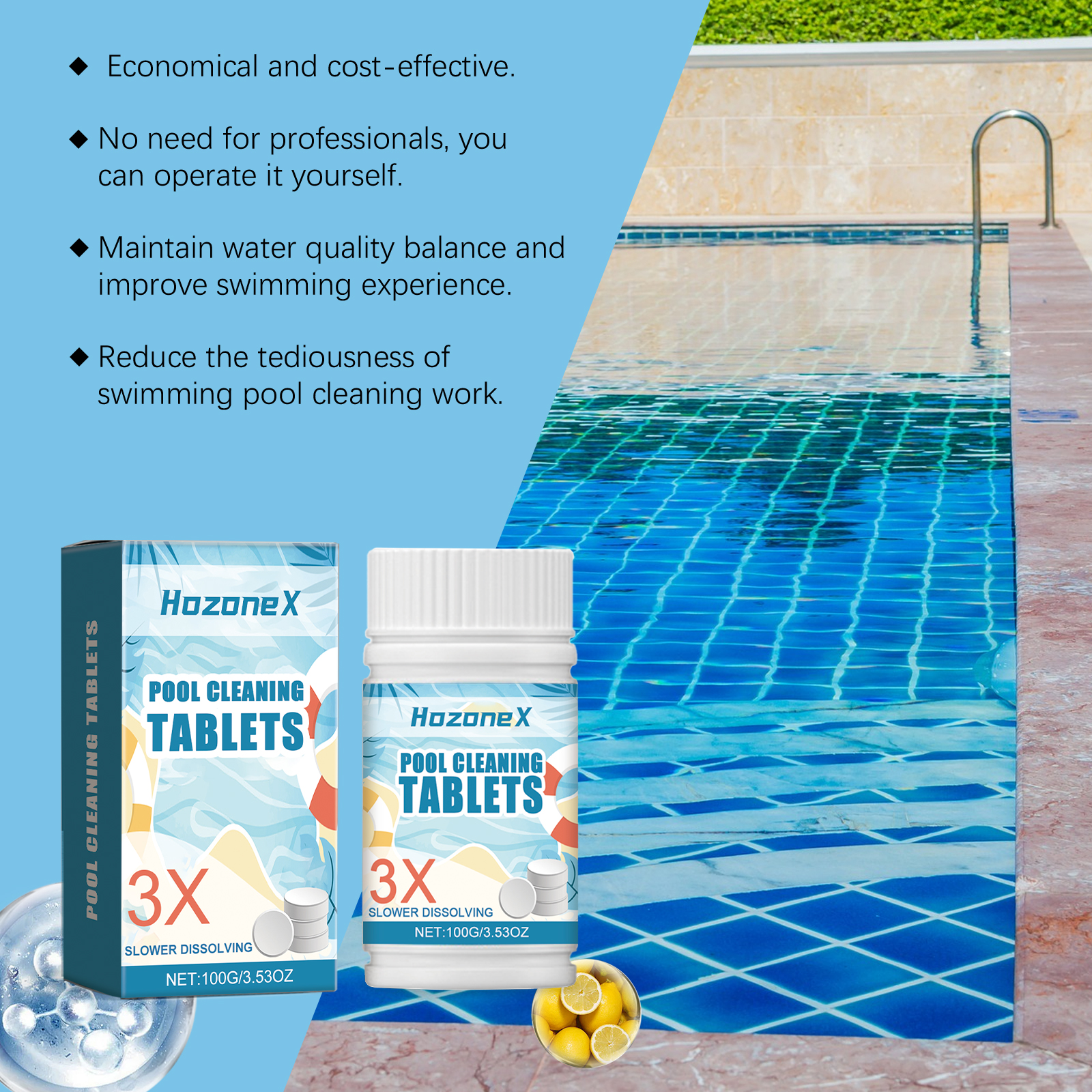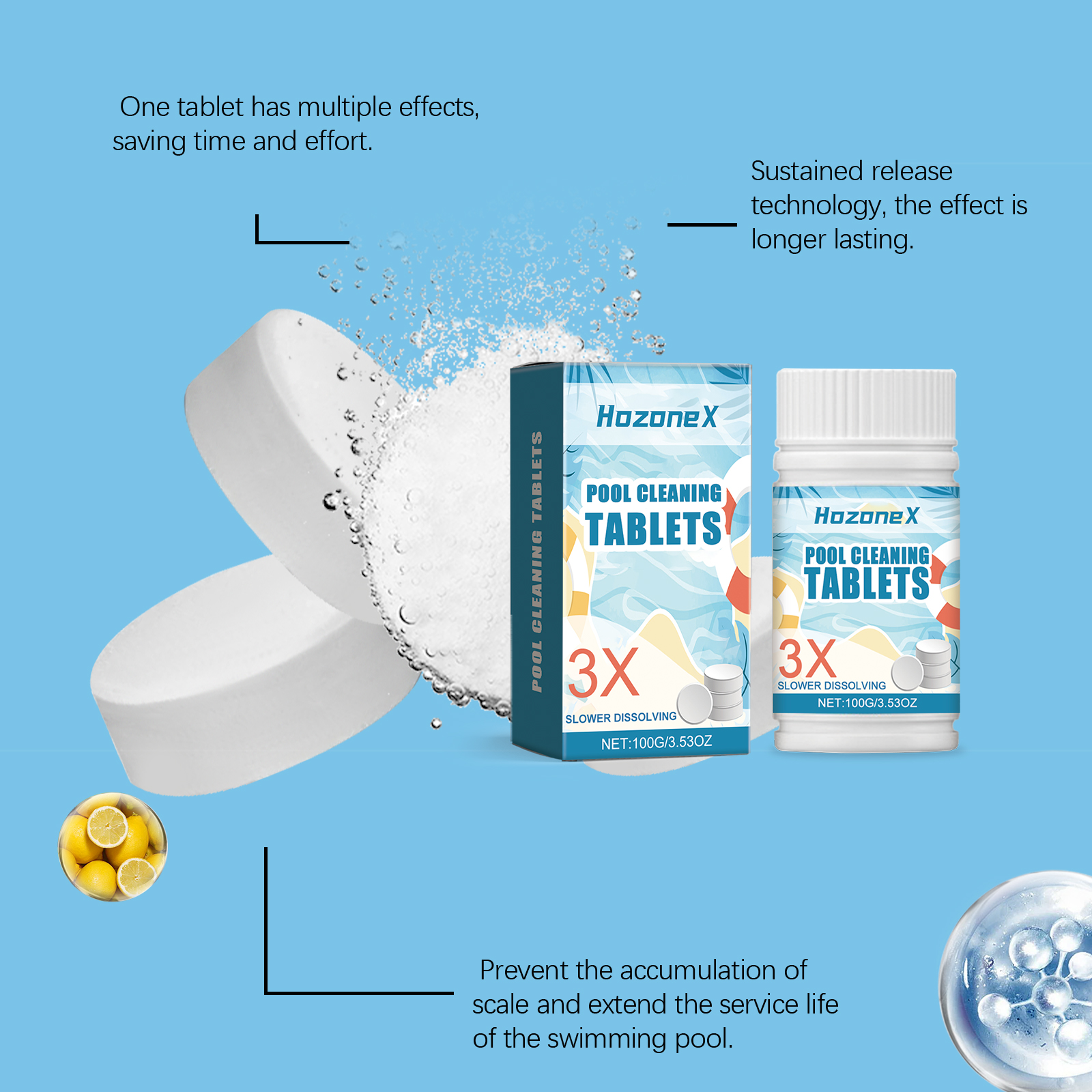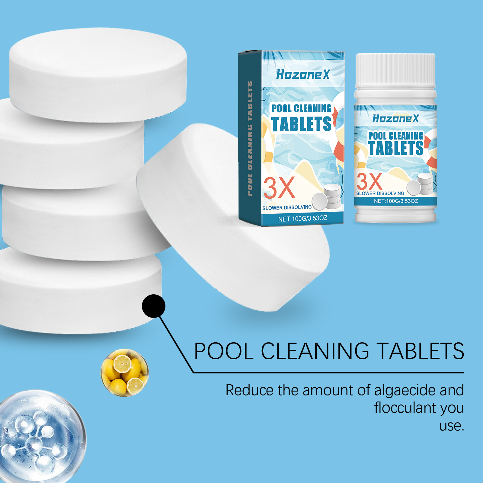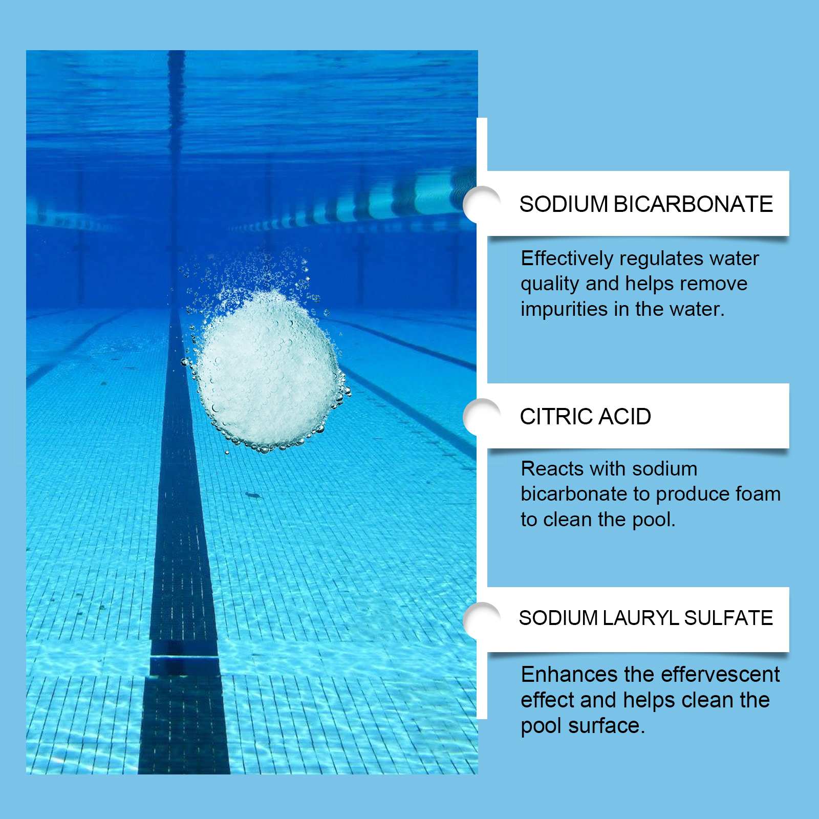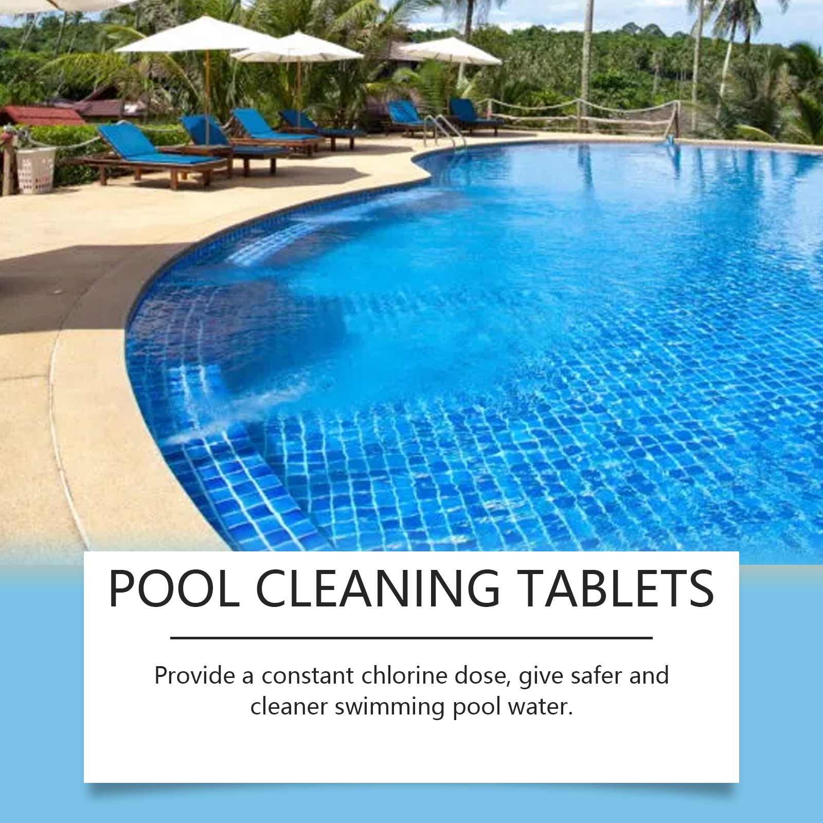 我们的泳池清洁泡腾片含有十二烷基苯磺酸钠、EDTA 二钠。它可以保持泳池水的清洁和新鲜,更愉快的游泳空间。它的使用方法很简单:直接放入水中或用加药装置放入水中,使其慢慢溶解。并且可以澄清水质,使用方便。