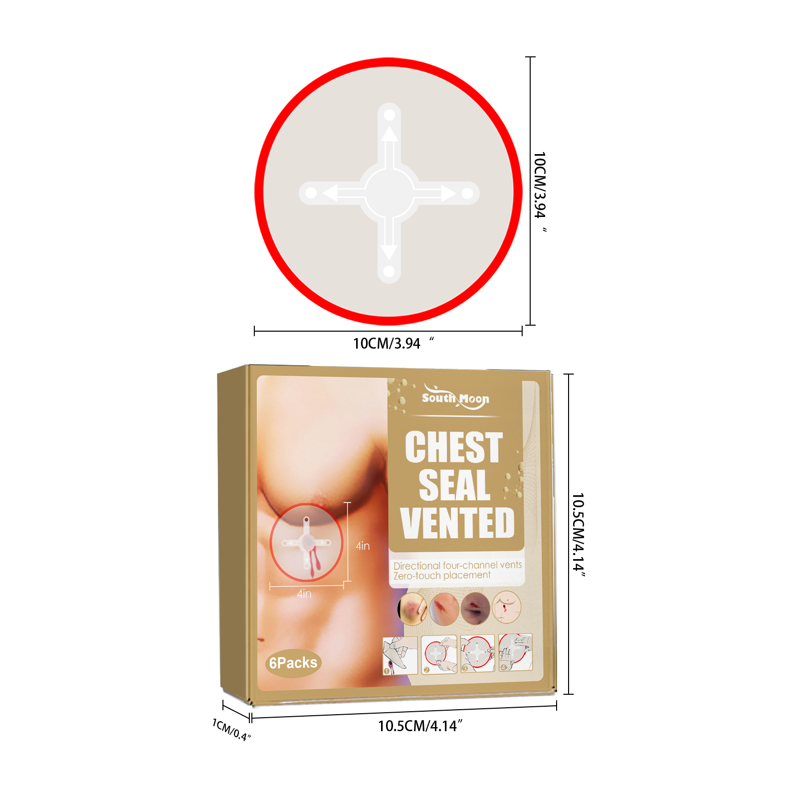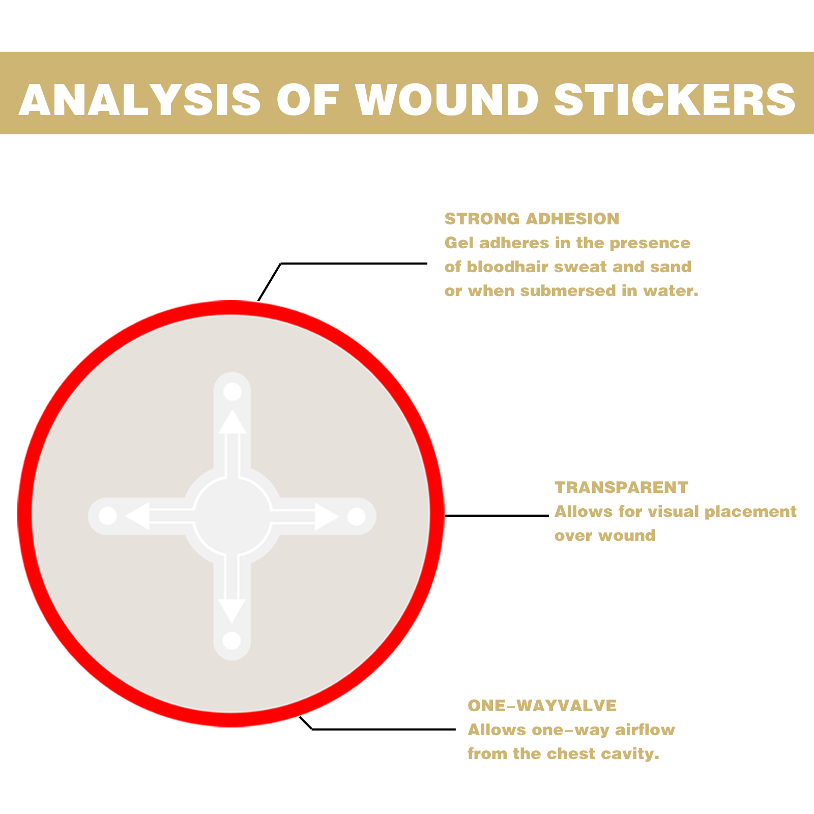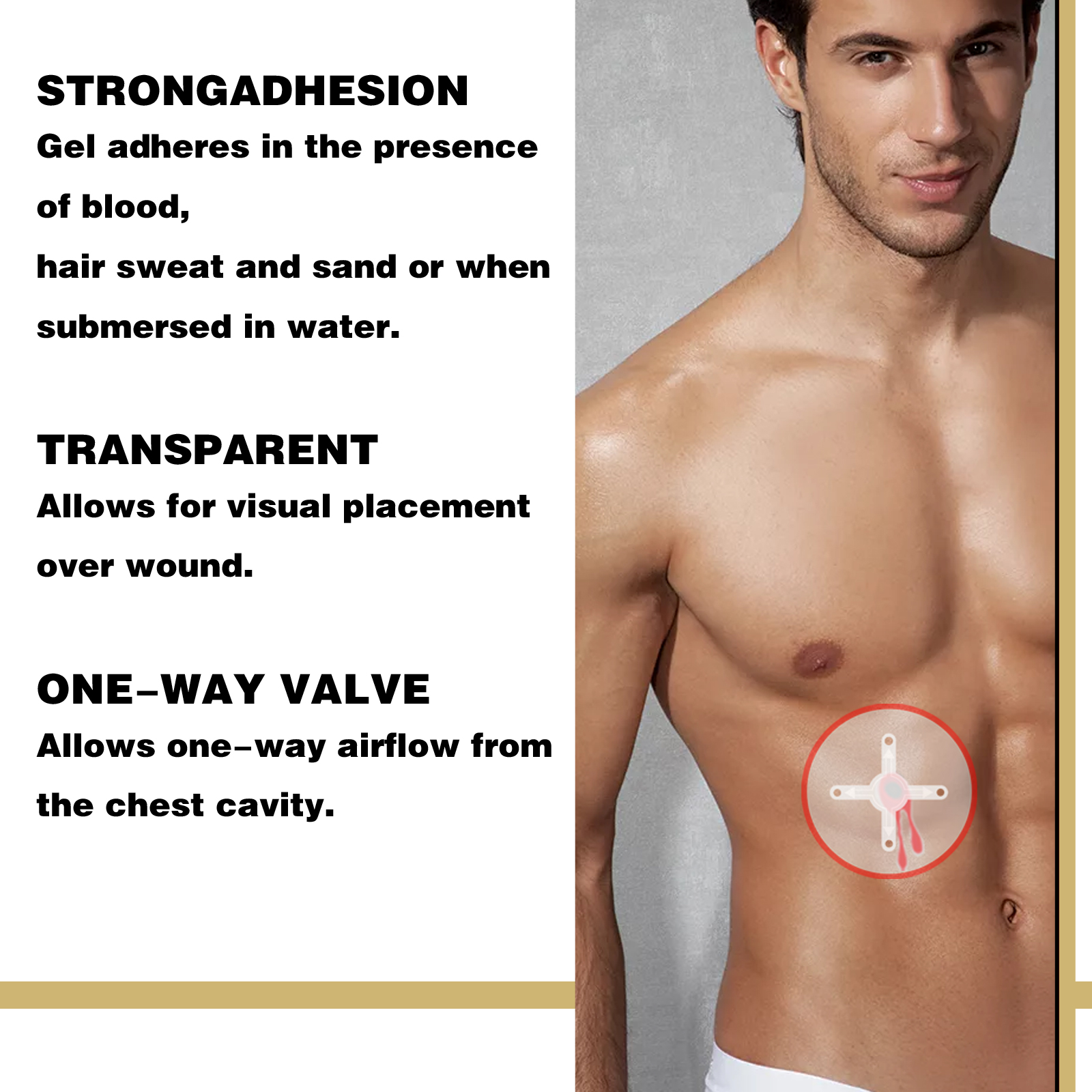 我们的创伤贴含有水凝胶,聚氨酯薄膜。它可以凝胶在有血液、毛发和沙粒存在时,或在水中浸泡时会产生粘附作用。它的使用方法很简单:1.清洁干燥伤口。2.从涂有胶水的表面去除保护衬垫。3.将其放置在患者伤口粘合剂上,向下放置。4.用力按压皮肤,确保封口闭合。并且可以透明的允许在伤口上进行可视化放置。单向阀允许来自胸腔的单向气流。