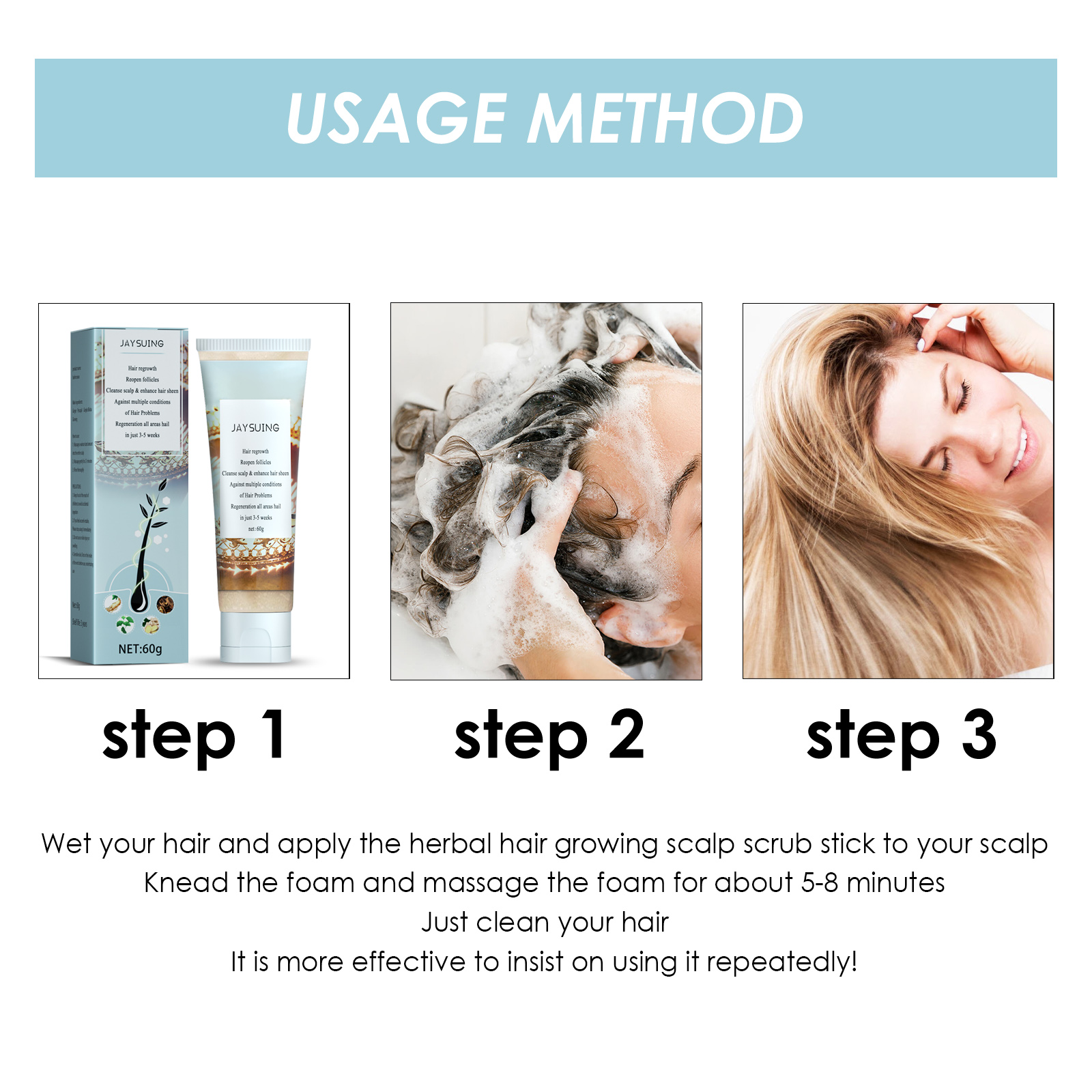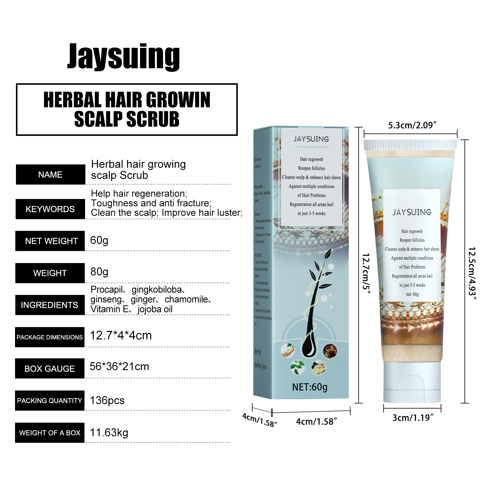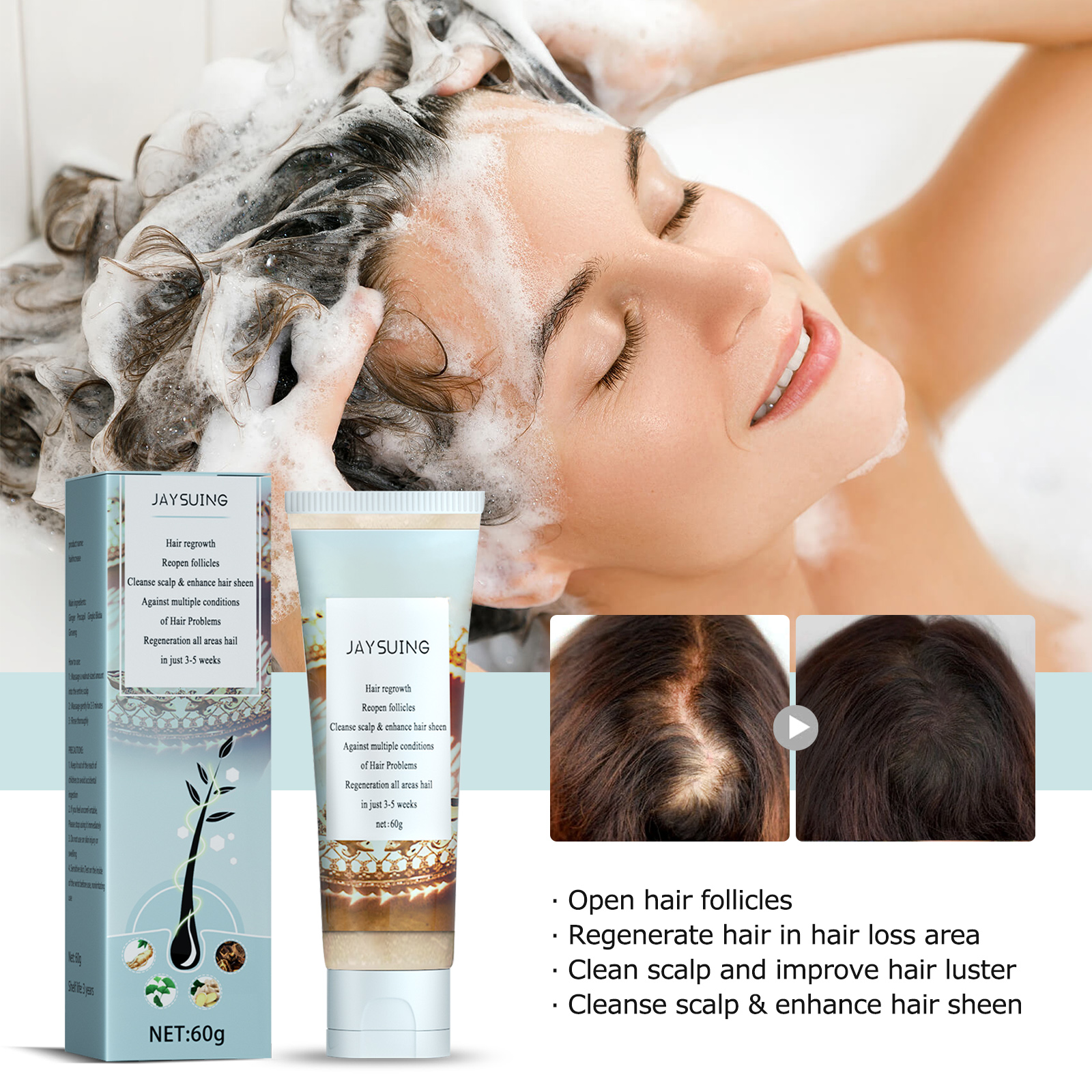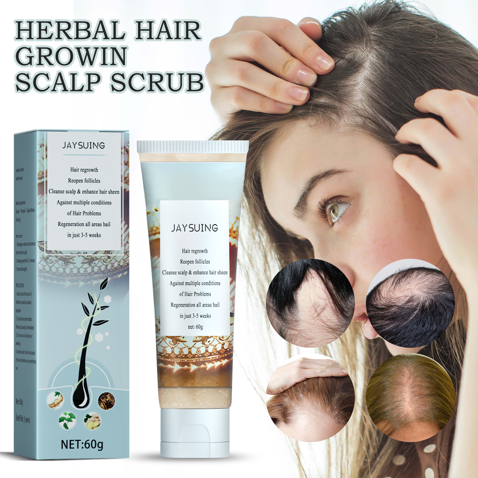 我们的草本生发头皮磨砂膏含有生发肽、银杏叶。它可以进一步滋养发根,产生越来越多的黑色小斑点,越来越多的新发正在生长,头发变得越来越浓密,让您再次拥有更光滑、更浓密的头发。它的使用方法很简单:湿润你的头发,将草本头发生长头皮擦拭棒涂在头皮上揉搓泡沫,按摩泡沫约5-8分钟。洗头就行了,坚持反复使用会更有效。并且可以打开毛囊在脱发区域再生头发清洁头皮并改善头发光泽清洁头皮并增强头发光泽。