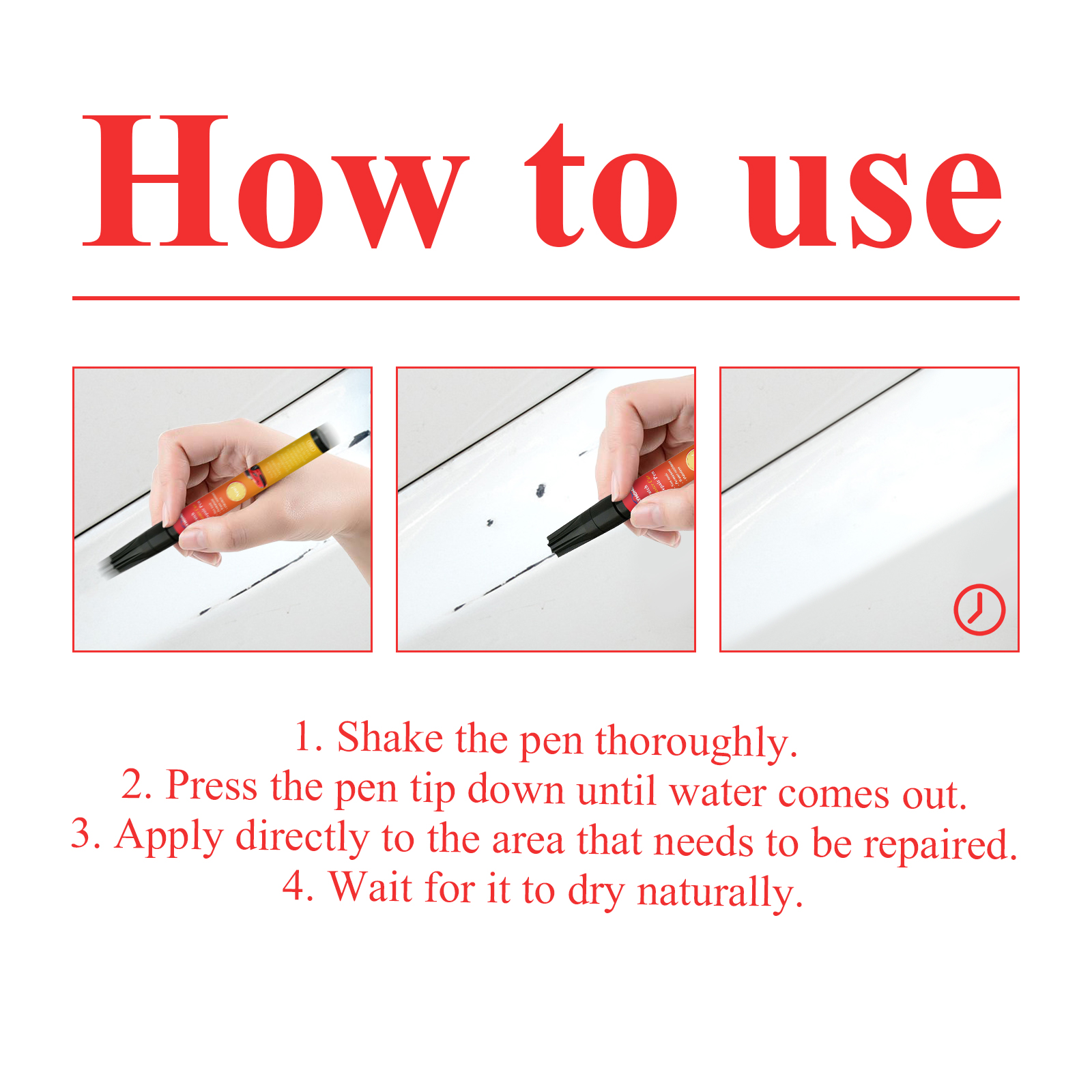 我们的汽车划痕修复笔含有紫外线固化剂、丙烯酸树脂、棕榈酸。它可以在汽车表面形成透明层,填补划痕,同时保持表面无裂纹。它的使用方法很简单:首先彻底摇动钢笔,把笔尖往下压,直到有水出来,之后直接涂抹在需要修复的部位,等它自然晾干即可。使用后可以完美修复汽车划痕,修复后的漆面不会受水的影响,能使修复后的表面光洁如新。