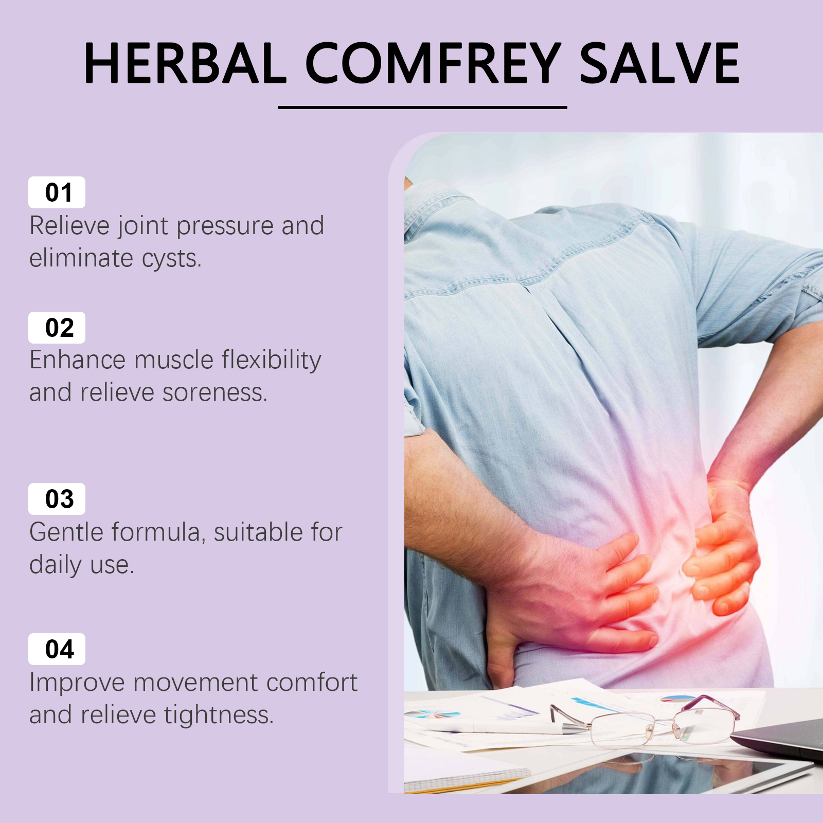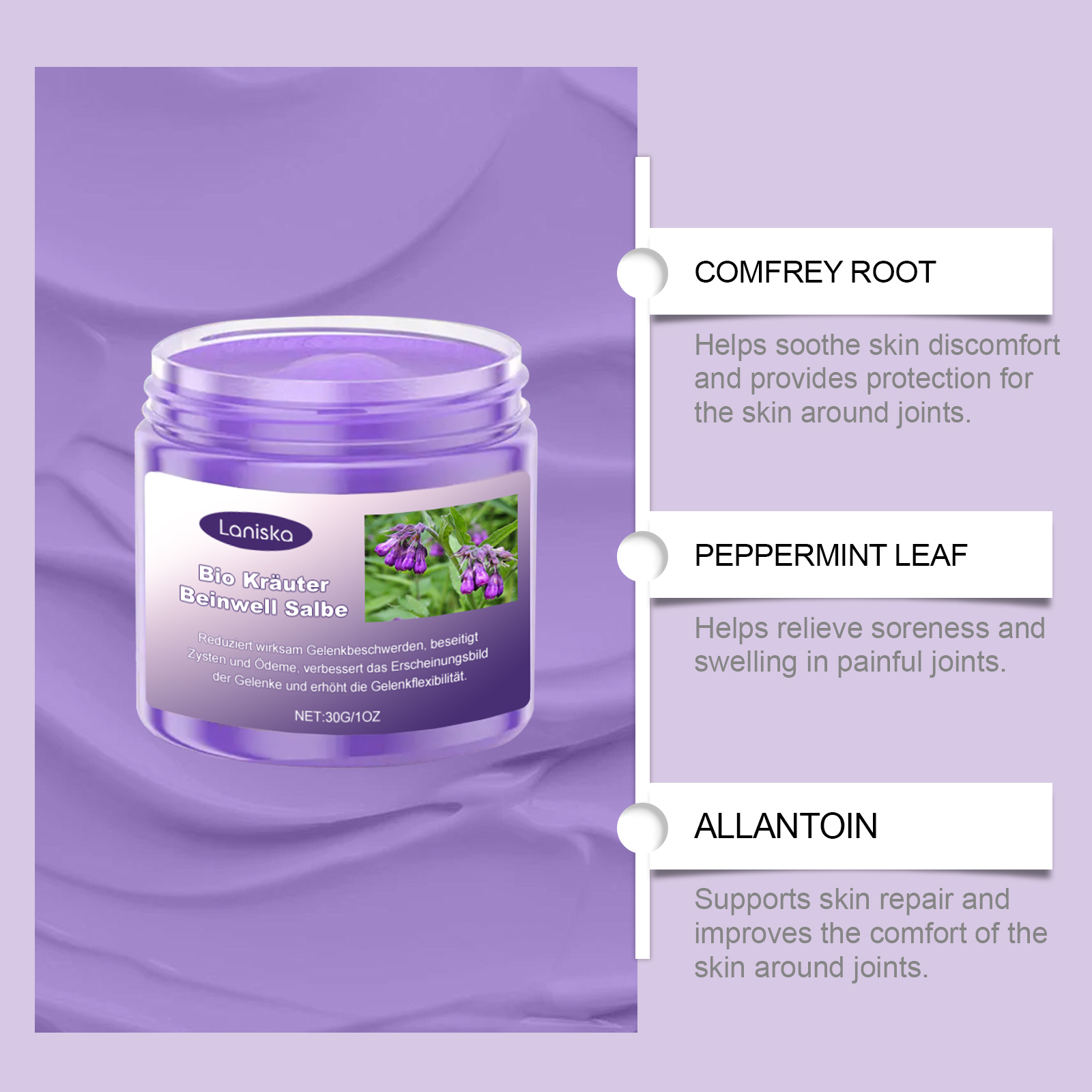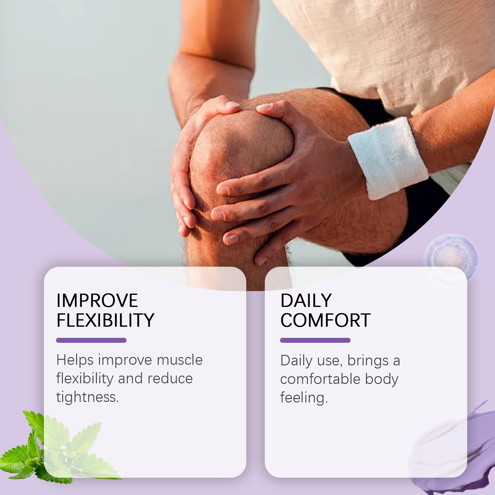 我们的关节护理霜含有紫草根、薄荷叶、生姜。它可以有助于提高肌肉的柔韧性,减少紧绷感。它的使用方法很简单:清洁皮肤。取适量本品均匀涂于关节。轻轻按摩促进吸收。并且可以日常使用,带来舒适的身体感觉。