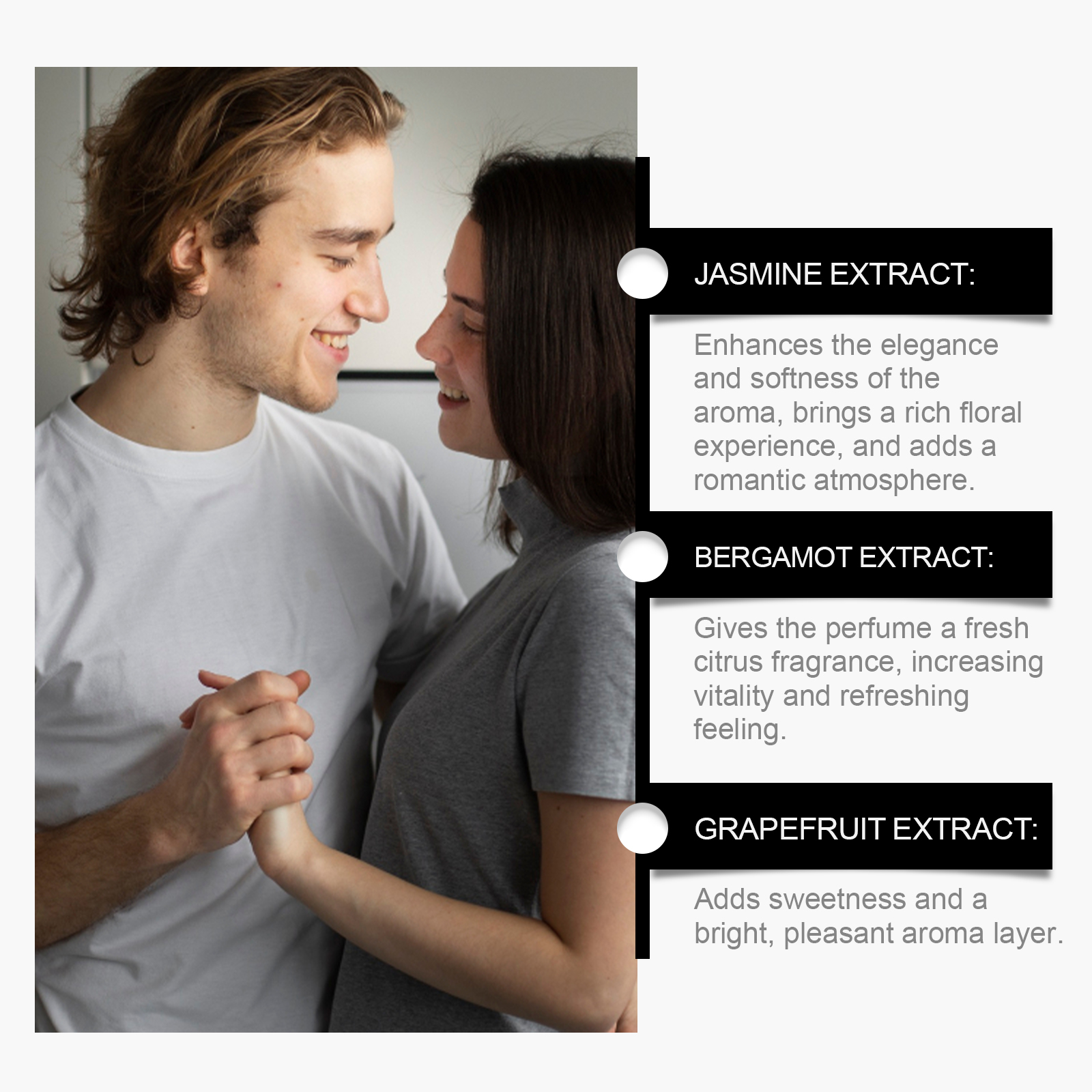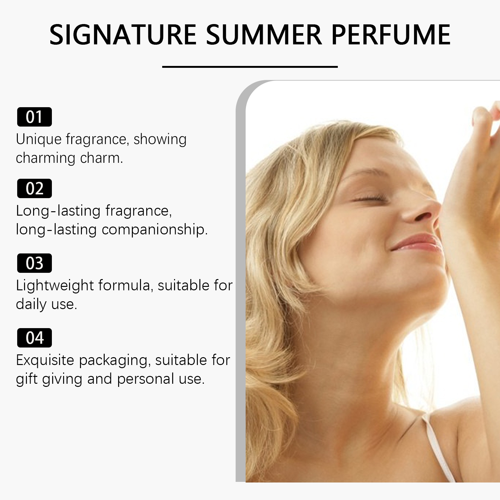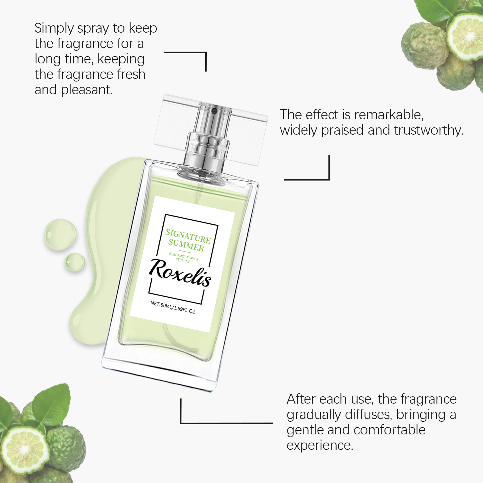 我们的夏日佛手柑香水含有麝香、佛手柑提取物。它可以给人一种宁静而又不失活力的感觉。香味持久,清淡不浓烈。它的使用方法很简单:取适量本品均匀喷于手腕、耳后、颈部等需要留香的部位。或者在空气中喷酒香水,让它均匀地散布在全身,留下浓郁的香气。并且可以适合日常使用或正式场合,展现个人品味和自信。