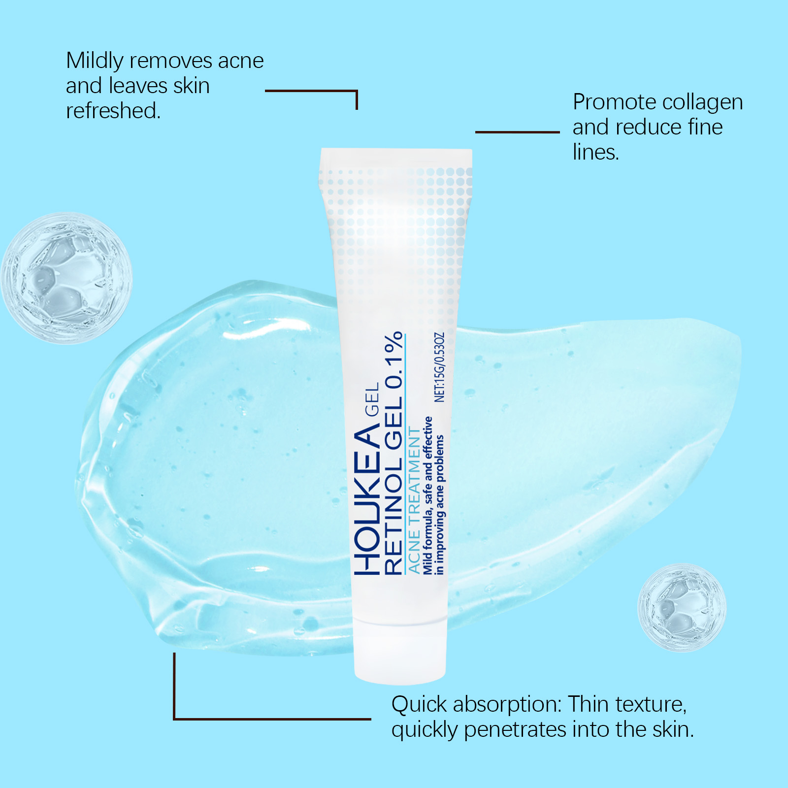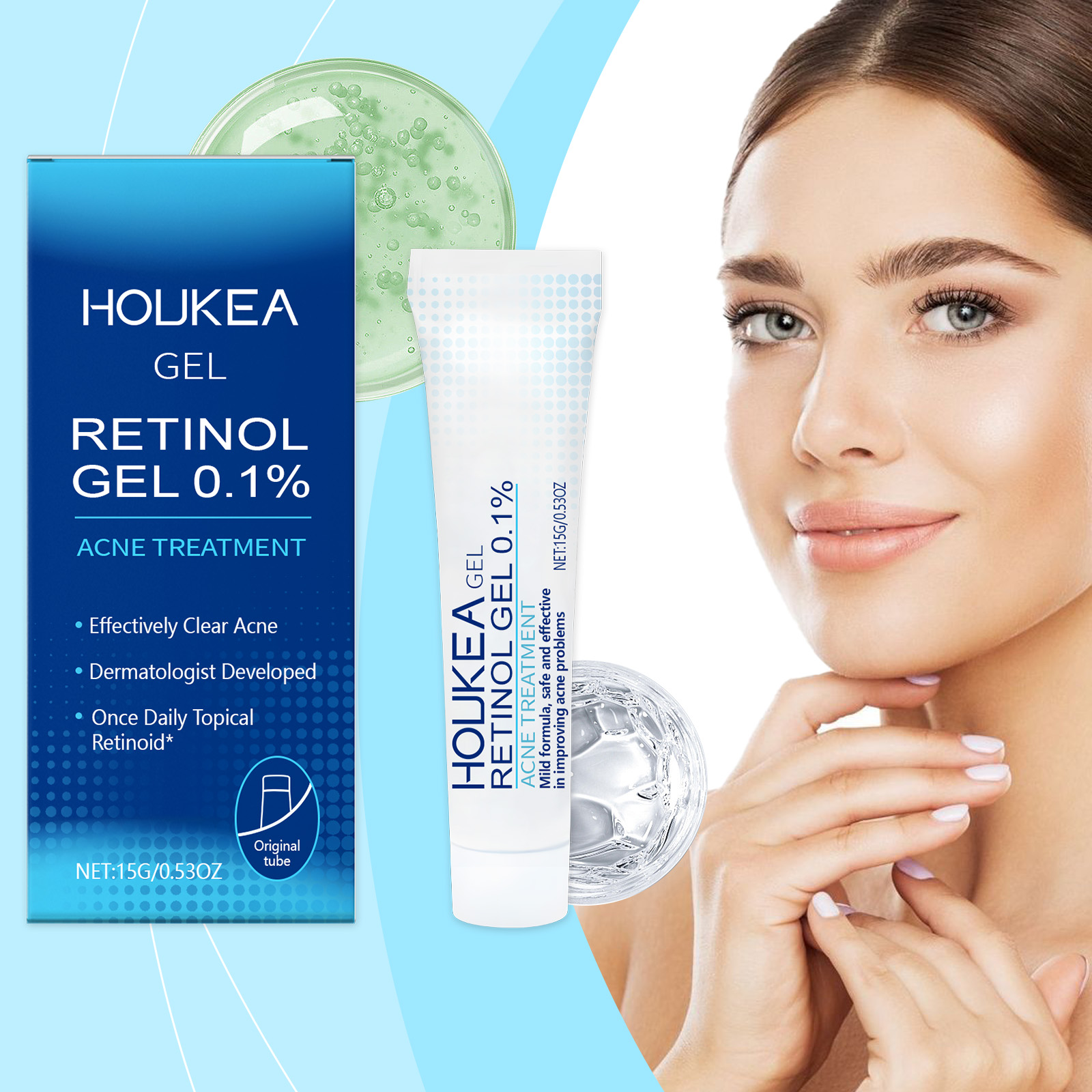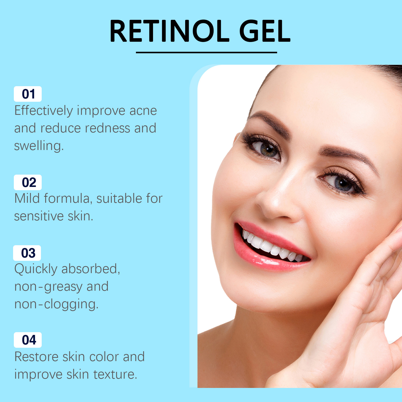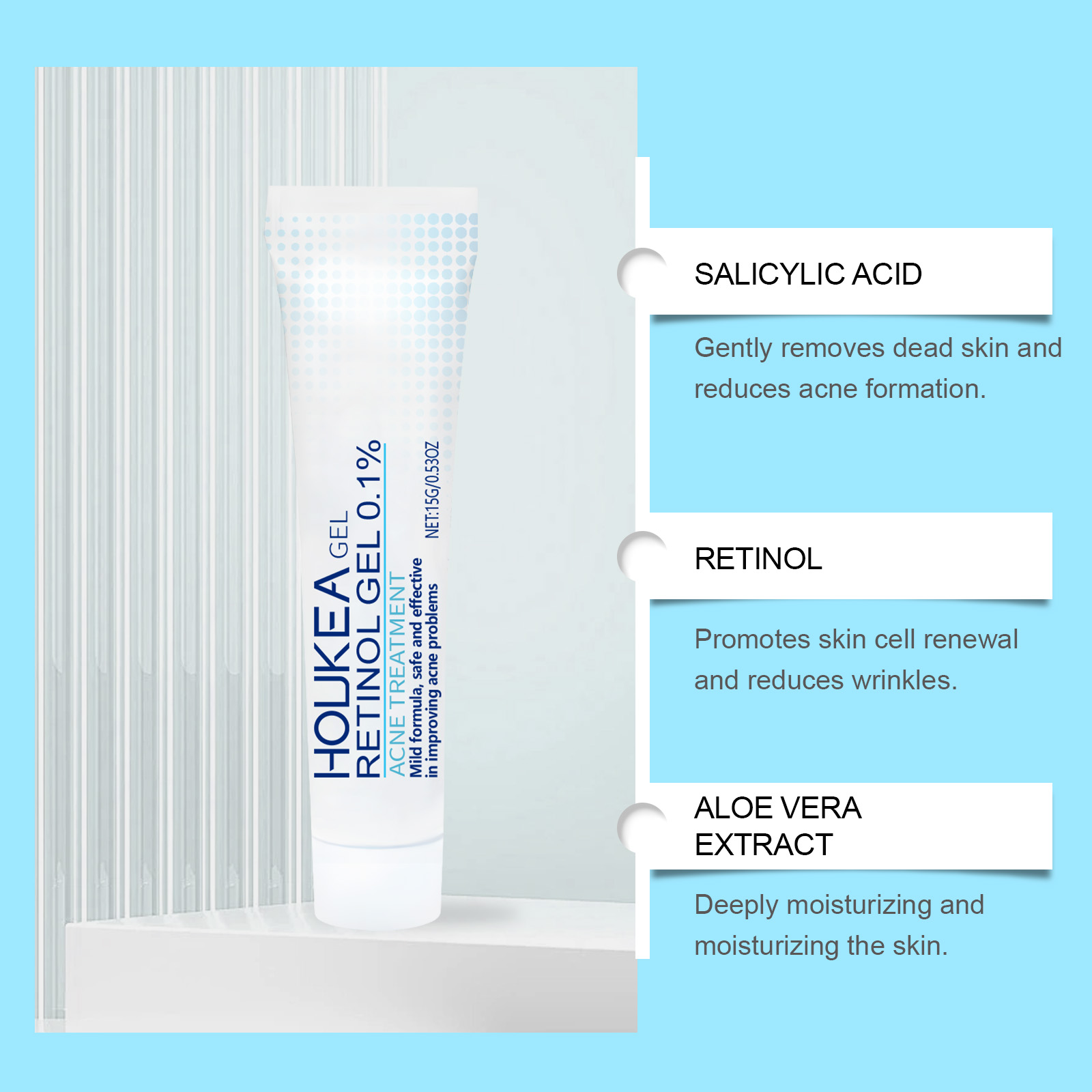 我们的视黄醇啫喱含有库拉索芦荟提取物、透明质酸。它可以有效减少痤疮并改善皮肤状况。它的使用方法很简单:洁肤后,取本品适量,涂于患处。并且可以缓解炎症并减少红肿和不适。