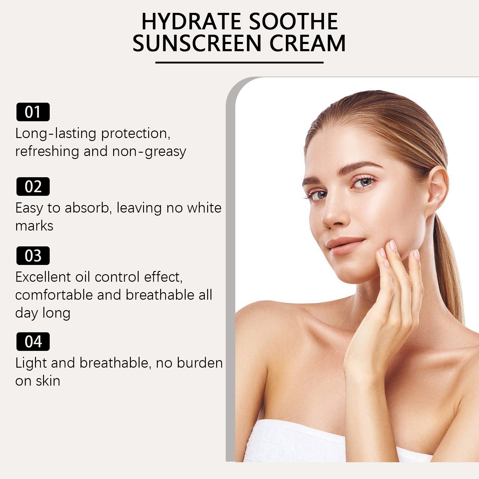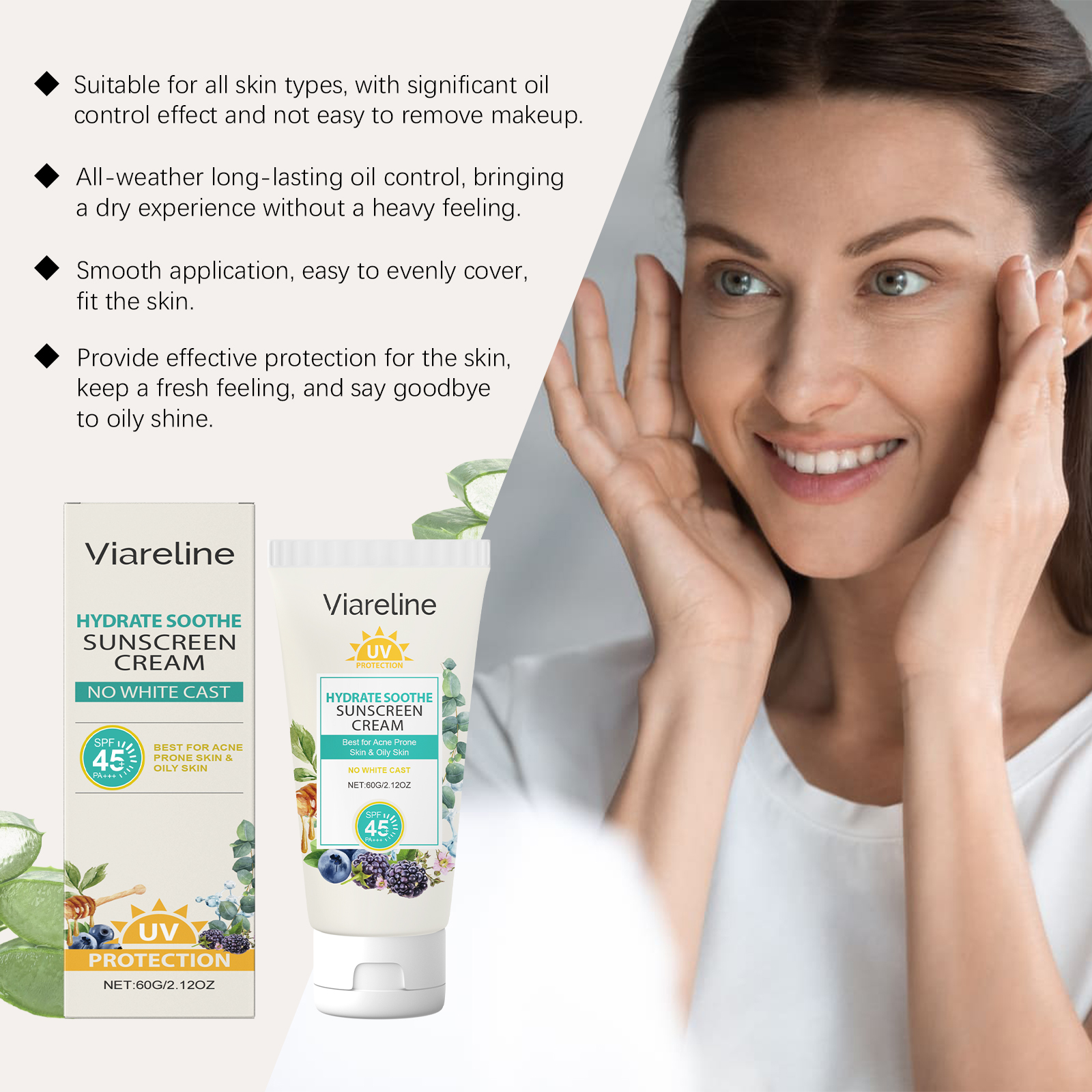 我们的控油防护霜含有甘油、二氧化钛。它可以轻盈配方带来无负担的使用感受,让肌肤保持光滑。有效隔离紫外线伤害,全天保护肌肤。它的使用方法很简单:清洁皮肤,保持皮肤干燥取本品适量,均匀涂颈部、手臂、面部等部位。涂抹后,等待防晒霜在皮肤表面形成保护膜并且可以用后立即渗透肌肤,清爽不粘腻,感觉舒适。