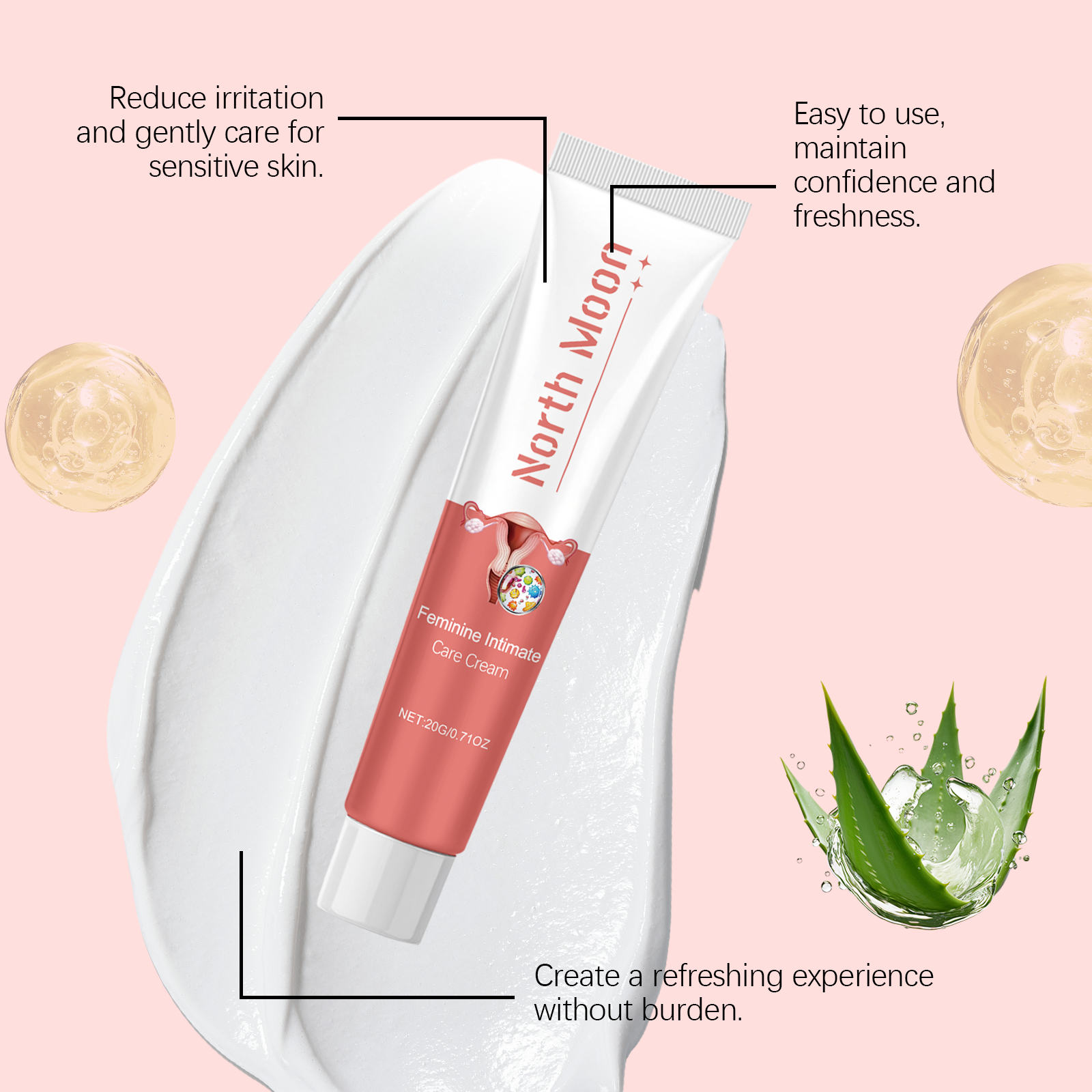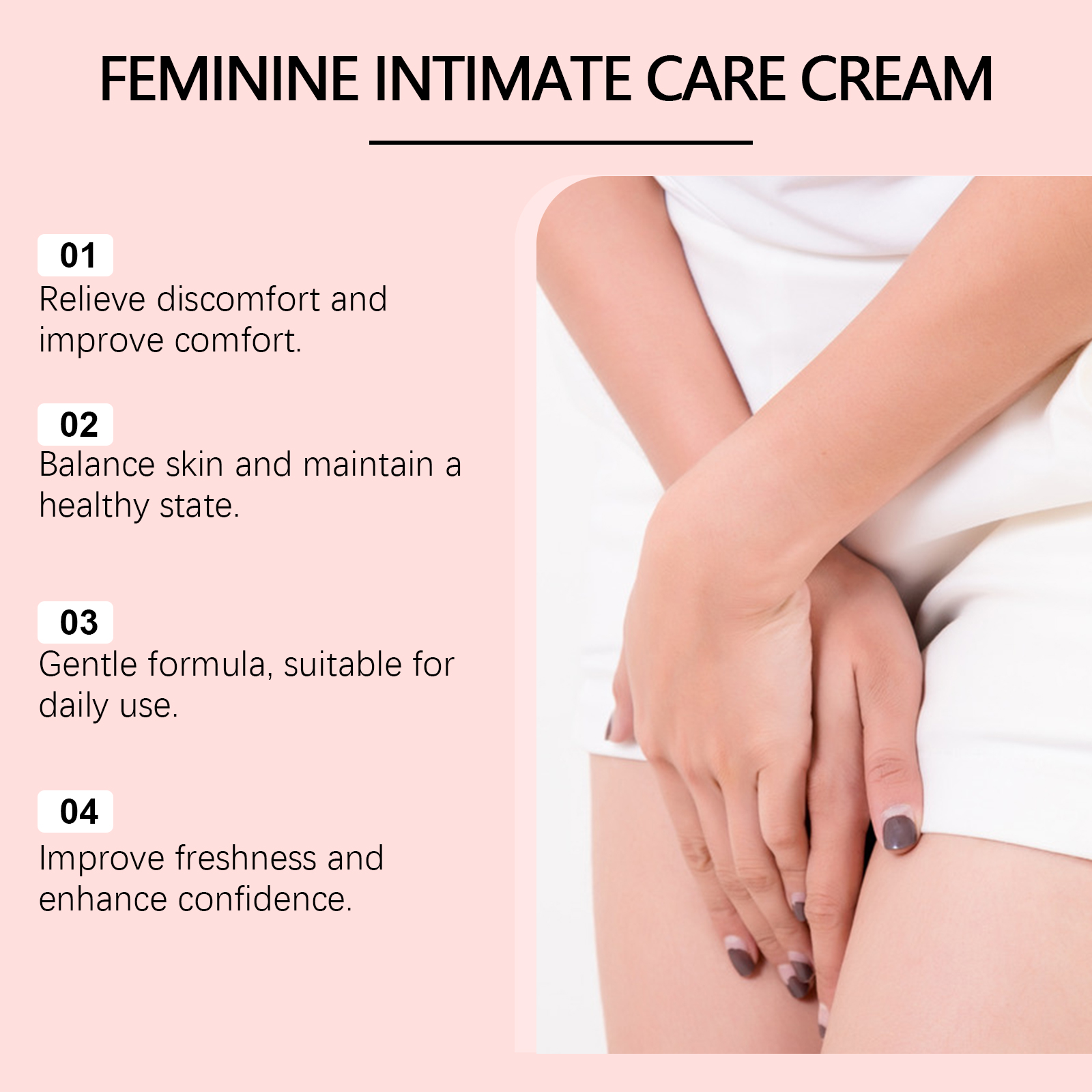 我们的女士身体护理霜含有甘油、矿油。它可以性质温和无刺激适合娇嫩部位,适合多种肤质。有效维持酸碱平衡,维持健康的环境,并减少外部干扰。它的使用方法很简单:清洁私密皮肤并保持干燥。取适量本品均匀涂抹于私处肌肤。轻轻按摩直至吸收。并且可以减少异味,增强清新,让你整天充满自信。