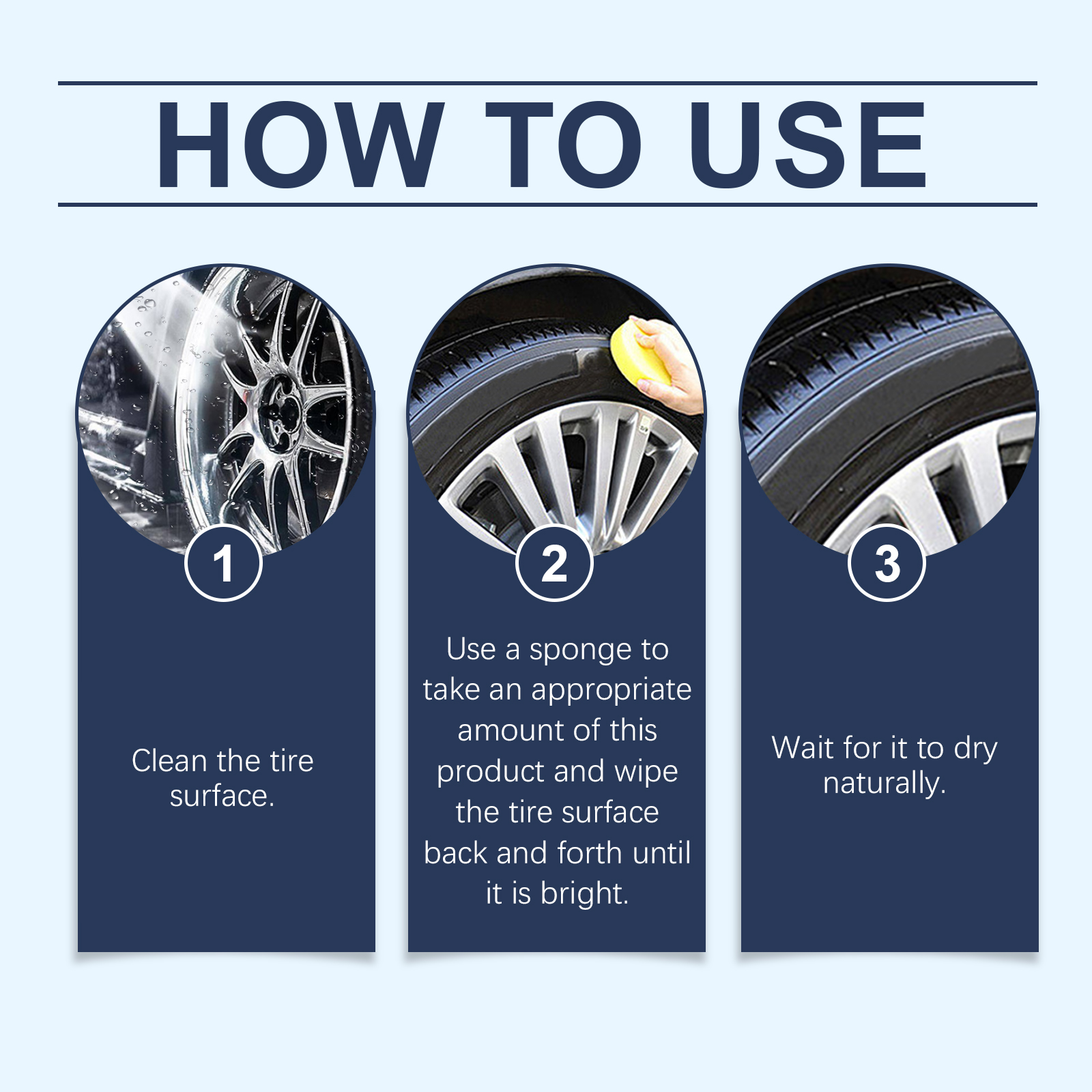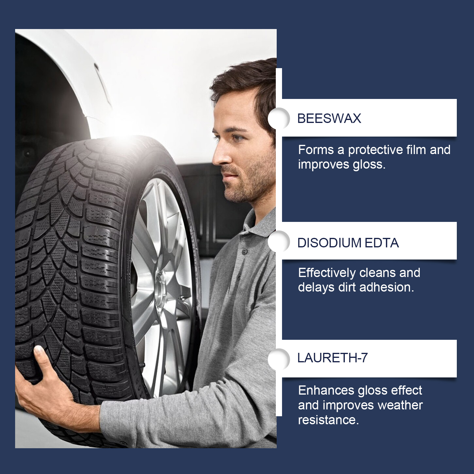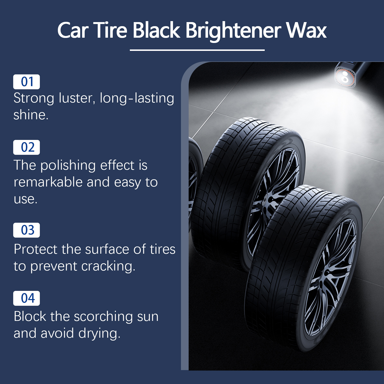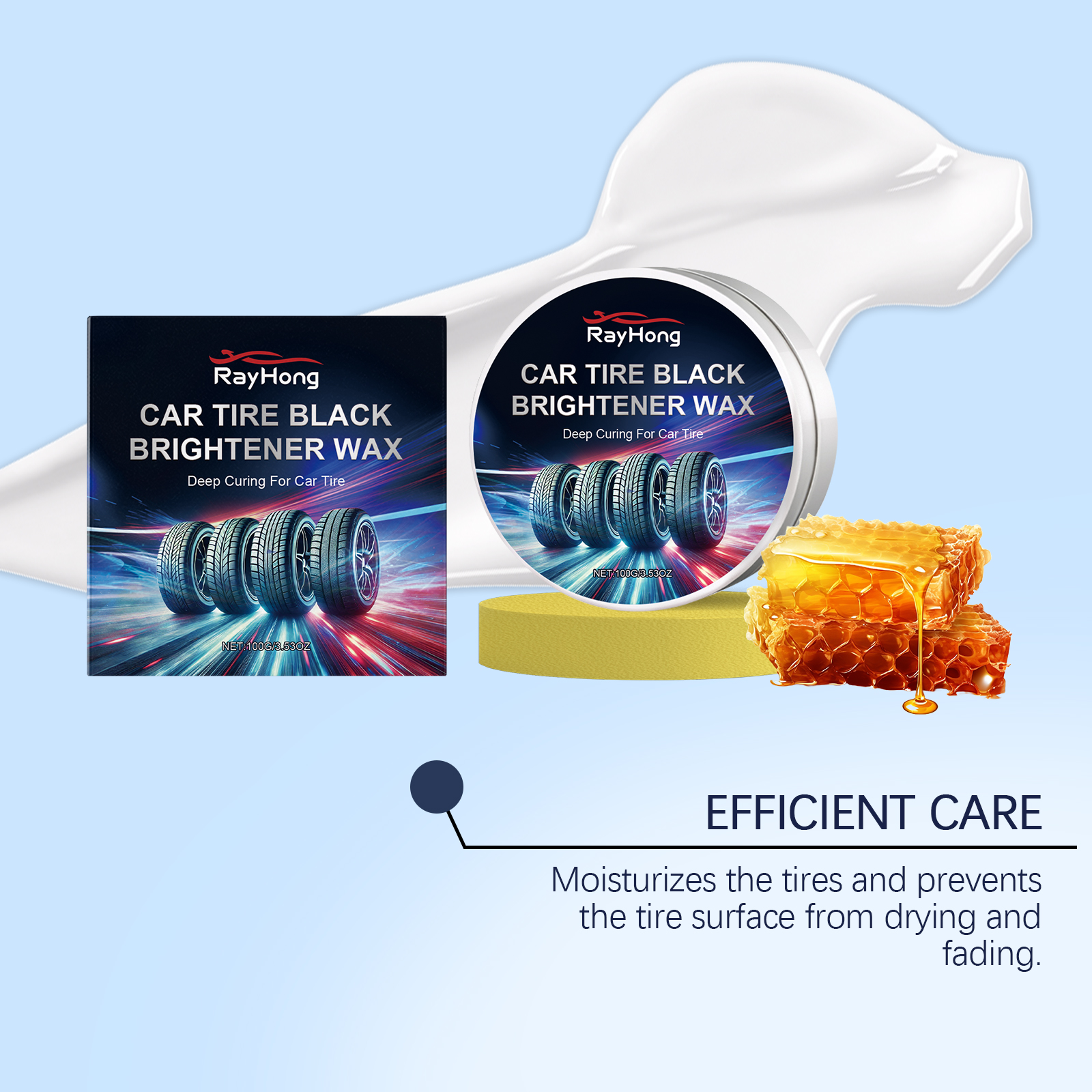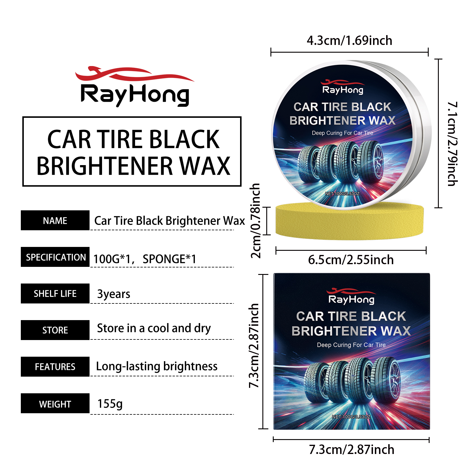 我们的汽车轮胎抛光膏含有蜂蜡、硅油。它可以温和的配方不会伤害轮胎,可以放心使用。增强了轮胎的耐磨性并能使汽车轮胎长时间保持清洁和光亮。它的使用方法很简单:将轮胎表面清理干净。用海绵取适量本品,来回擦拭轮胎表面,直至光亮。等待自然干燥。并且可以在轮胎表面形成保护膜,保护轮胎不受阳光、酸雨等有害物质的伤害,并能长期保护轮胎。