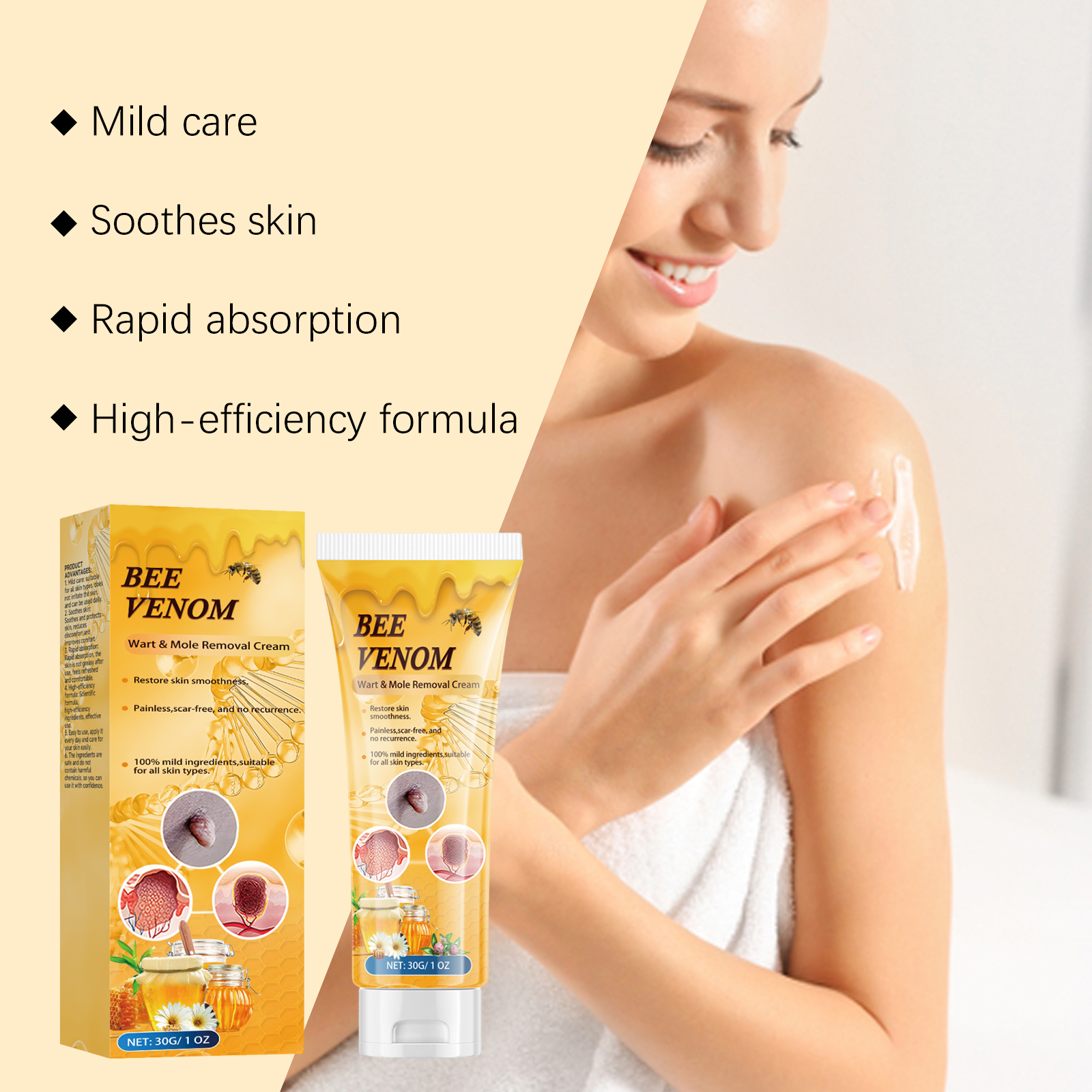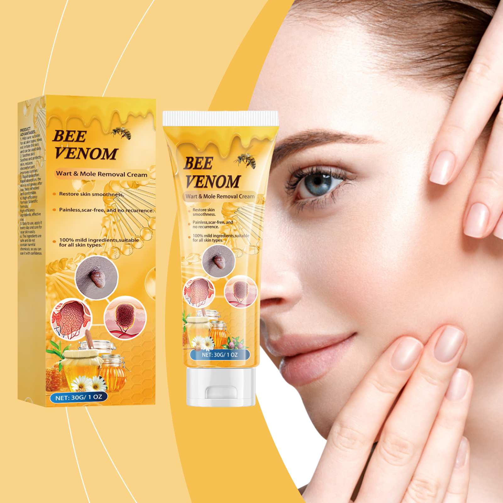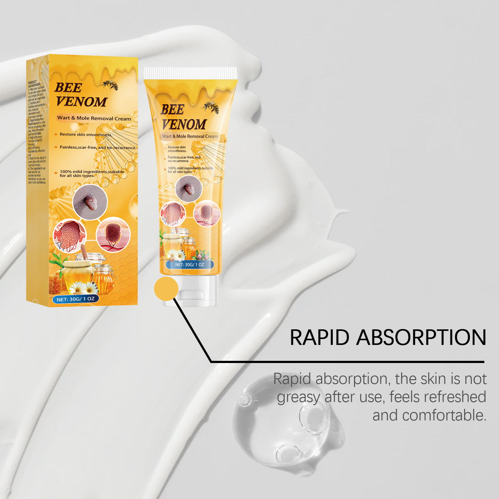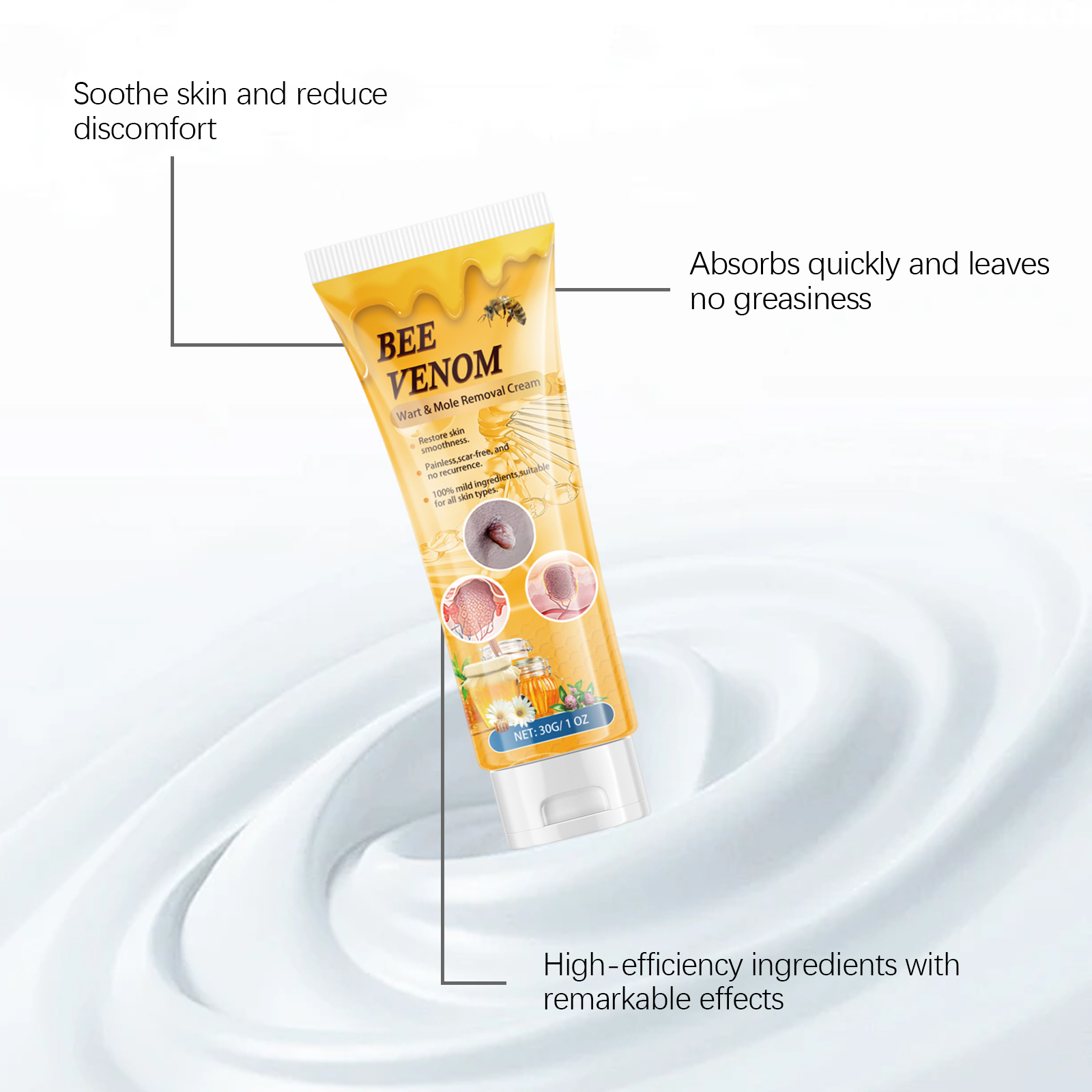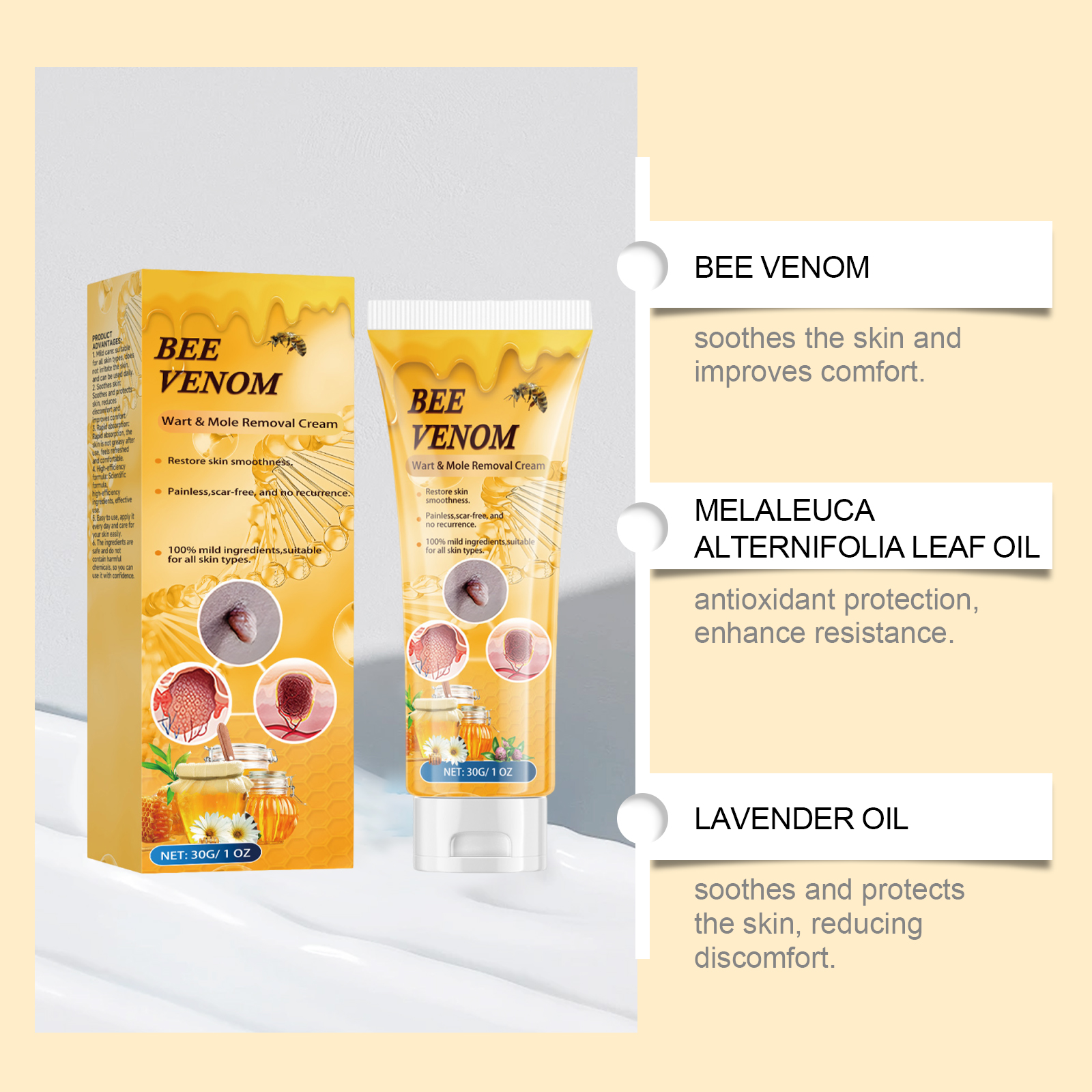 我们的蜂毒克尤霜,由蜂毒、互叶白千层(茶树)叶油精心调配而成。专为舒缓肌肤并改善舒适度设计。使用方法极为便捷:清洁皮肤并保持干燥,取适量本产品,均匀涂抹在皮肤标签或痣上。轻轻按摩直至完全吸收。并且可以适合所有肤质,不刺激皮肤,可每日使用,舒缓和保护皮肤,减少不适并改善舒适度。