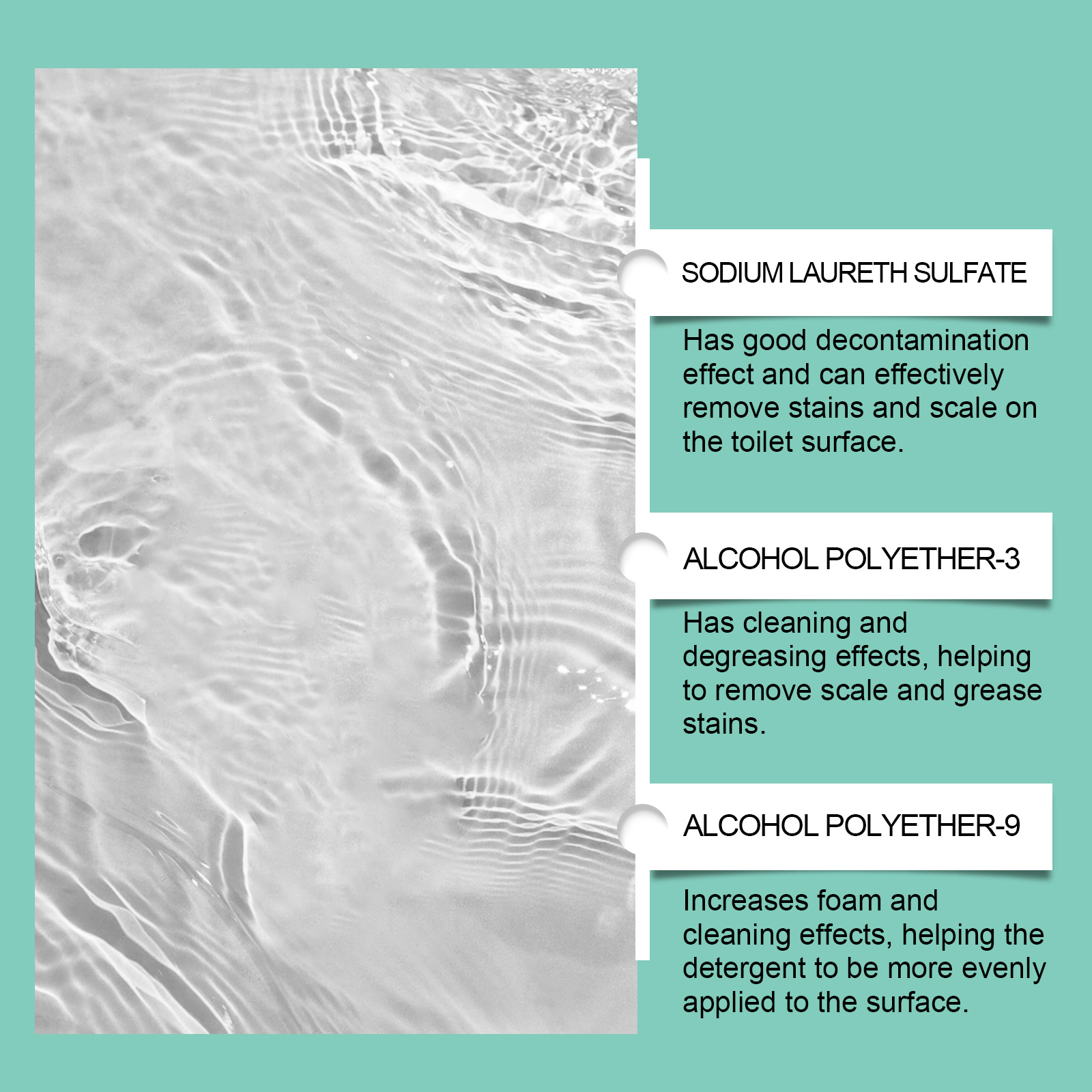 我们的马桶清洁剂含有葡萄糖酸钠、EDTA二钠、柠檬酸。它可以强力去除污垢,快速分解顽固污垢和水垢保持马桶清洁。它的使用方法很简单:将清洁剂均匀地倒在马桶的顶部和周围,让它流到马桶的侧面和内部。让它静置5-10分钟,让产品充分发挥去污和杀菌作用。用工具擦拭马桶上的污渍。用清水冲厕所。并且它可以消除异味保持厕所空气清新,提供舒适的环境。