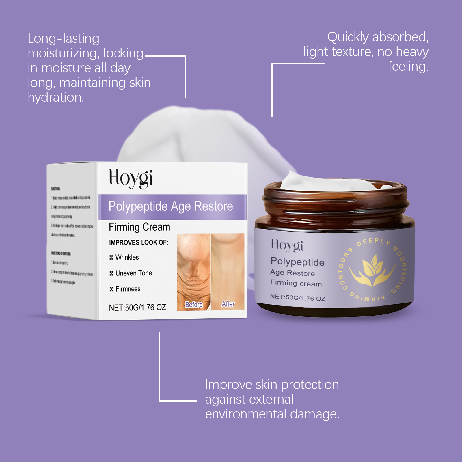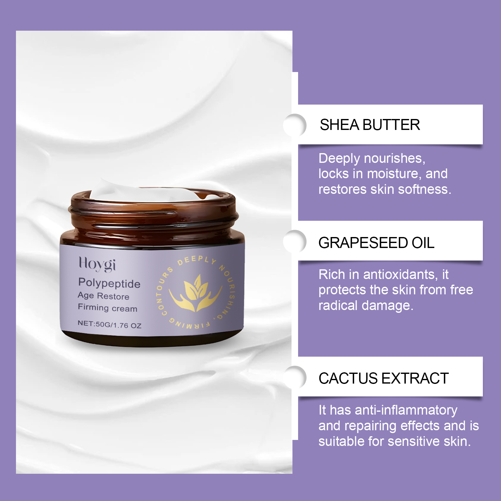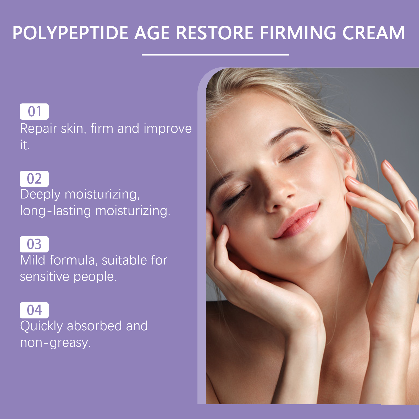 我们的多肽皮肤护理霜含有三乙醇胺、透明质酸、乙酰基六肽-8。它可以补充水分,增加弹性减少脂肪,使肌肤,焕发活力。轻盈的面霜容易吸收,深层滋养肌肤,令肌肤更紧致,看起来更年轻。它的使用方法很简单:清洁皮肤,保持皮肤干燥。取适量乳霜,均匀涂抹于皮肤上,轻轻按摩促进吸收。并且可以肽修复具有神奇的效果,改善循环,改善皮肤质地,重塑紧致轮廓。
