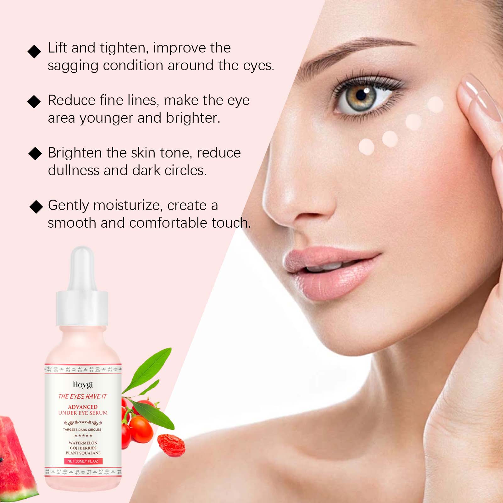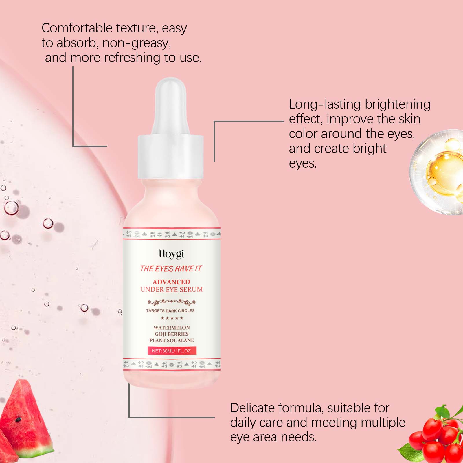 我们的抗皱眼部精华液含有西瓜提取物、枸杞提取物、角鲨烷。它可以改善眼部迟钝,恢复健康的光泽。它的使用方法很简单:清洁面部并保持干燥。取适量本品均匀涂于眼部周围肌肤。轻轻按摩以促进其吸收。并且可以显著减轻眼部周围的下垂感,展现紧致肌肤。