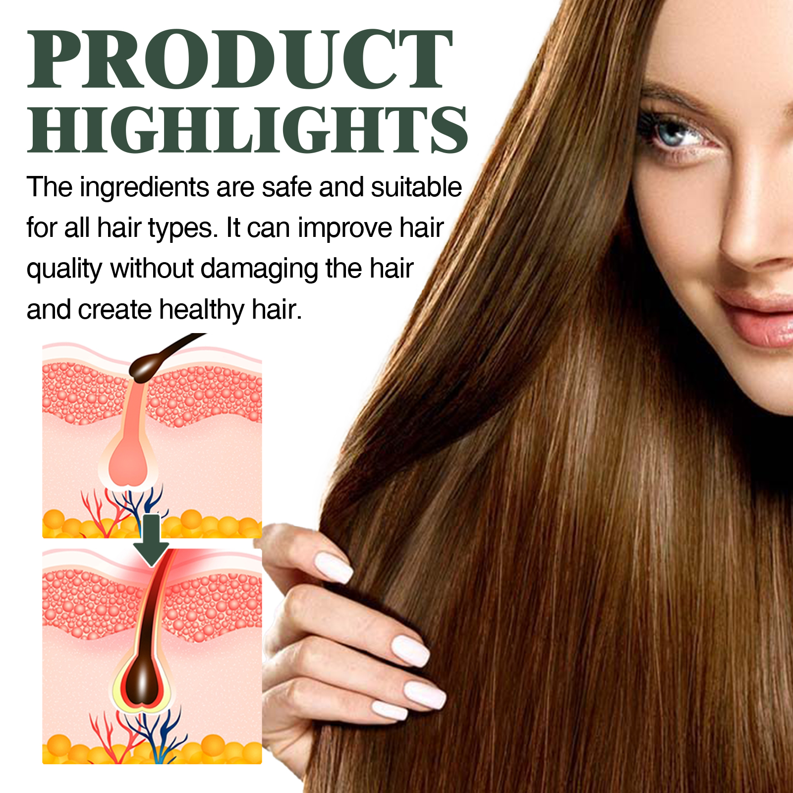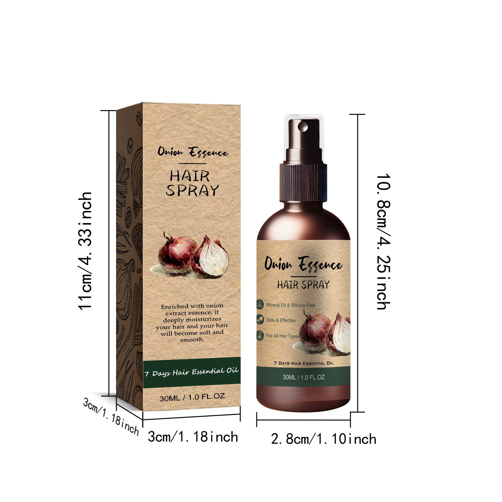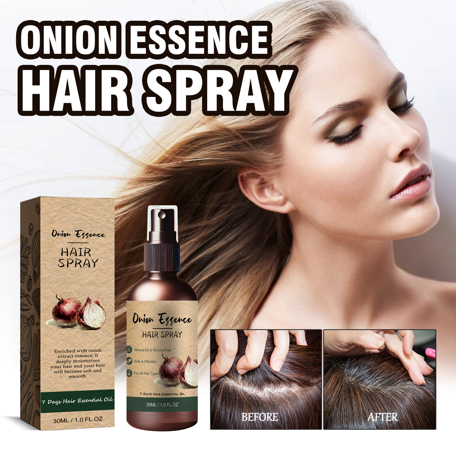 我们的洋葱护发精华液含有洋葱提取物、薰衣草油、洋甘菊油。它可以维持头发的水油平衡,修护受损头发,有效改善头发干枯毛躁等问题,促进头发生长,深层补水,滋养头皮。它的使用方法很简单:先把头发洗净,将喷雾喷在离头皮5-10厘米的地方,在头皮上轻轻按摩至完全吸收即可。可以在护理头发的同时散发出迷人的香味,使您的头发散发出持久的香味,充满魅力。