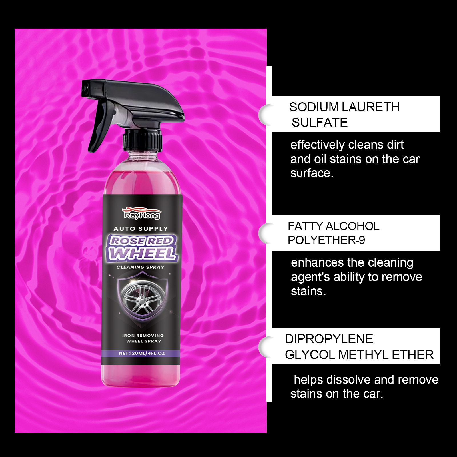 我们的汽车车轮清洁剂含有月桂醇聚醚硫酸酯钠、脂肪醇聚醚-9。它可以强力清洁,恢复车轮的原色。一种温和的配方,不会损坏车轮涂层。它的使用方法很简单:首先冲洗车轮。然后将本品喷在车轮上,用工具去除污垢。彻底冲洗车轮以获得清洁的表面。并且它可以快速有效地去除汽车表面的锈斑和污渍,并恢复表面光洁度。