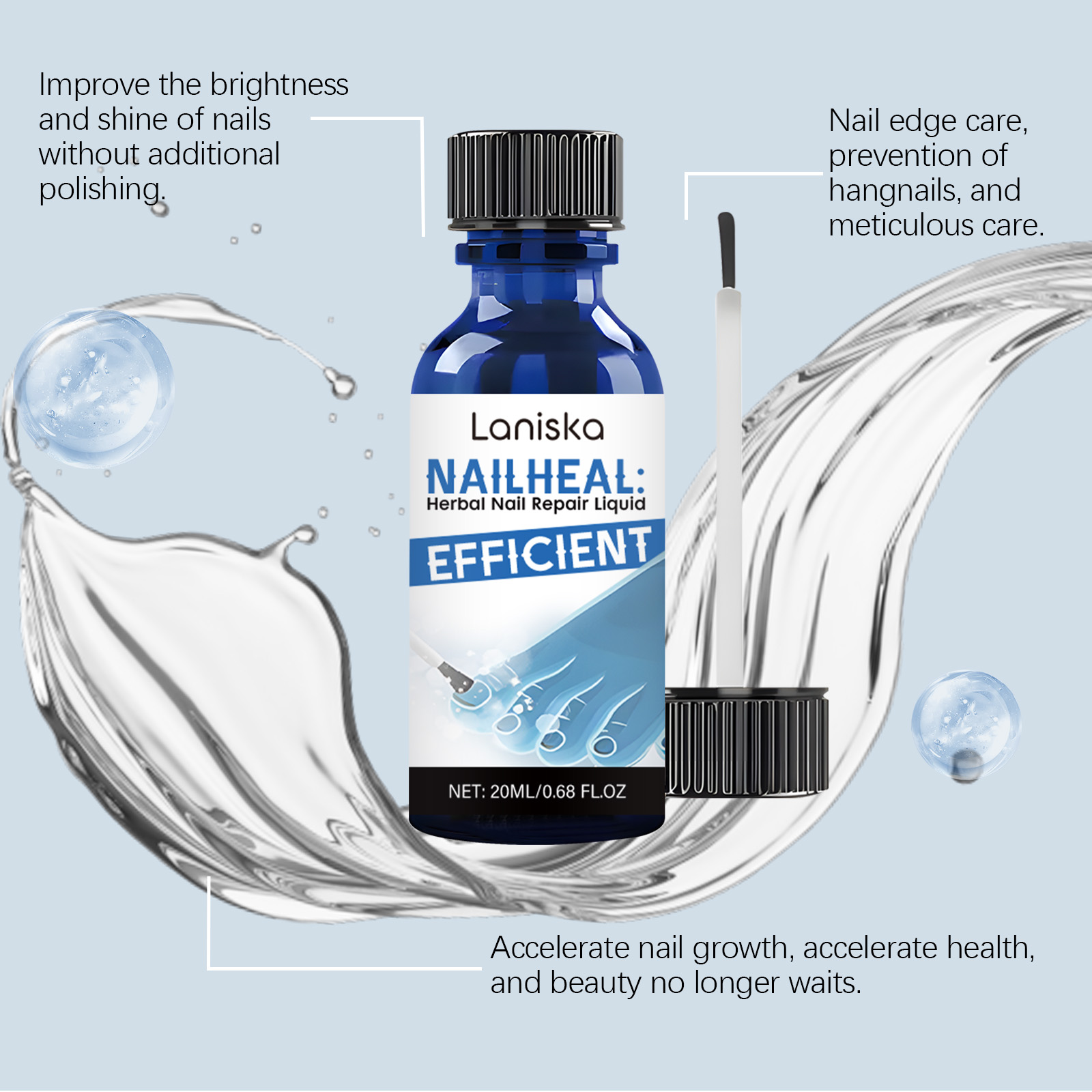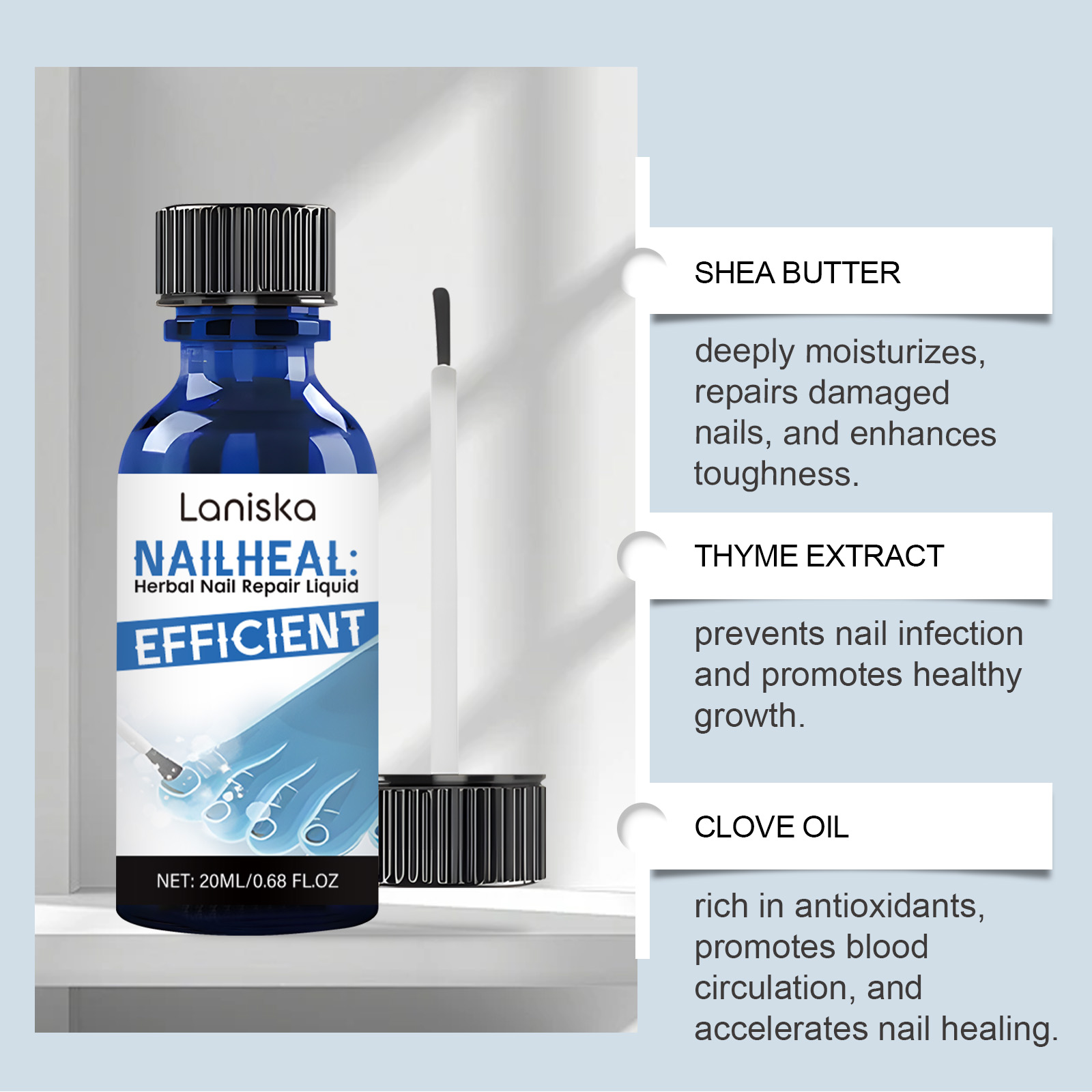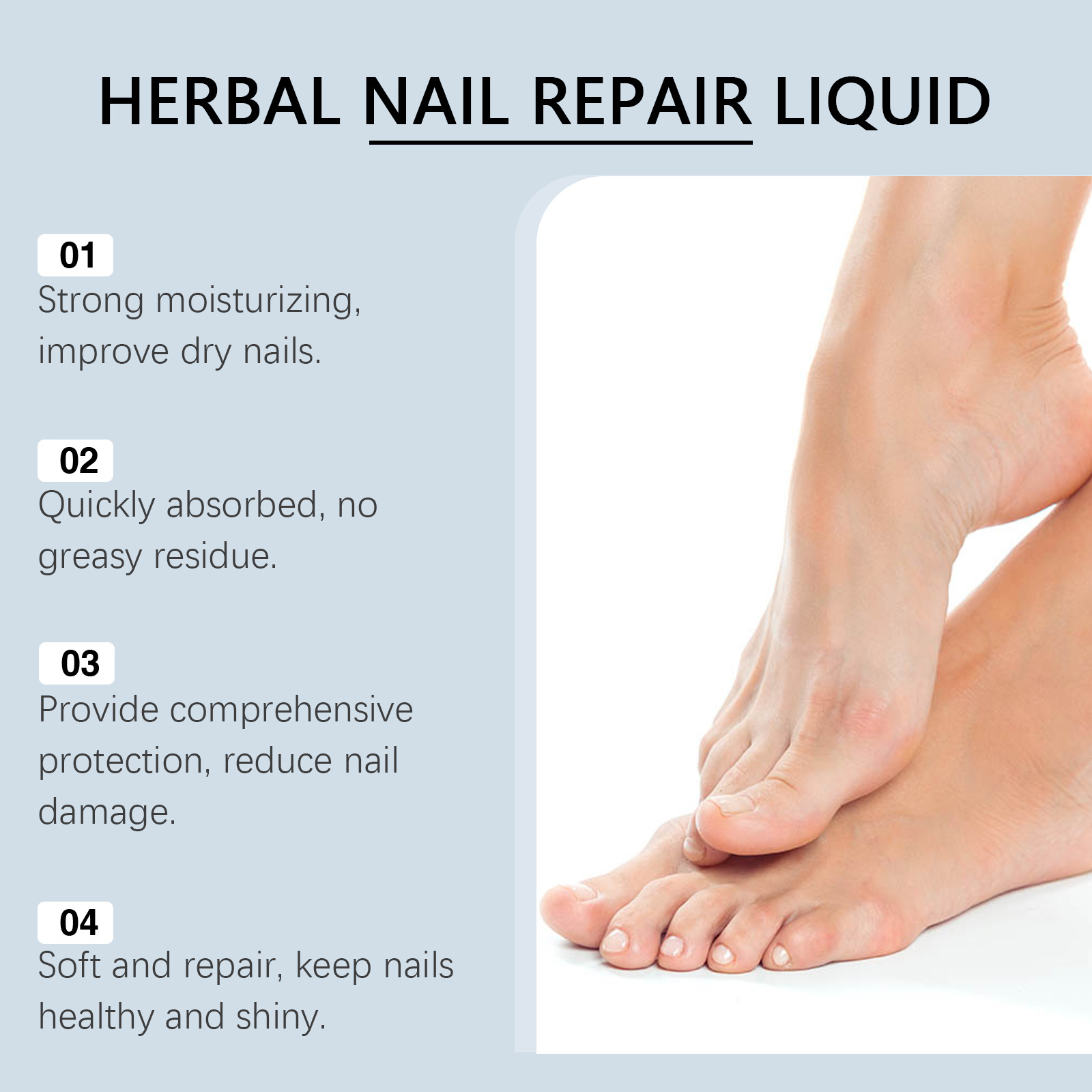 我们的草本指甲治疗液含有百里香提取物、丁香油、生育酚。它可以加强指甲结构,减少脱层和破损,重建健康和强度。它的使用方法很简单:清洁并干燥指甲及周围皮肤,取适量本品均匀涂抹于指甲上,并用指尖轻轻按摩以吸收。并且可以双重保湿,深层锁住水分,保持指甲柔软。