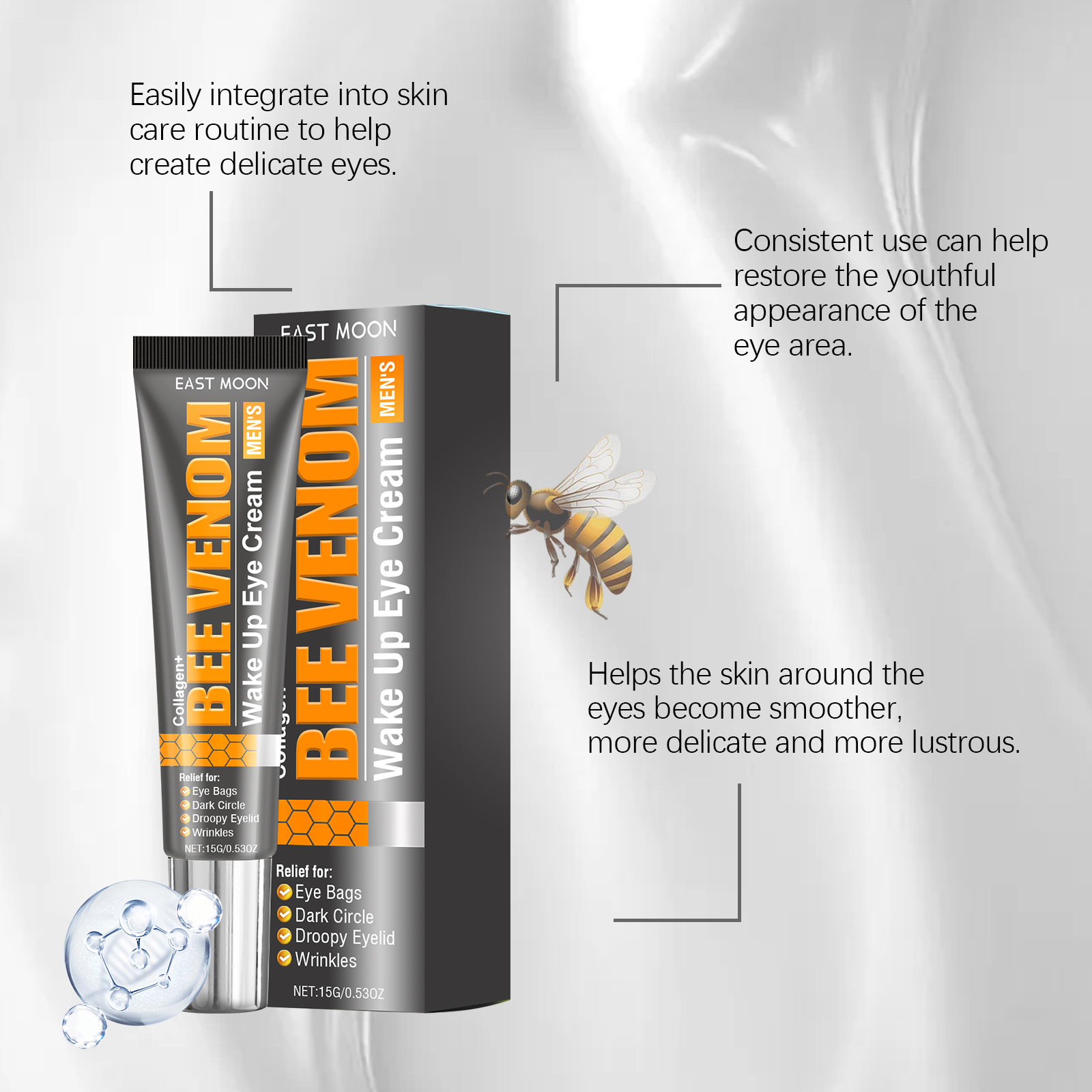 我们的男士眼霜含有蜂毒、胶原蛋白。它可以为眼周肌肤提供充足的水分,帮助锁住水分,改善眼部干燥紧绷。它的使用方法很简单:在清洁和调理面部后,取绿豆大小的眼霜用指尖温热它,然后均匀地涂抹在眼周,从外到内轻轻按摩直到完全吸收,不要拉扯皮肤。并且可以舒缓眼部肌肤的疲劳,修复眼部周围的屏障,提高肌肤舒适度。