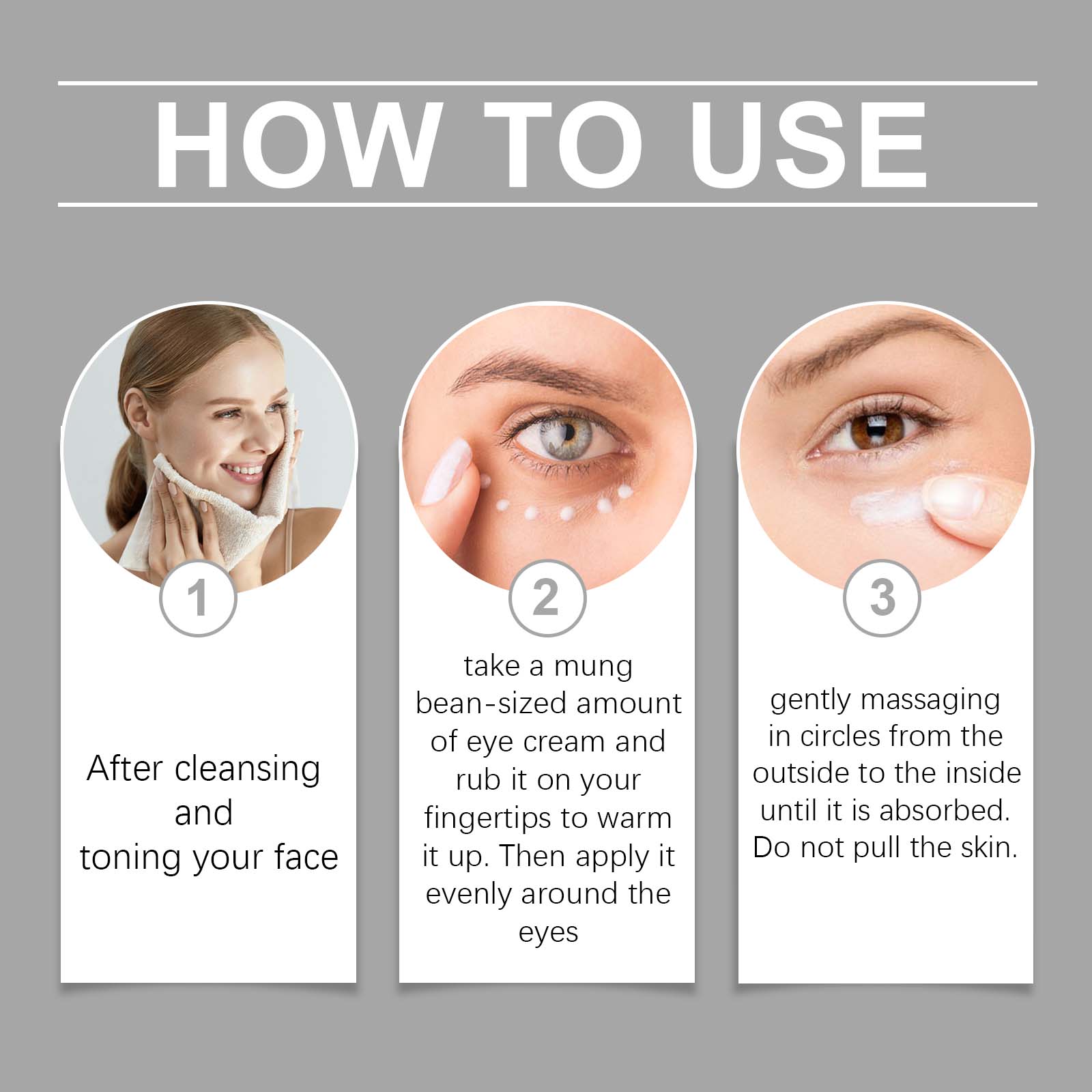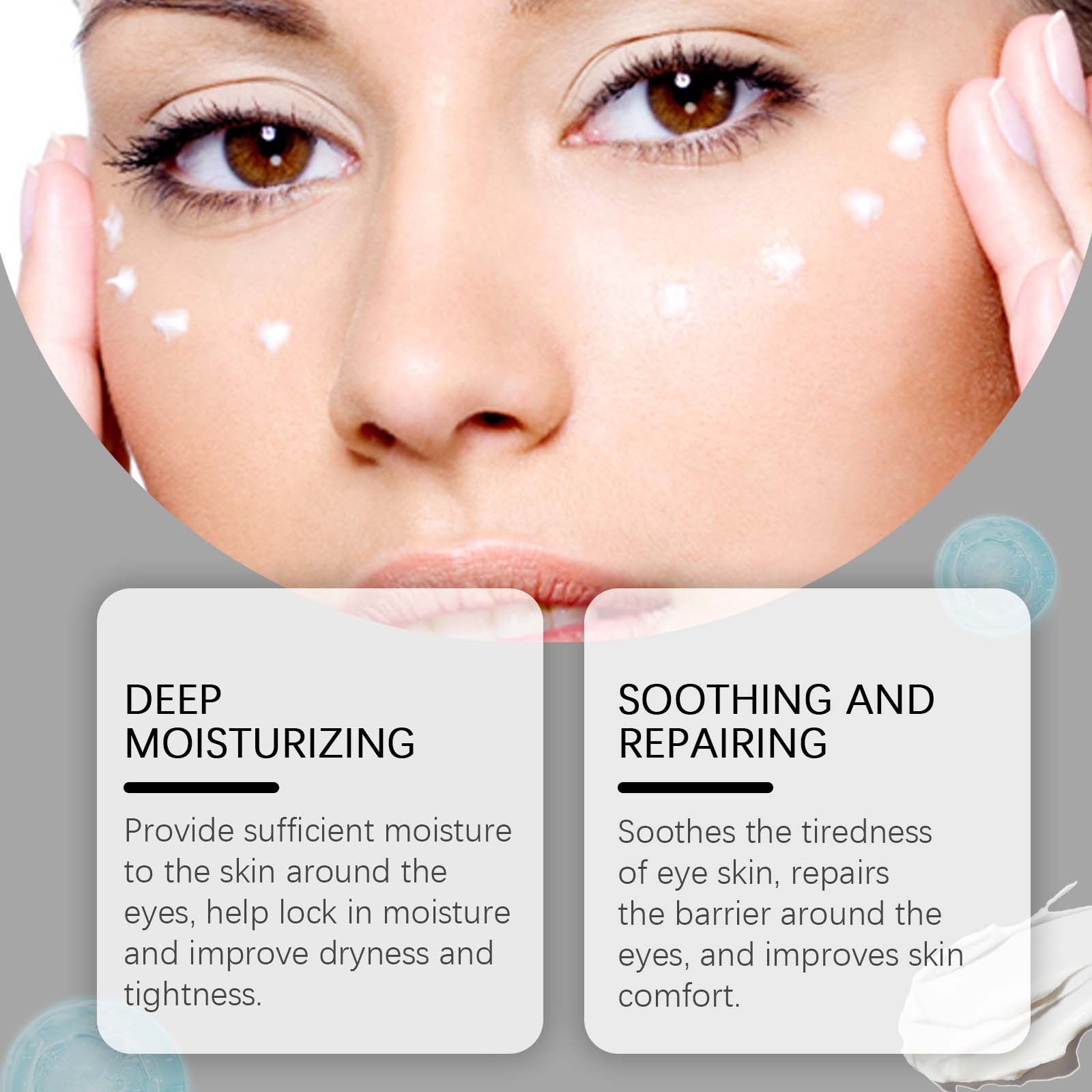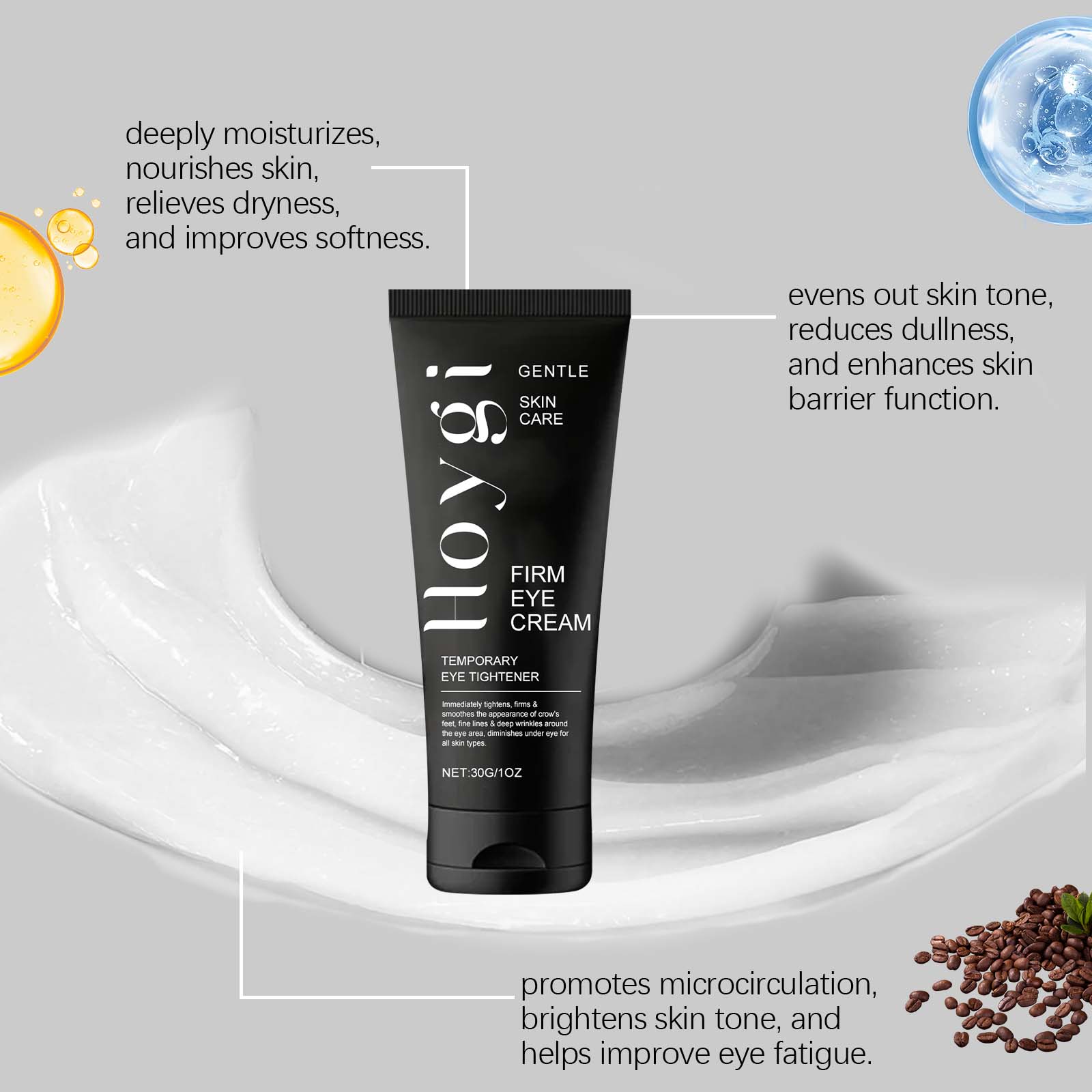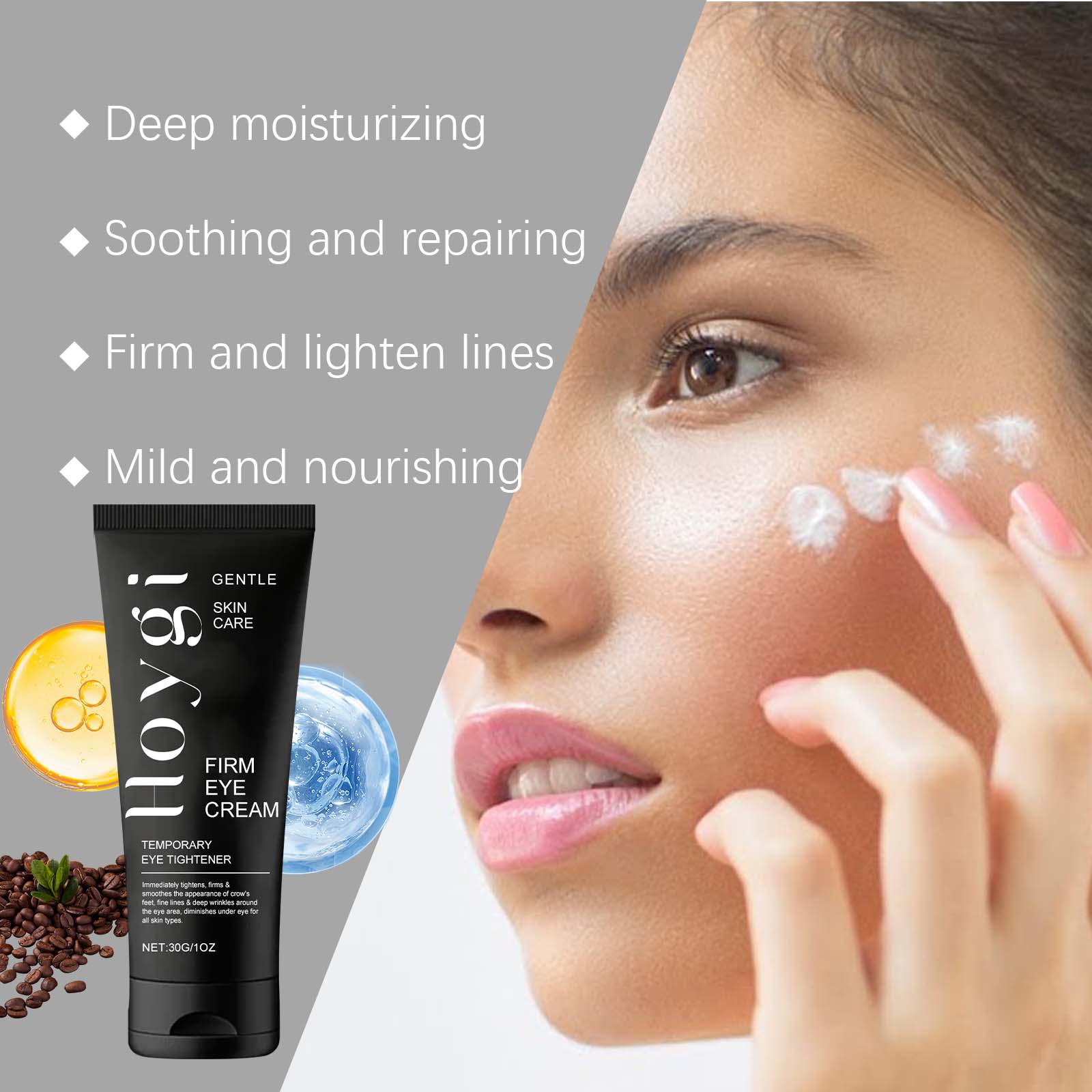 我们的紧致眼霜含有三乙醇胺、咖啡籽提取物、烟酰胺。它可以为眼周肌肤提供充足的水分,帮助锁住水分,改善眼部干燥紧绷。它的使用方法很简单:洁面爽肤后,取一片绿豆大小的眼霜,在指尖上揉搓以加热然后均匀地涂在眼睛周围。从外到内轻轻按摩直到吸收,切勿拉扯皮肤。并且可以舒缓眼部肌肤的疲劳,修复眼部周围的屏障,提高肌肤舒适度。