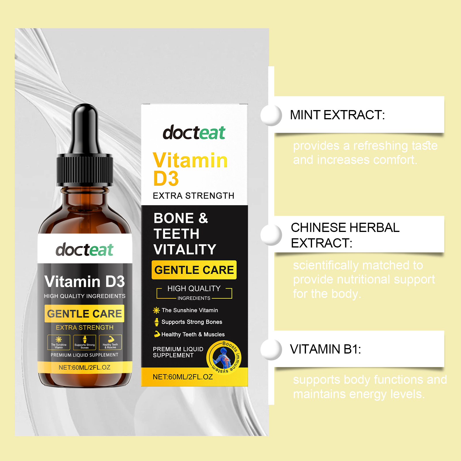 我们的骨骼增强补充滴剂含有薄荷提取液、中药提取物、葡萄糖酸内脂。它可以有助于骨骼健康,并帮助身体稳定地运作。它的使用方法很简单:食用前请先摇匀,每次1-2滴,每日1-2次。并且采用滴包装设计便于携带,并易于融入生活。