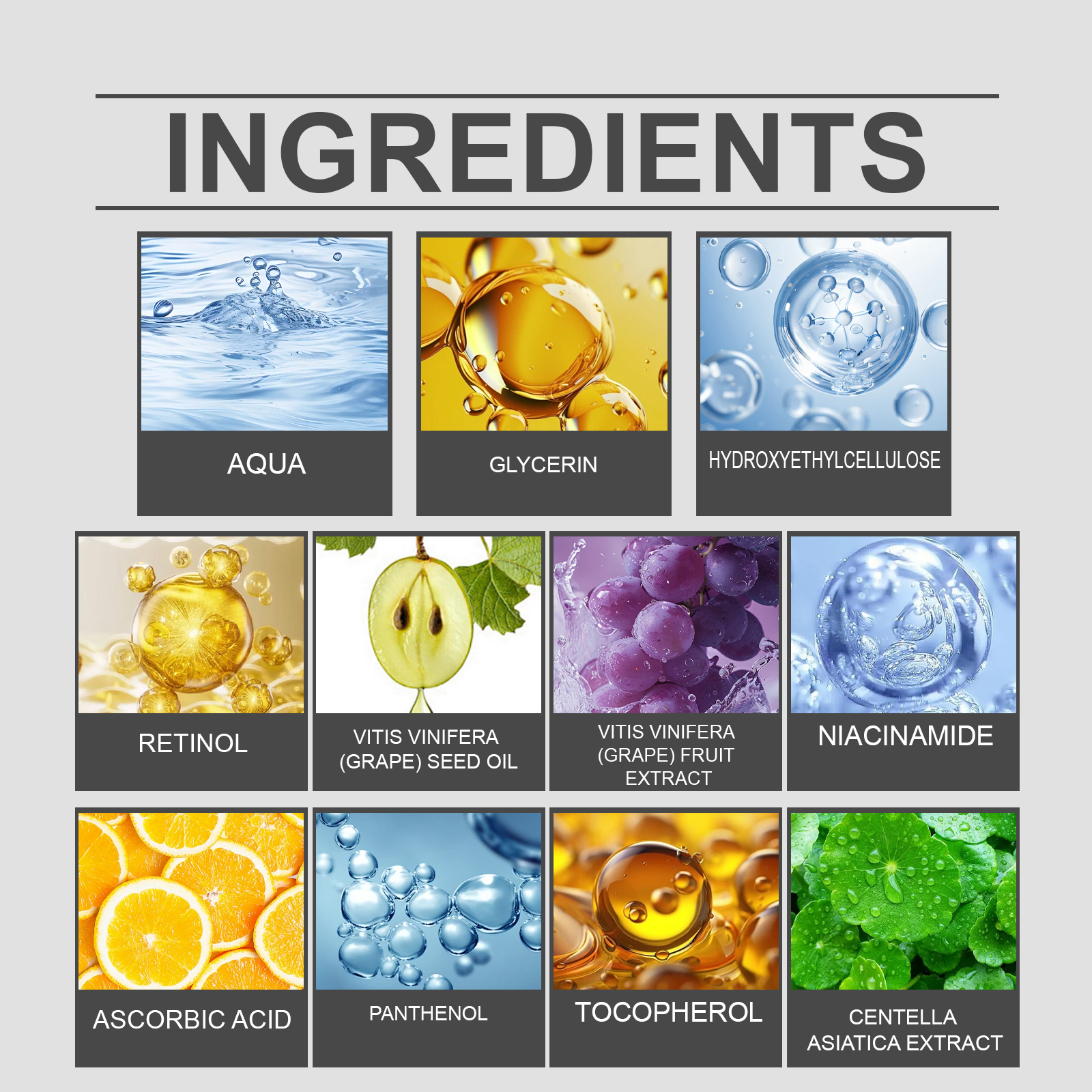 我们的视黄醇面部精华液含有维生素E(生育酚)、积雪草提取物。它可以均匀肤色,展现光彩照人的肌肤。它的使用方法很简单:清洁并擦干你的皮肤。将一泵精华挤在手上,均匀涂抹在脸上。轻轻按摩直至吸收。并且可以深层滋养肌肤并锁住水分。