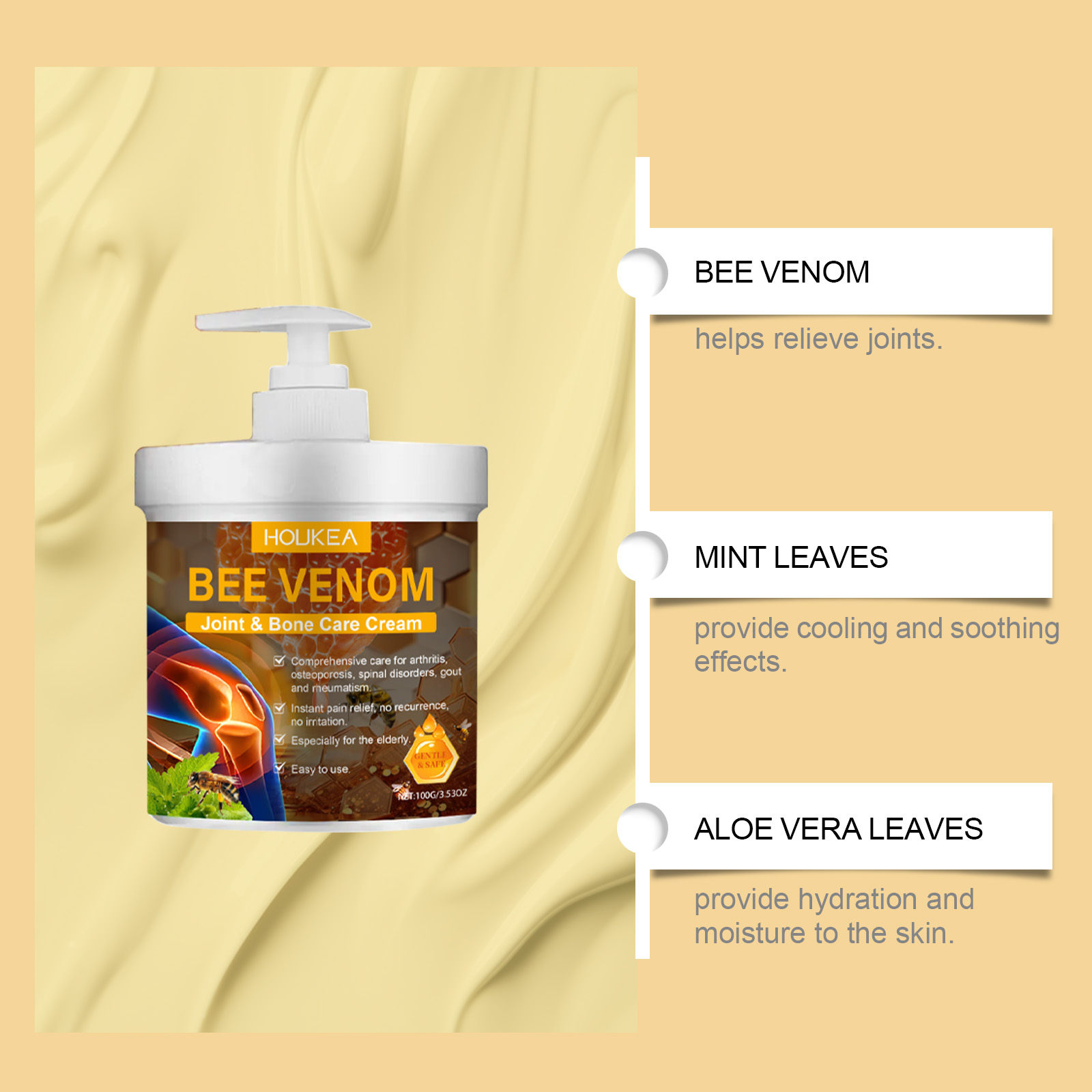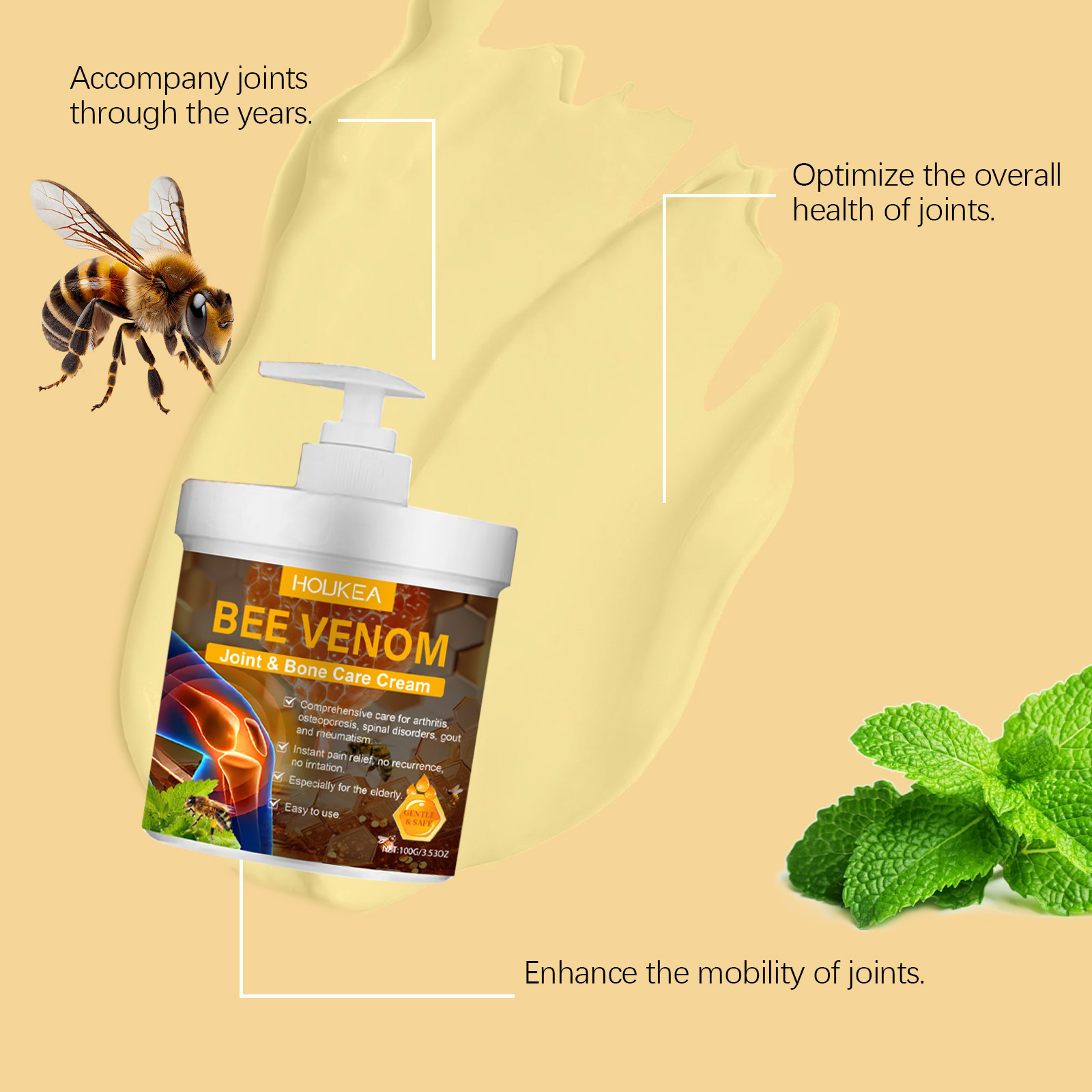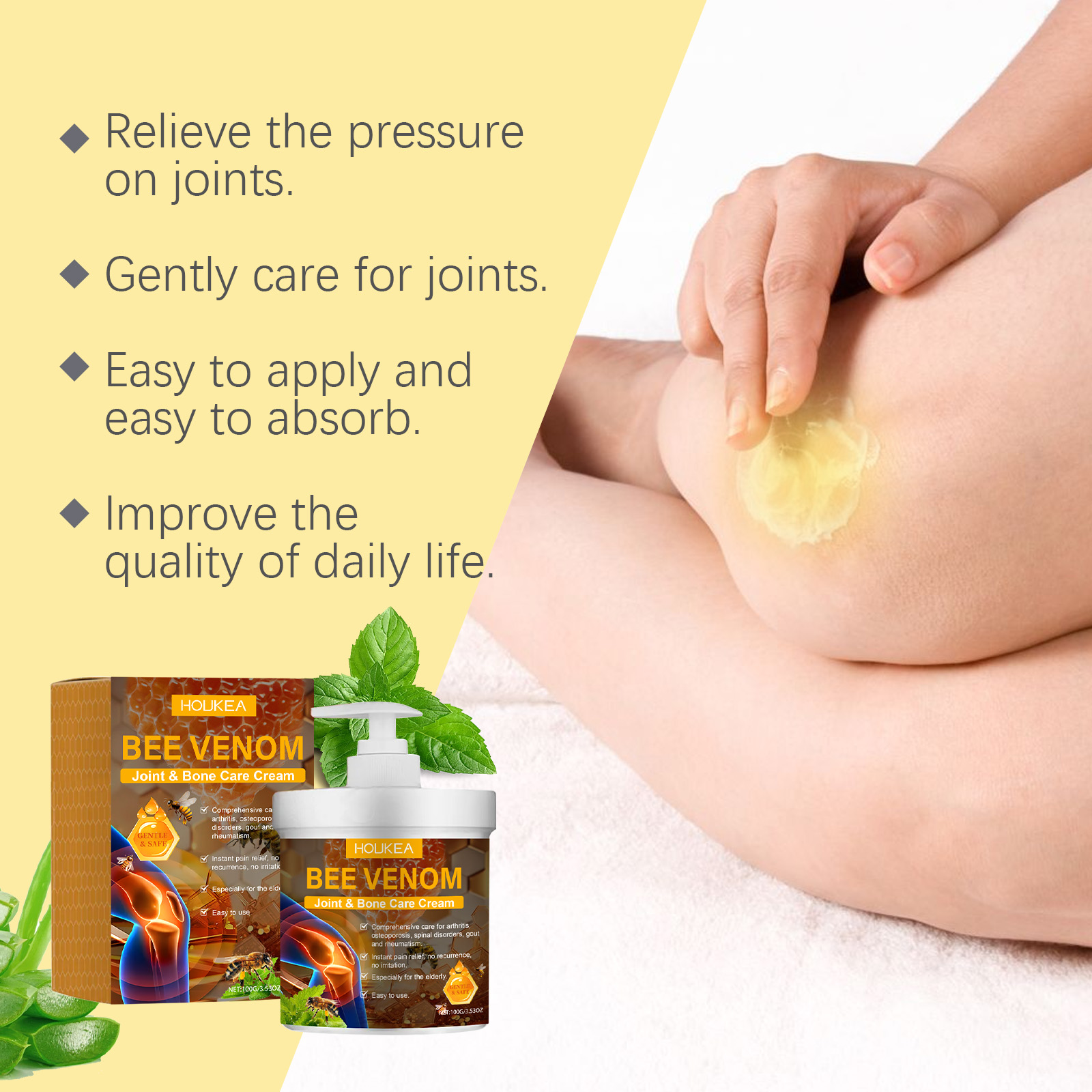我们的蜂毒关节护理霜含有蜂毒、薄荷叶。它可以温和缓解关节不适,帮助关节恢复灵活性。它的使用方法很简单:清洁并干燥皮肤,取适量本品均匀涂抹于关节疼痛的患处,并轻轻按摩至吸收。并且可以促进关节弹性的逐渐恢复。