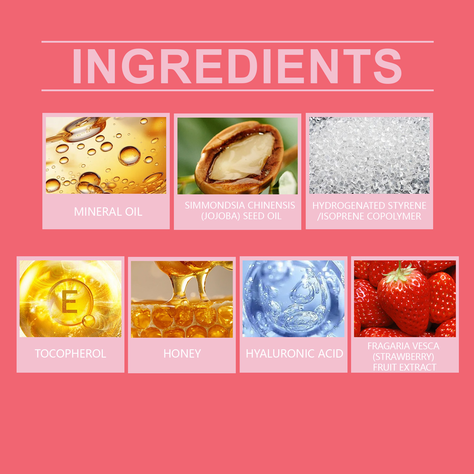 我们的草莓味滋润唇油含有矿油、霍霍巴籽油。它可以长时间锁住水分,保持嘴唇柔软和滋润。嘴唇光滑有光泽,增强自然美感。它的使用方法很简单:彻底清洁唇部皮肤并先将其擦干,取适量本品均匀涂抹于唇部肌肤部位。并且可以无刺激性,适合所有唇型。