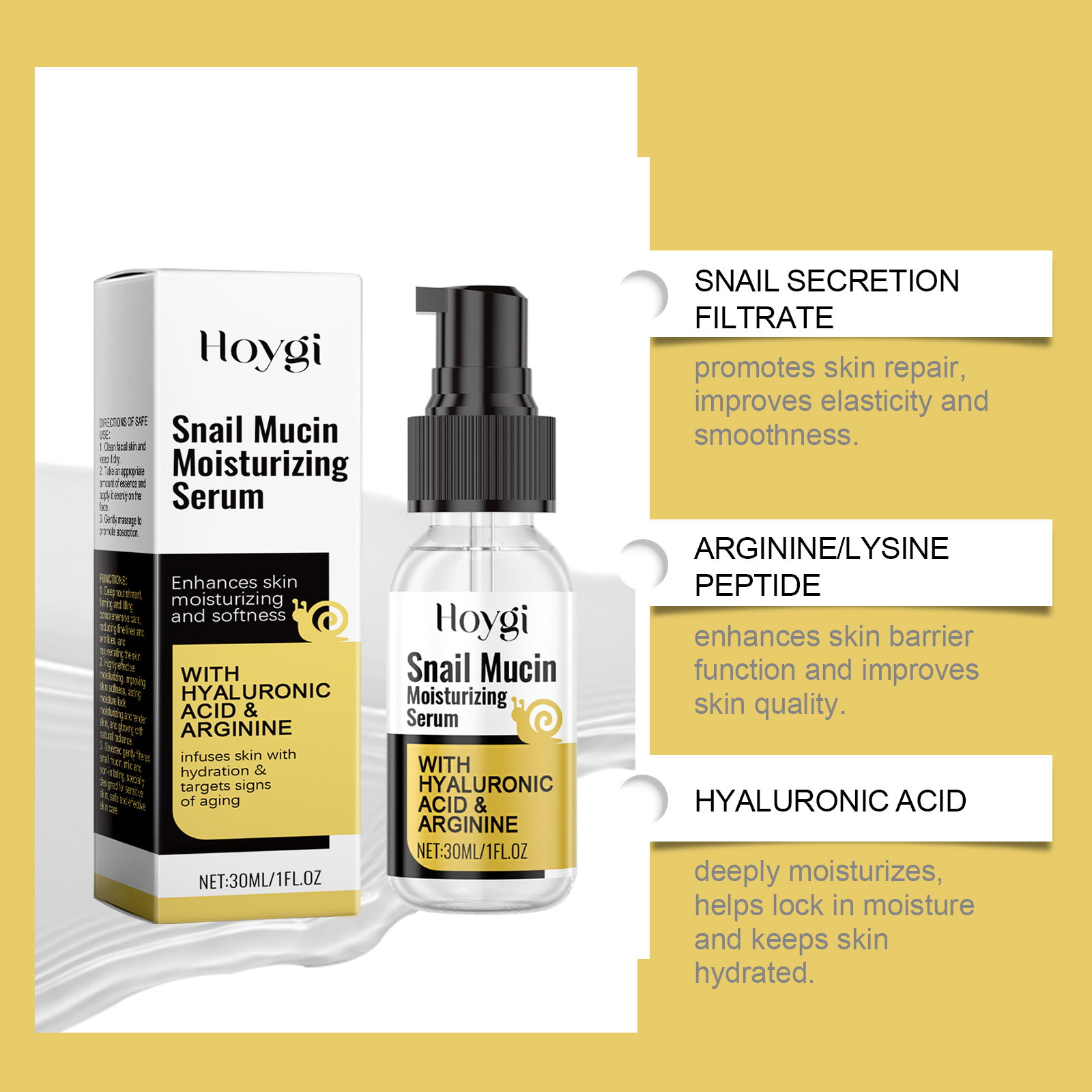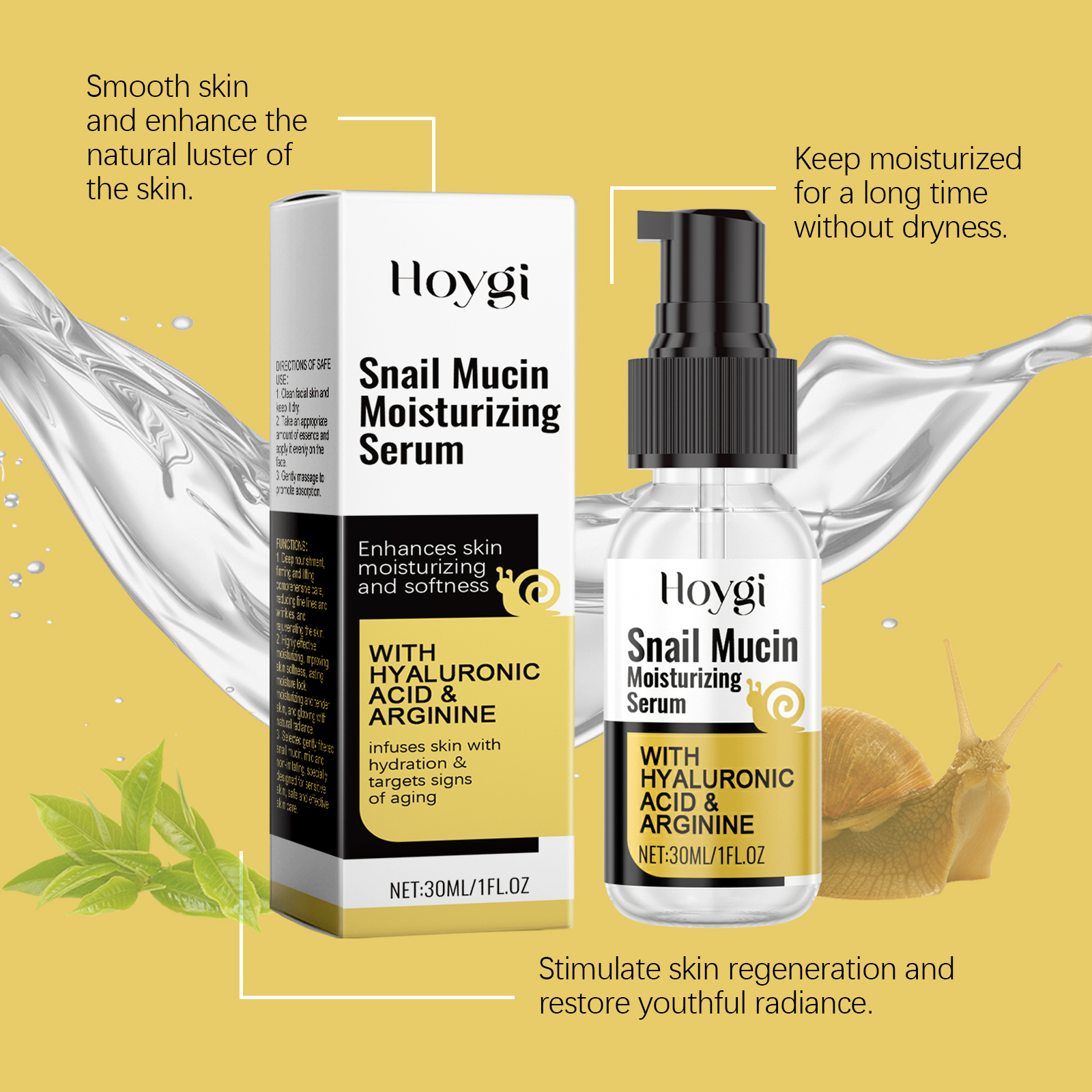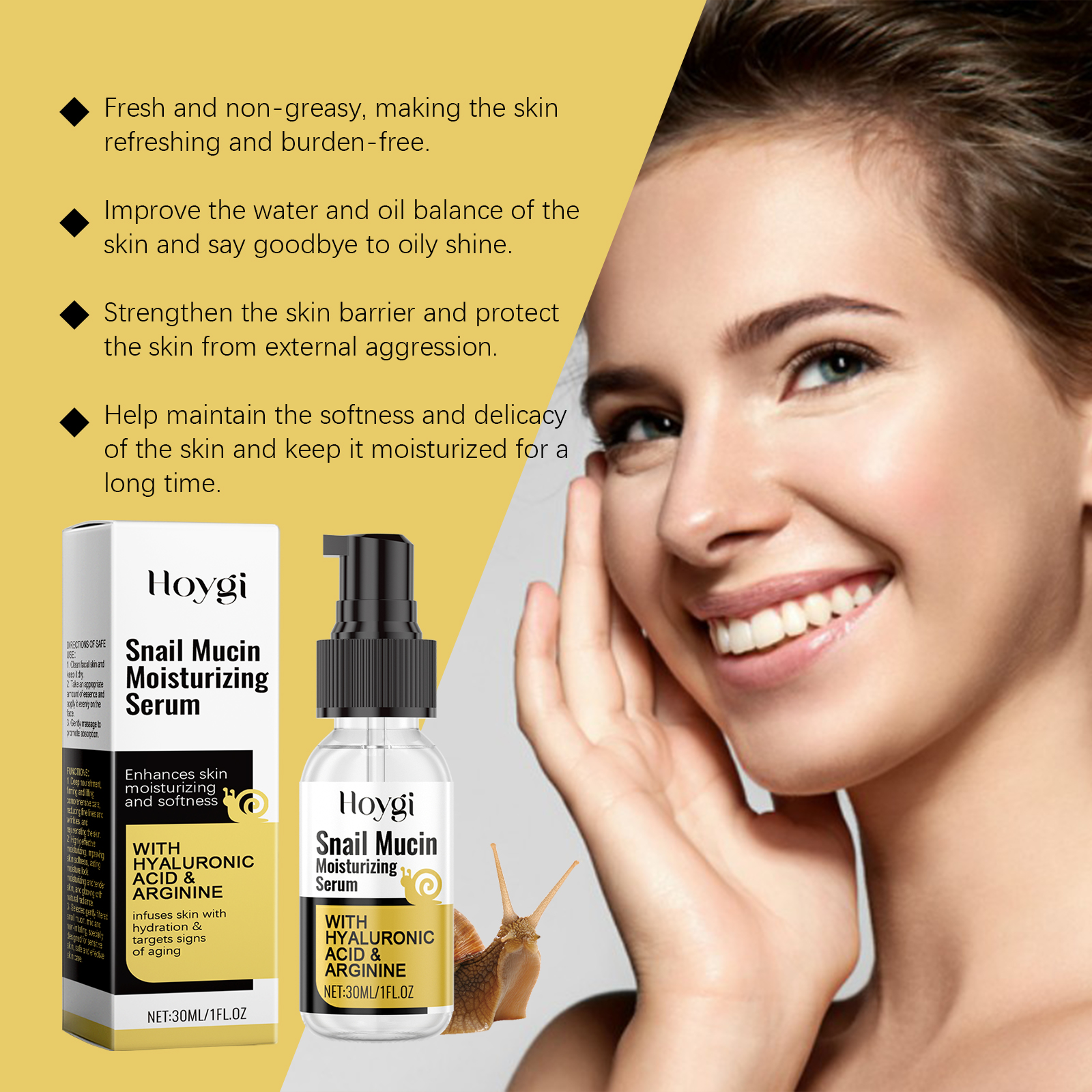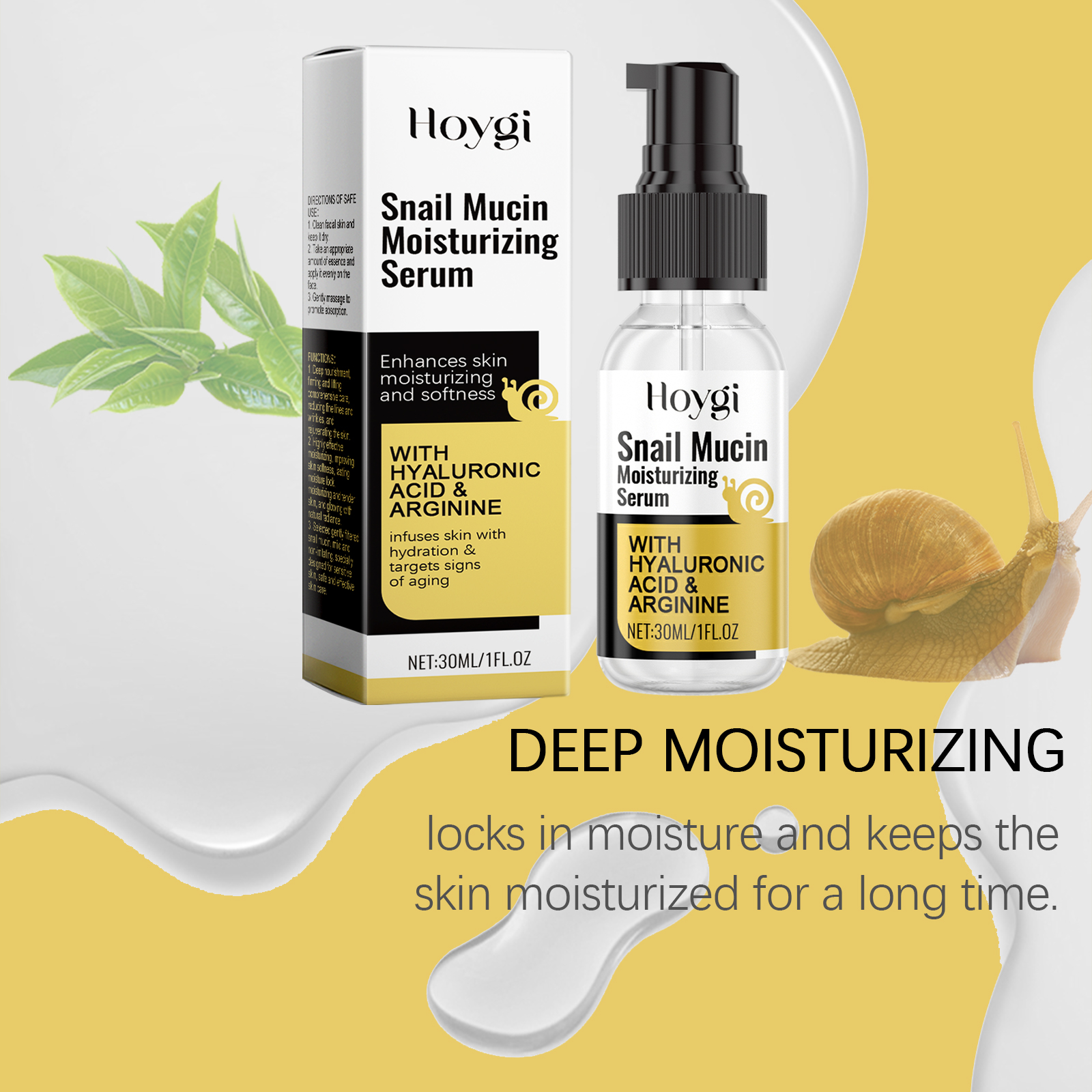我们的蜗牛保湿精华液含有甘油、羟乙基纤维素。它可以使皮肤看起来更光滑、更细腻。适合所有肤质。它的使用方法很简单:清洁面部皮肤并保持干燥。取适量精华均匀涂抹于面部。轻轻按摩以促进吸收。并且可以帮助改善皮肤细纹,并恢复弹性。