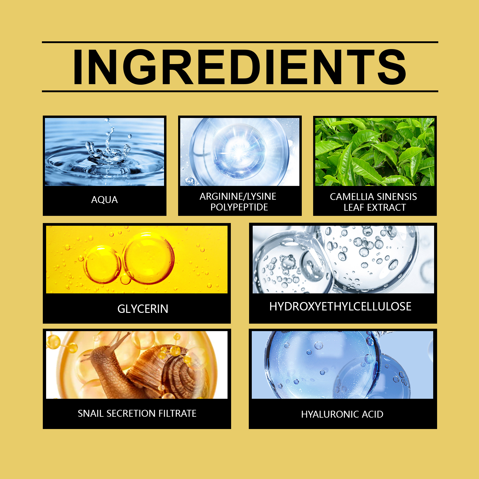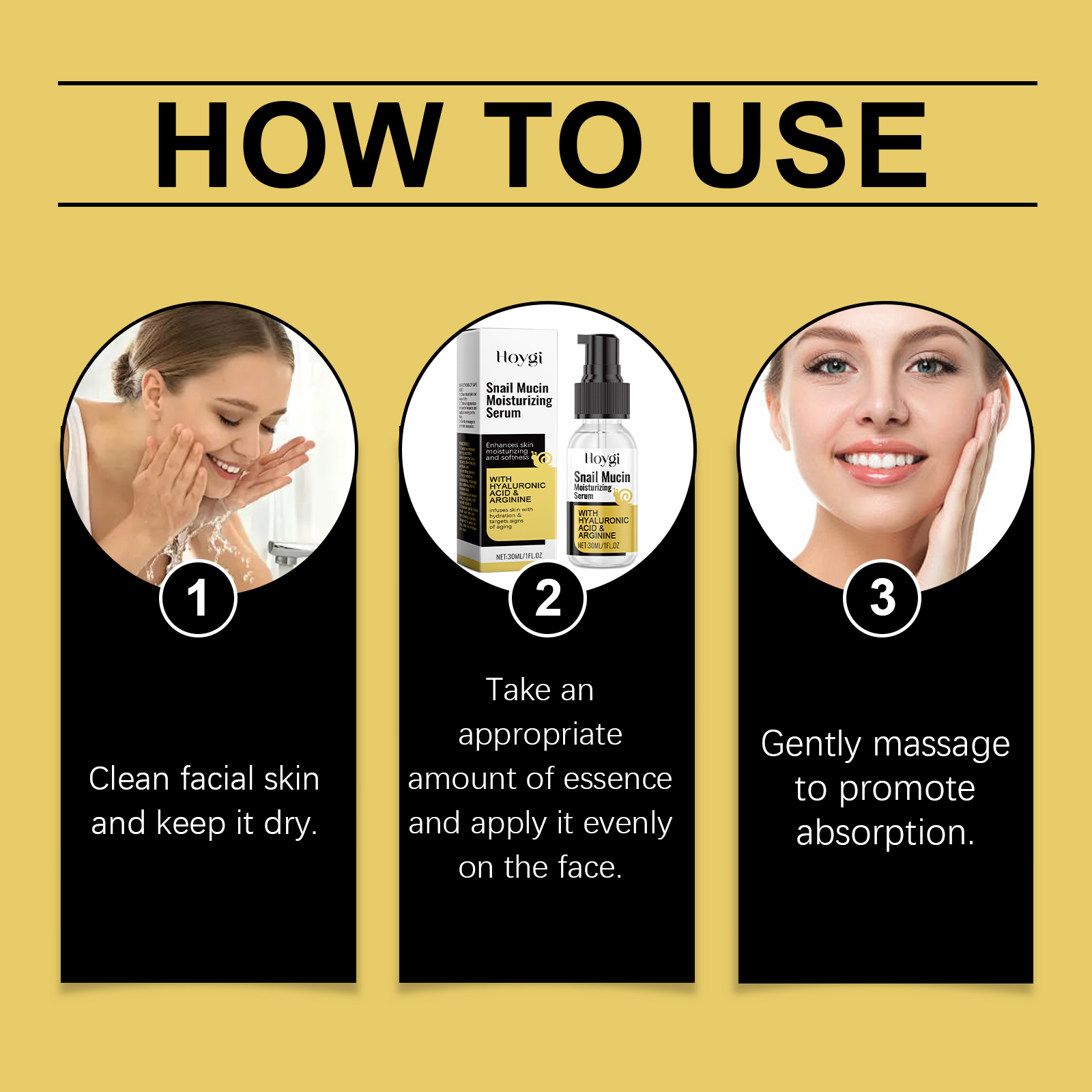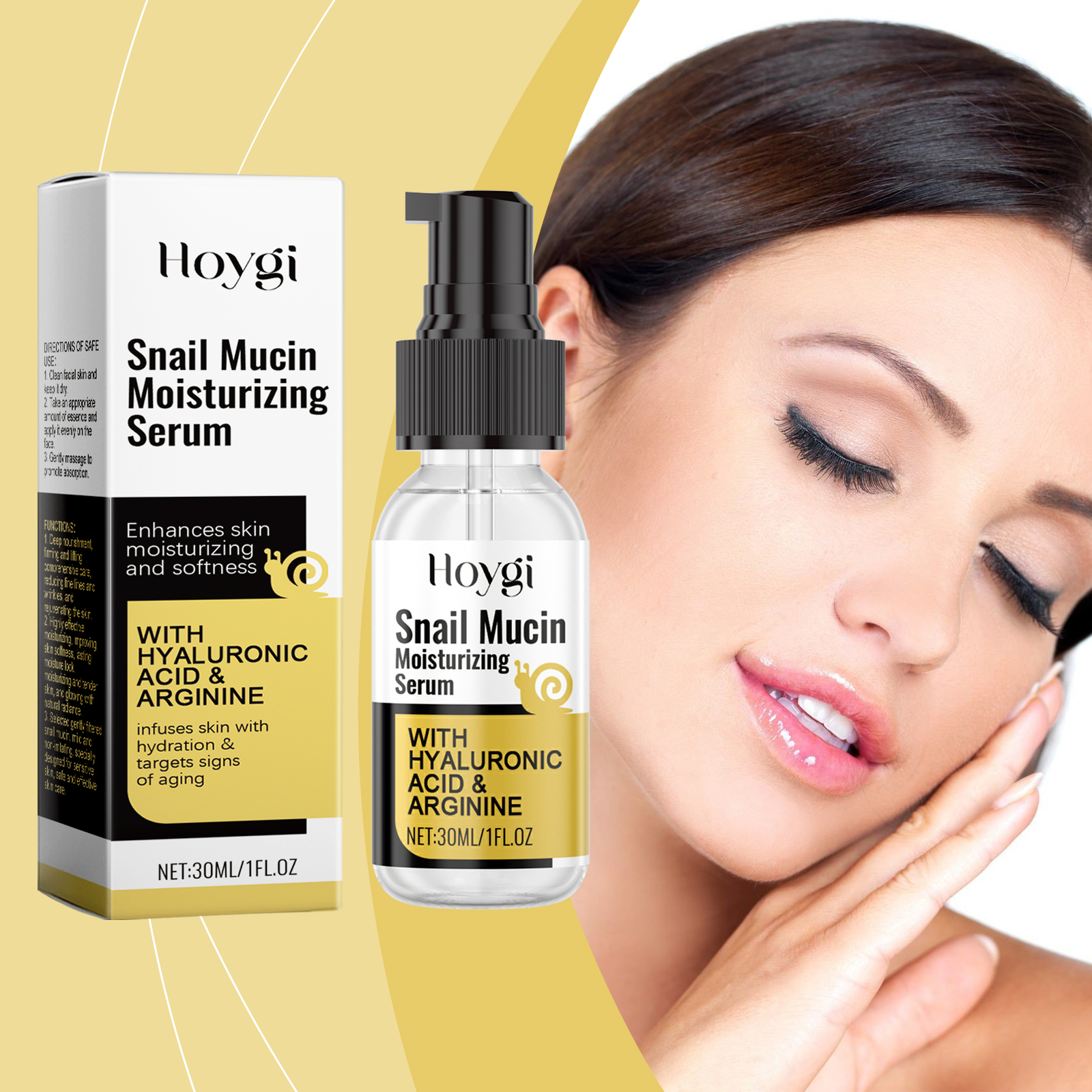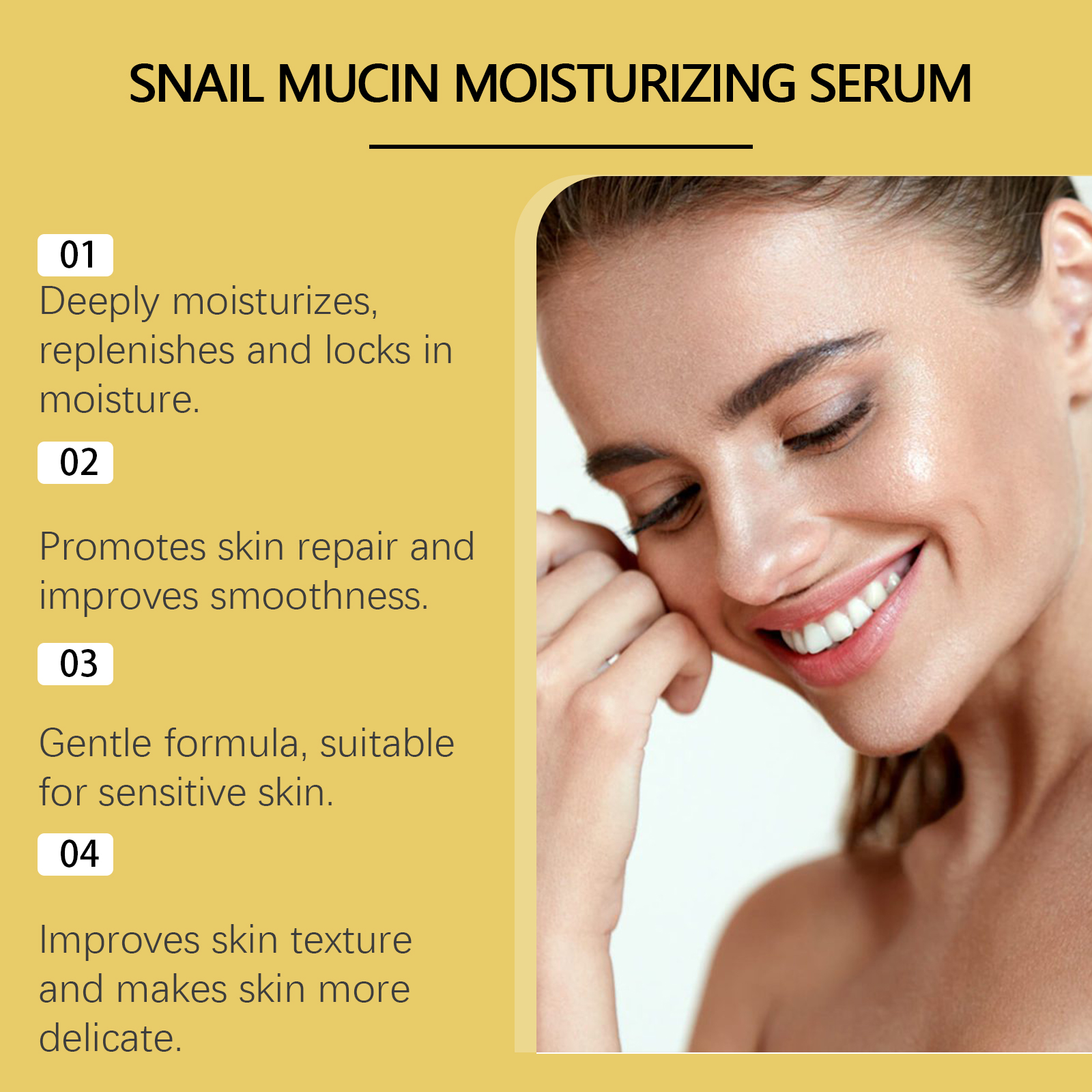 我们的蜗牛保湿精华液含有甘油、羟乙基纤维素。它可以使皮肤看起来更光滑、更细腻。适合所有肤质。它的使用方法很简单:清洁面部皮肤并保持干燥。取适量精华均匀涂抹于面部。轻轻按摩以促进吸收。并且可以帮助改善皮肤细纹,并恢复弹性。