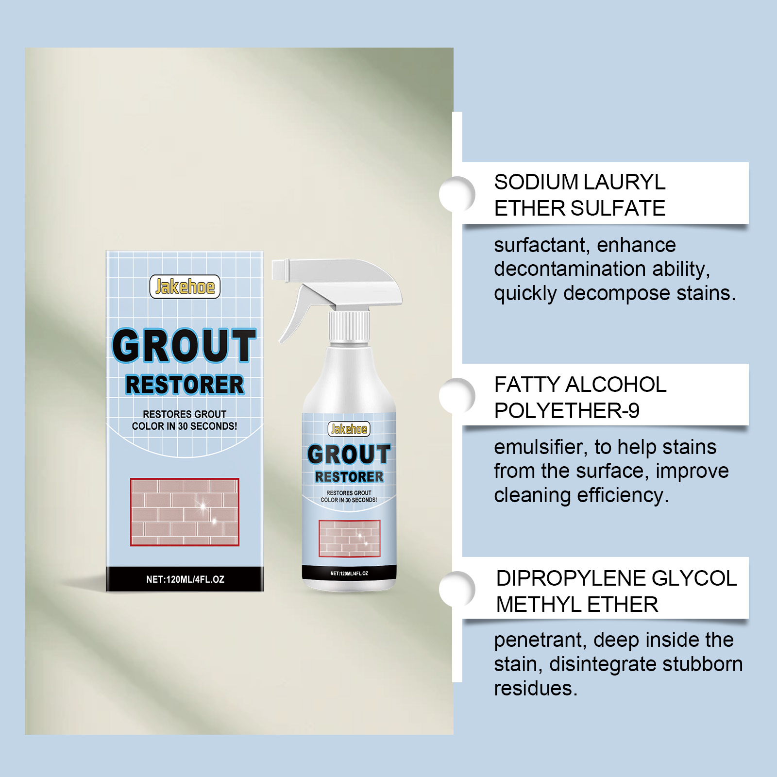 我们的灌浆清洁剂含有葡萄糖酸钠、EDTA 二钠、柠檬酸。它可以在短时间内清除,而接缝线可以恢复到原来的状态。它的使用方法很简单:将产品涂在瓷砖的接缝处,等待2-3分钟,让产品渗透,用软刷或牙刷轻轻擦洗接缝,以去除顽固的污渍,用清水彻底冲洗或擦拭该区域。并且采用强效配方,旨在处理顽固污渍,确保每次使用都能彻底清洁。
