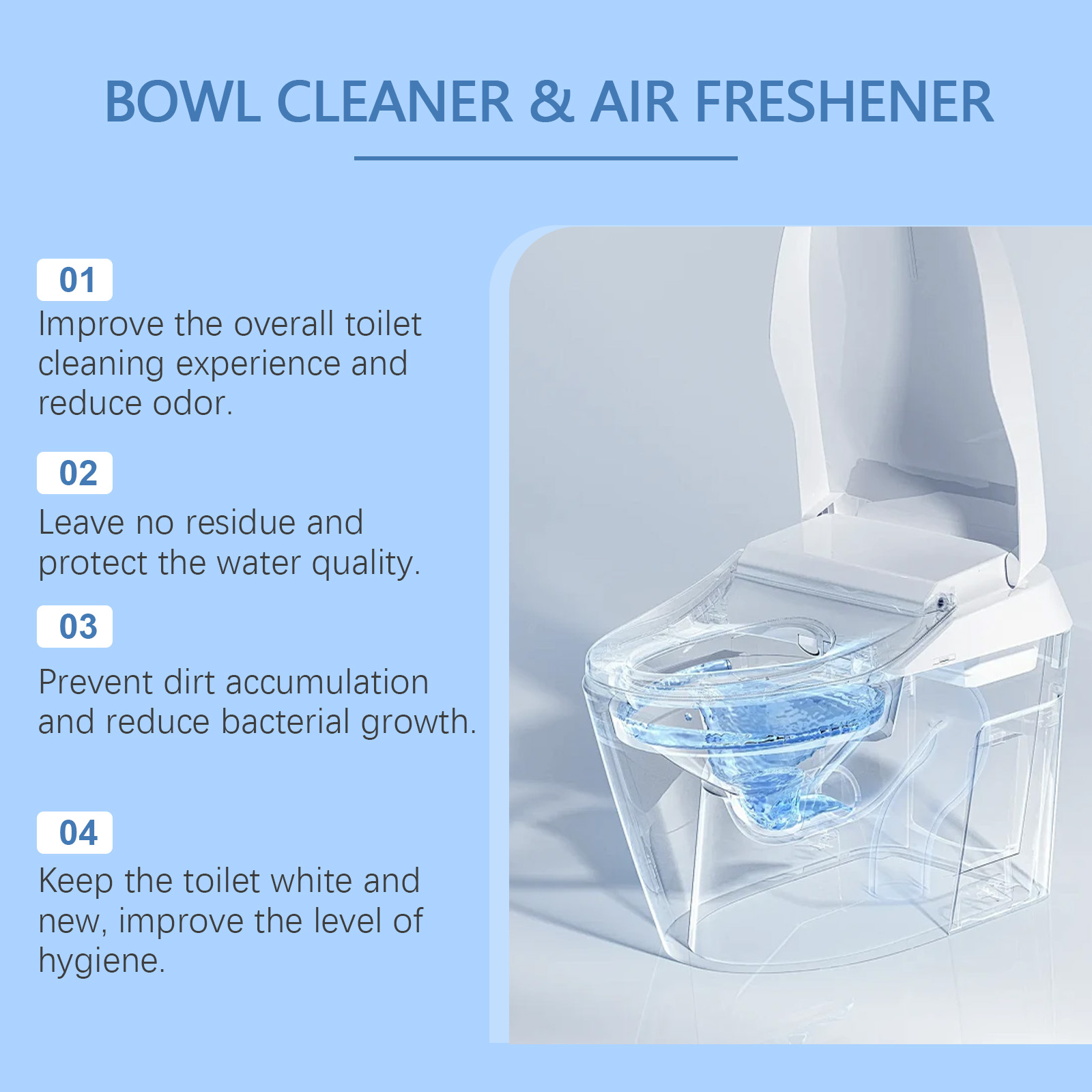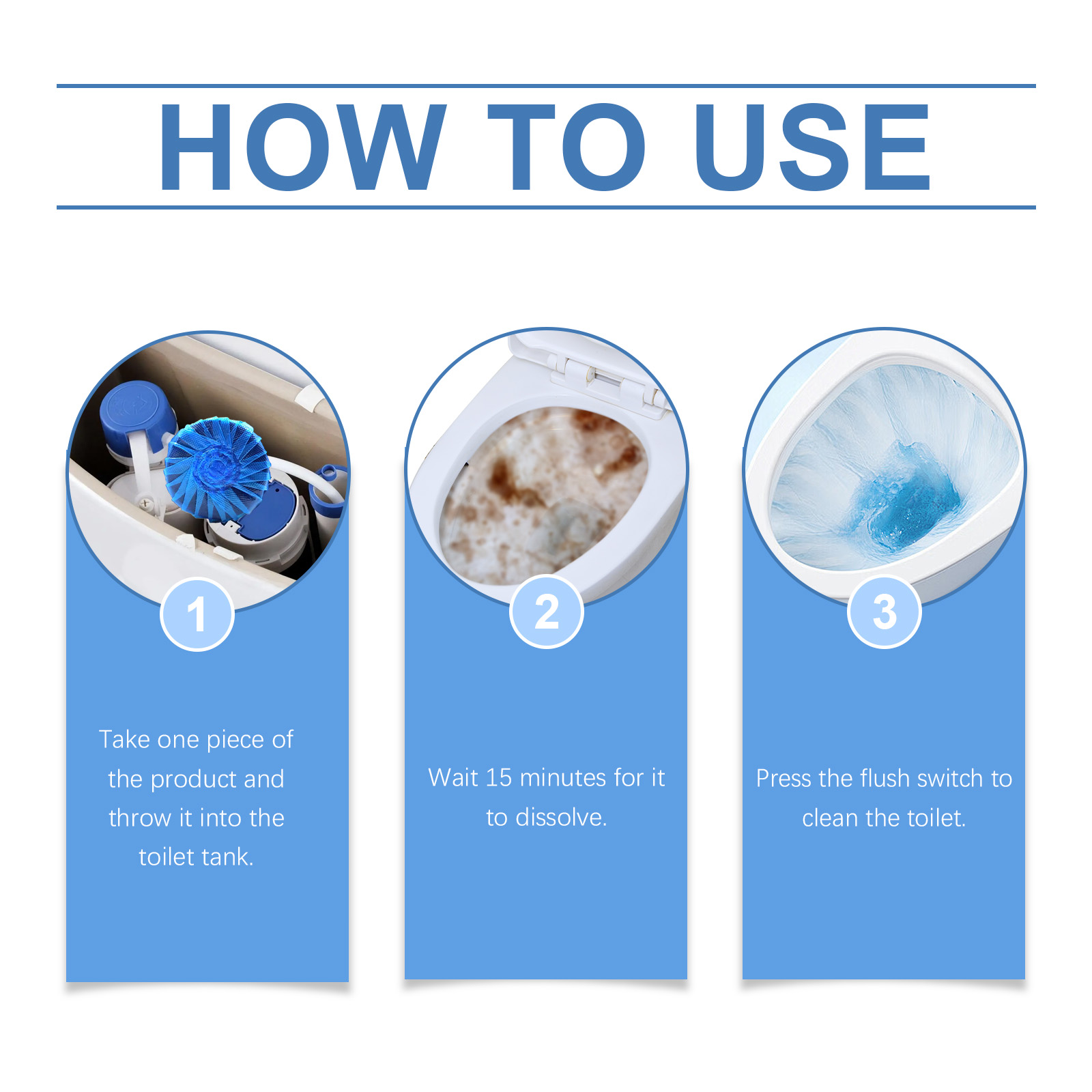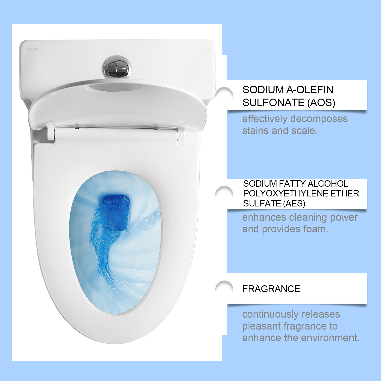 我们的马桶清洁块含有粘度剂、染料、香精。它可以去除污渍并保持马桶清洁。它的使用方法很简单:取出一片产品,扔进马桶水箱。等待15分钟使其溶解,按下冲水开关以清洁马桶。并且可以持续释放新鲜香气,改善浴室环境。