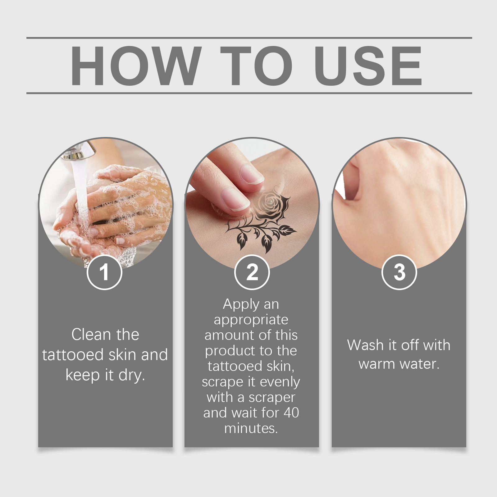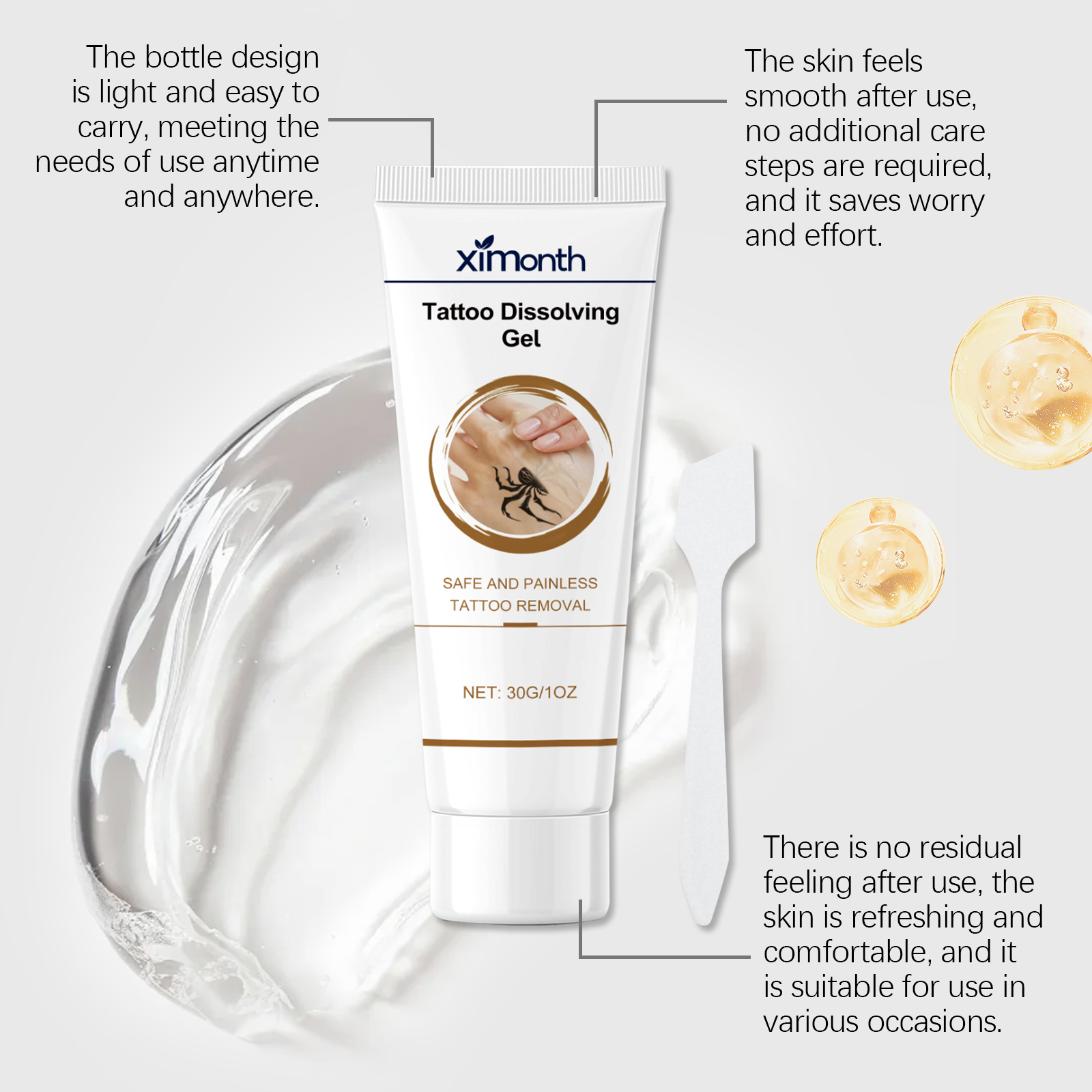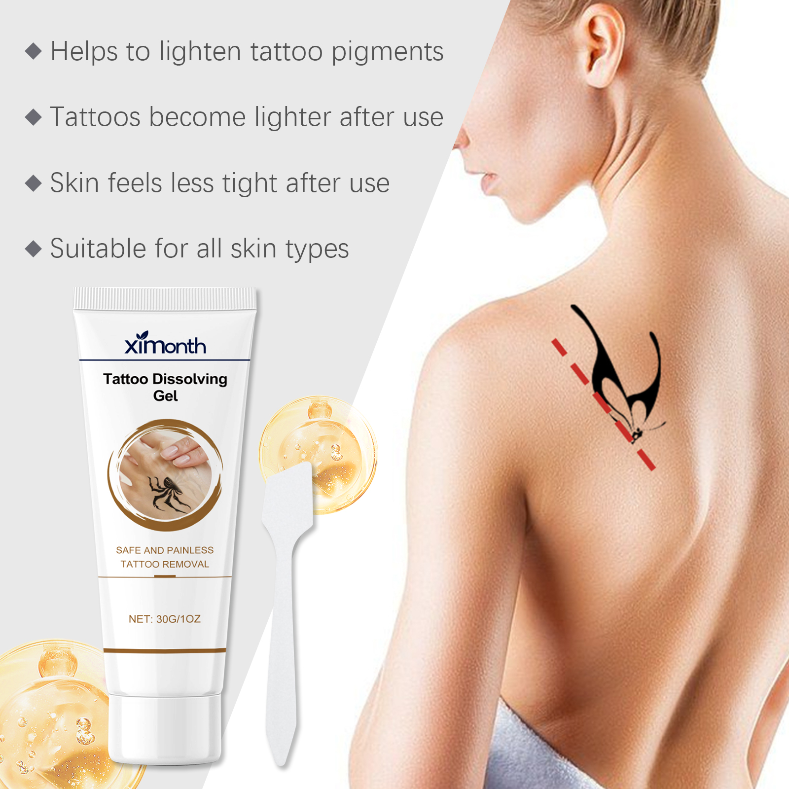 我们的纹身凝胶含有甘油、丁二醇。它可以专为皮肤护理设计使用后无紧绷感,适合日常护理需求。添加多种舒缓成分使用后肌肤光滑细腻,焕发健康光泽。它的使用方法很简单:清洁纹身皮肤并保持干燥。将适量的本品涂抹在纹身皮肤上,用刮刀均匀刮擦等待40分钟。用温水洗净。并且可以有助于纹身颜料逐渐变淡,使用后纹身外观显著改善。