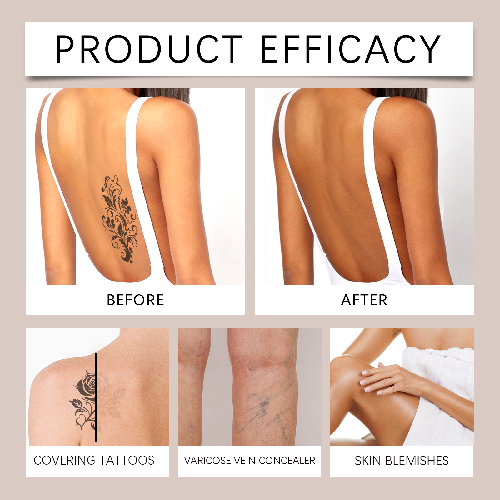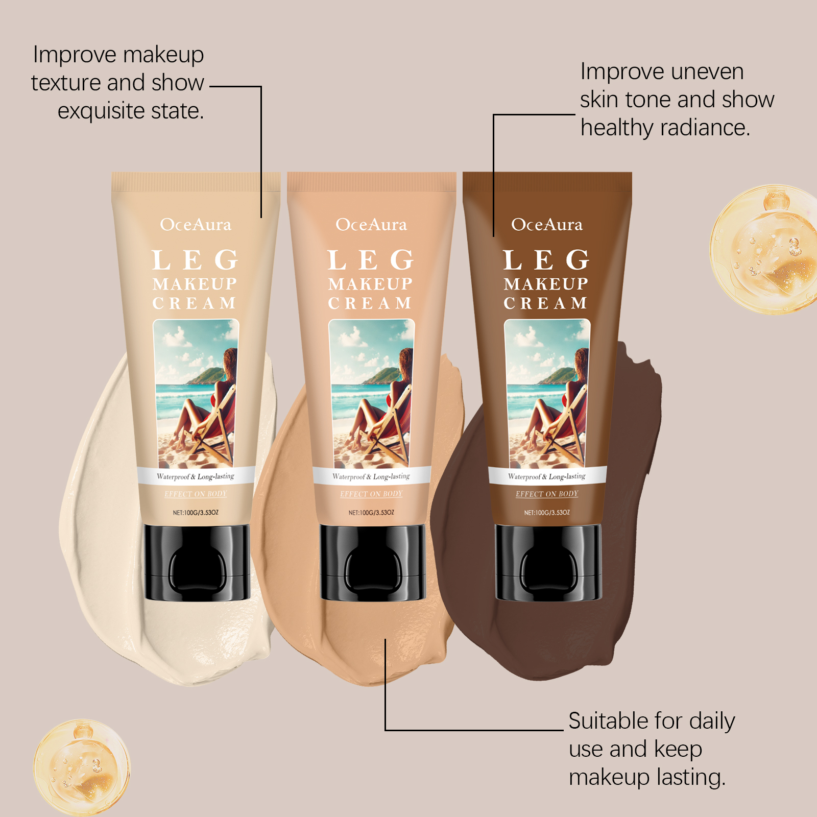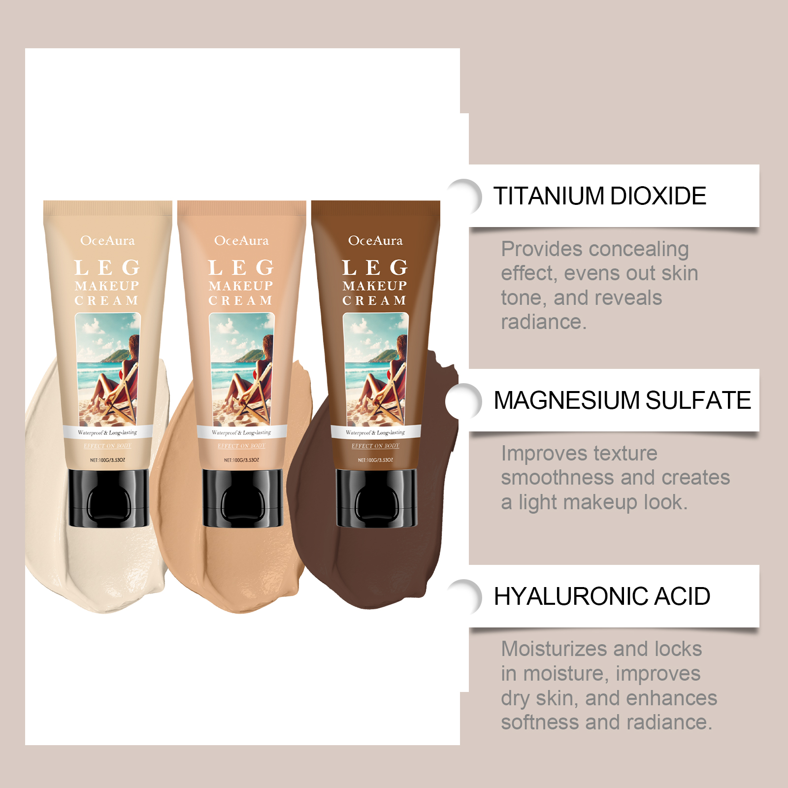 我们的身体助黑粉底霜,由硫酸镁、透明质酸精心调配而成。专为遮盖纹身和瑕疵,显示均匀的肤色设计。使用方法极为便捷:清洁皮肤并保持干燥。将适量的本品均匀涂抹在需要化妆的腿部或身体其他部位的皮肤上。轻轻按摩直至吸收。并且清新而不厚重,使用后舒适且不粘腻。