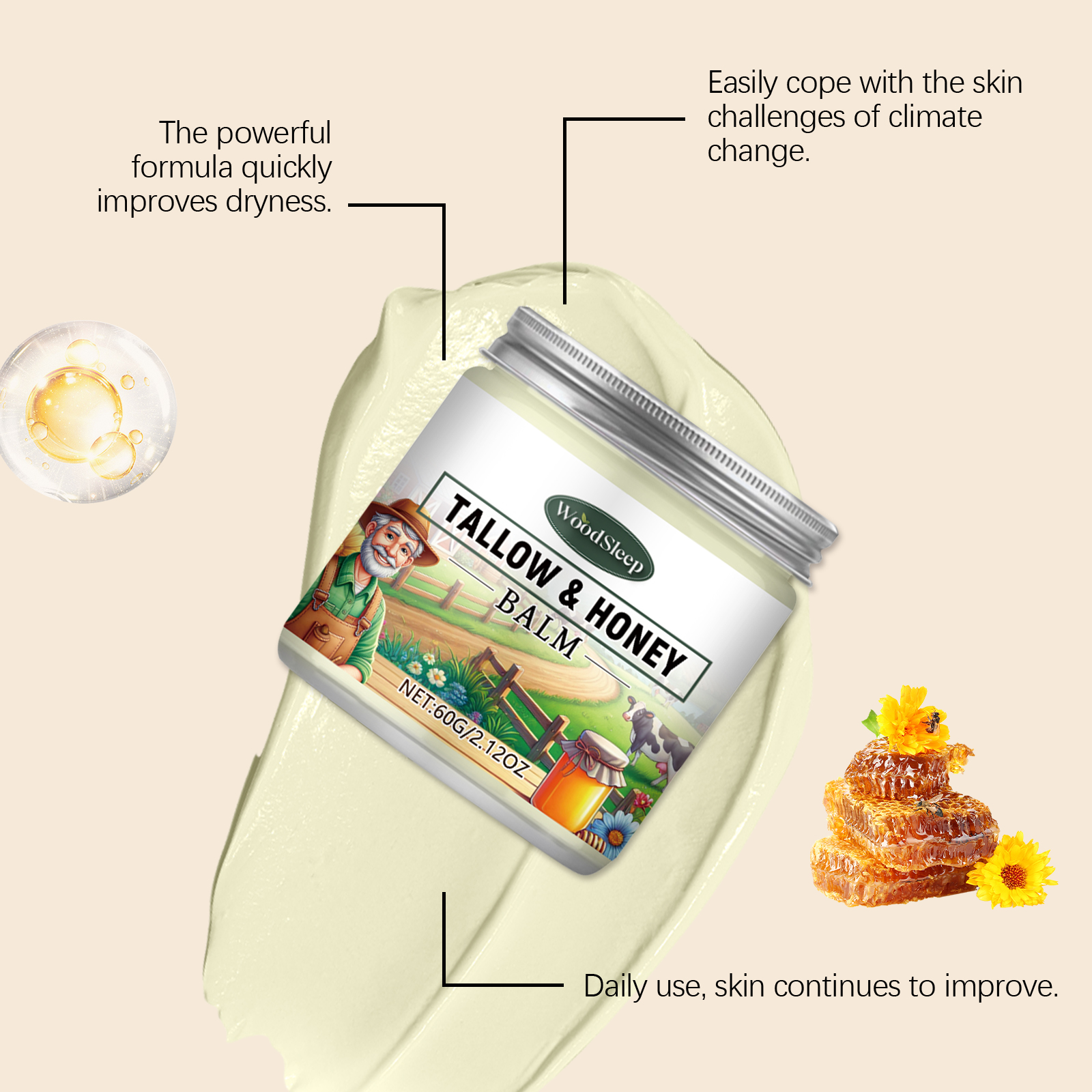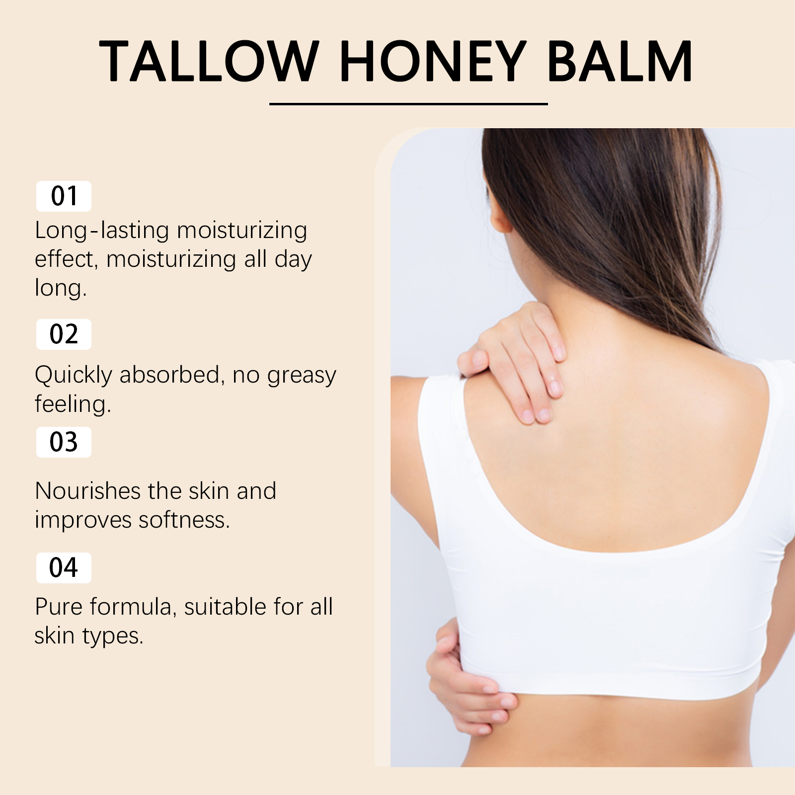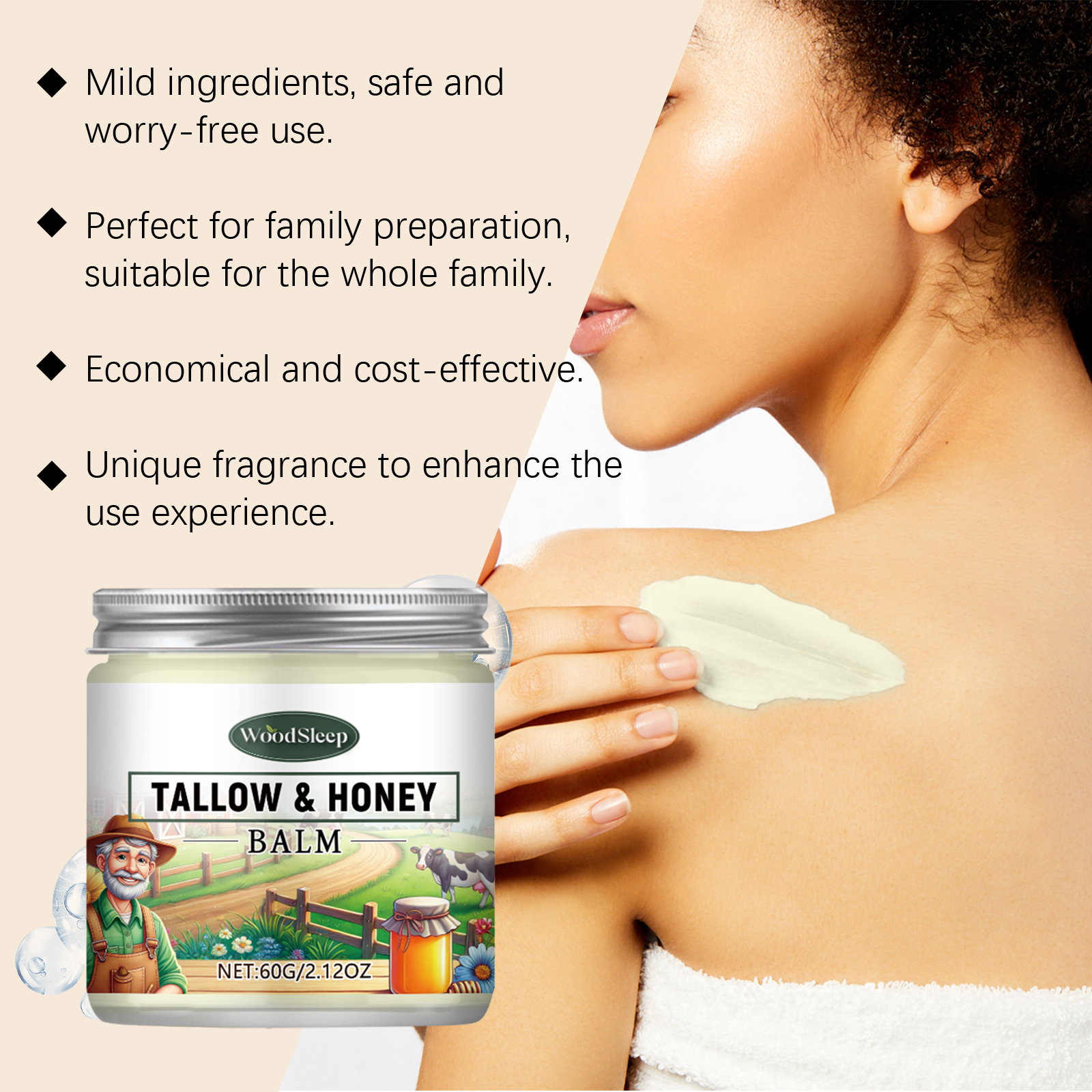 我们的牛脂蜂蜜保湿霜,由甘油、鲸蜡硬脂醇、甘油硬脂酸酯精心调配而成。专为有效锁住水分,使皮肤长时间保持滋润设计。使用方法极为便捷:清洁并擦干皮肤。涂抹适量于身体。轻轻按摩以促进吸收。并且天然成分带来不可思议的柔软和细腻触感。适合频繁使用且无刺激性。
