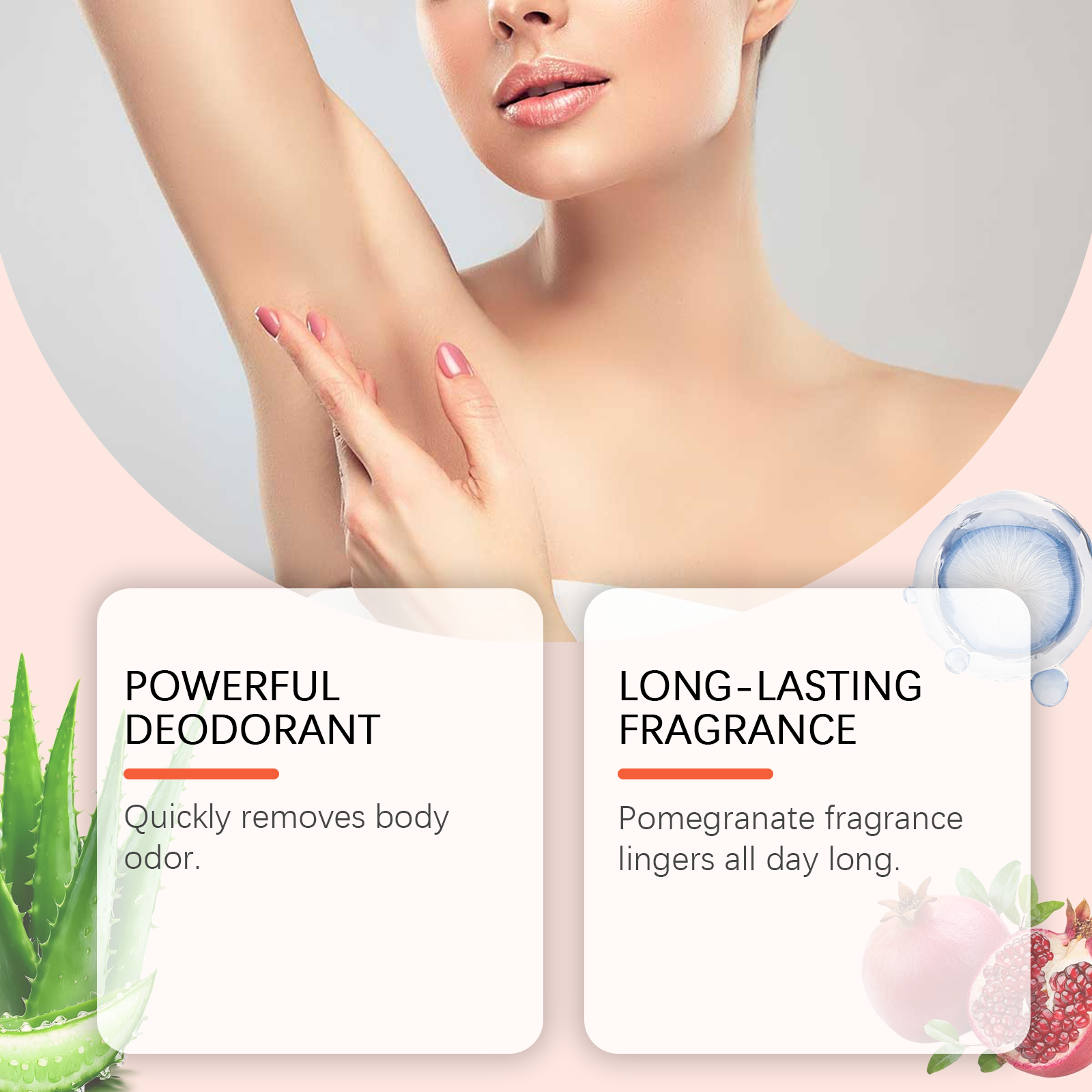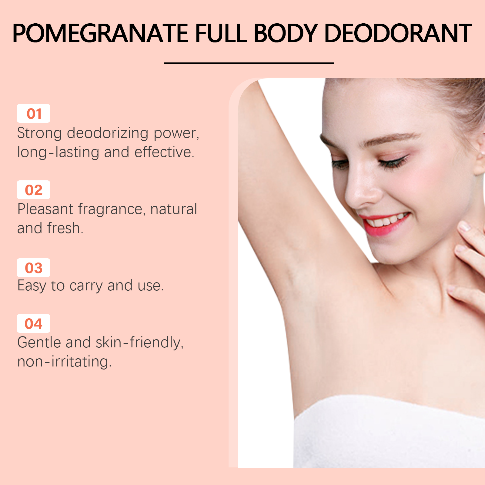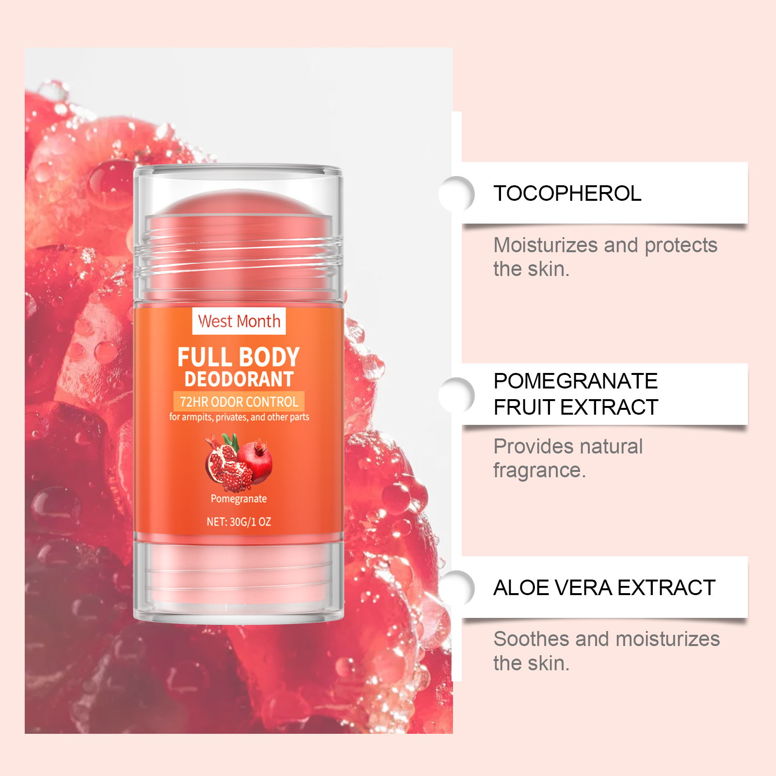 我们的身体石榴香体棒,由迷迭香叶油、库拉索芦荟提取物精心调配而成。专为快速去除体臭设计。使用方法极为便捷:清洁并擦干你的皮肤。旋出适量本品,均匀涂抹在腋下皮肤上。等待其吸收。并且可以整天持久留香。