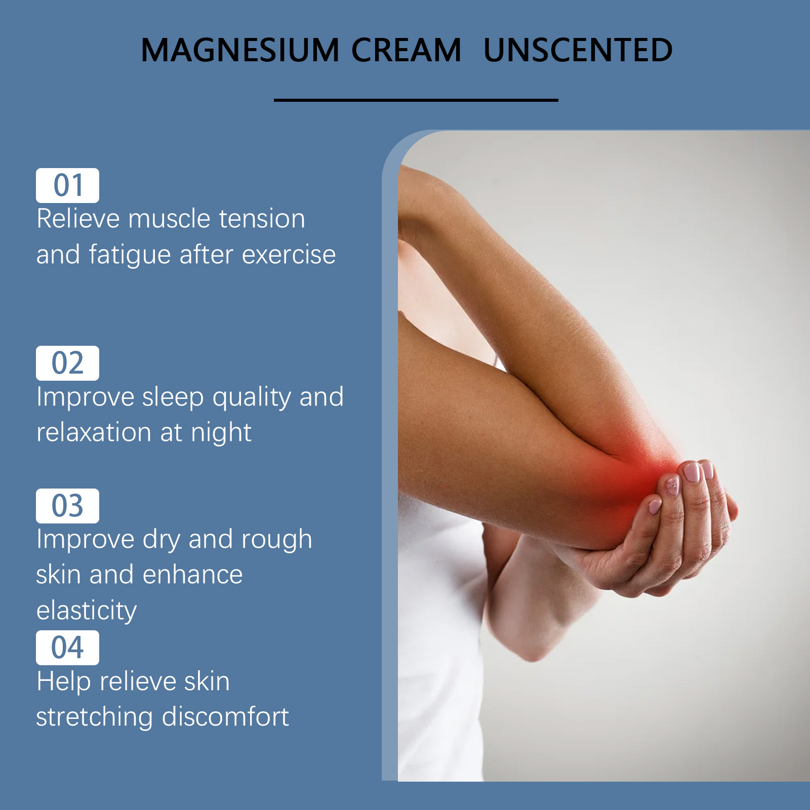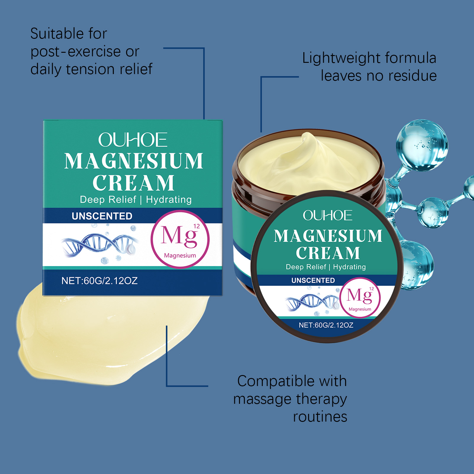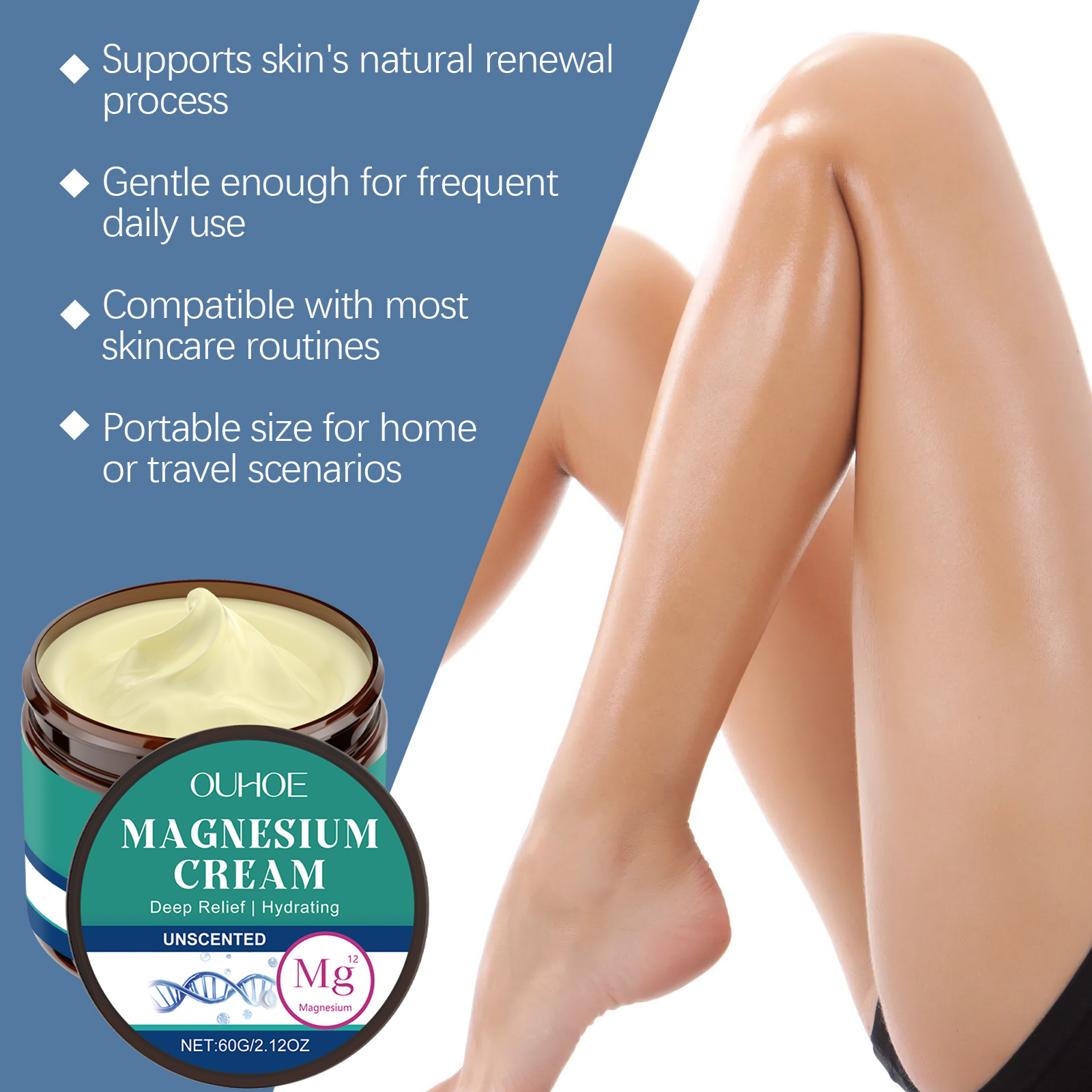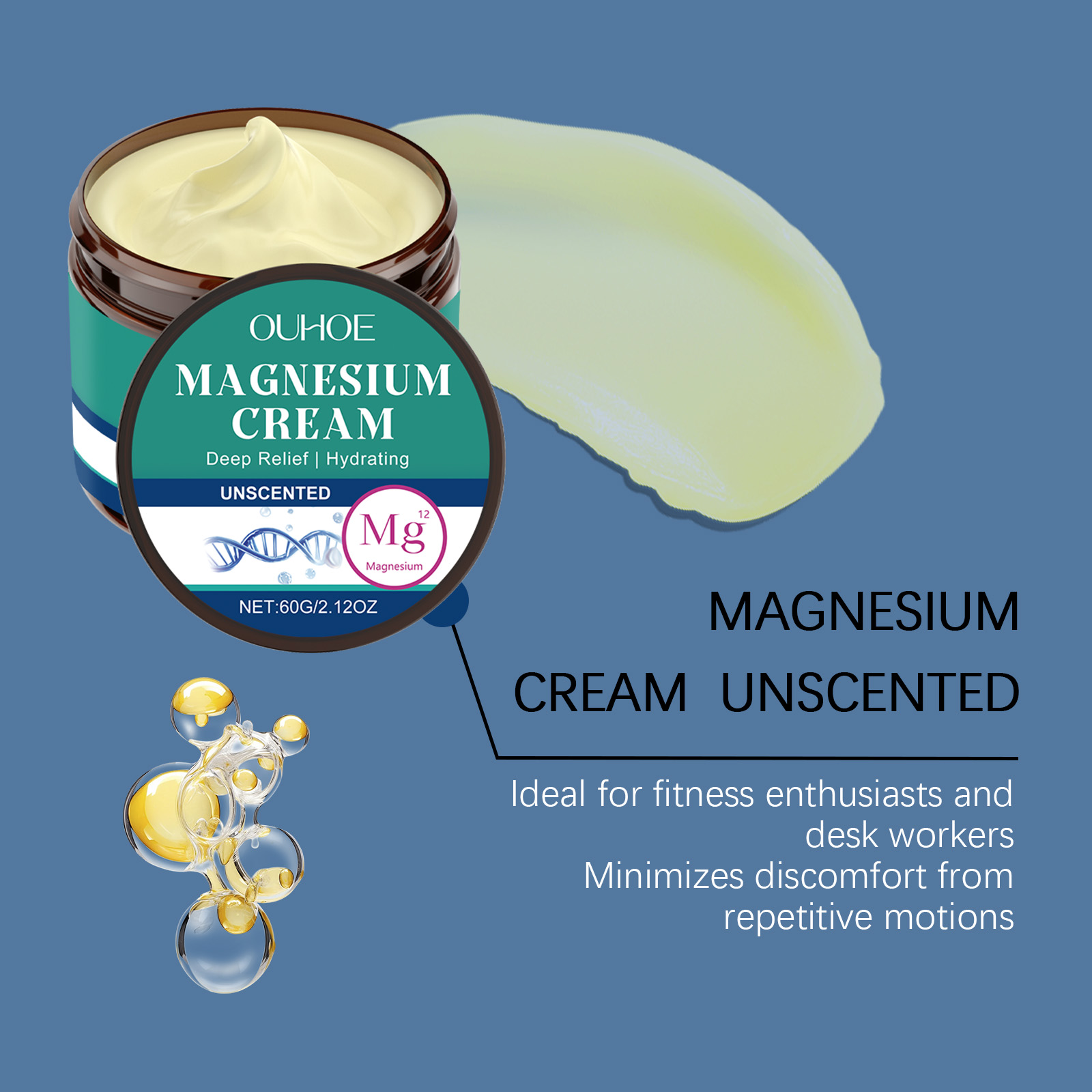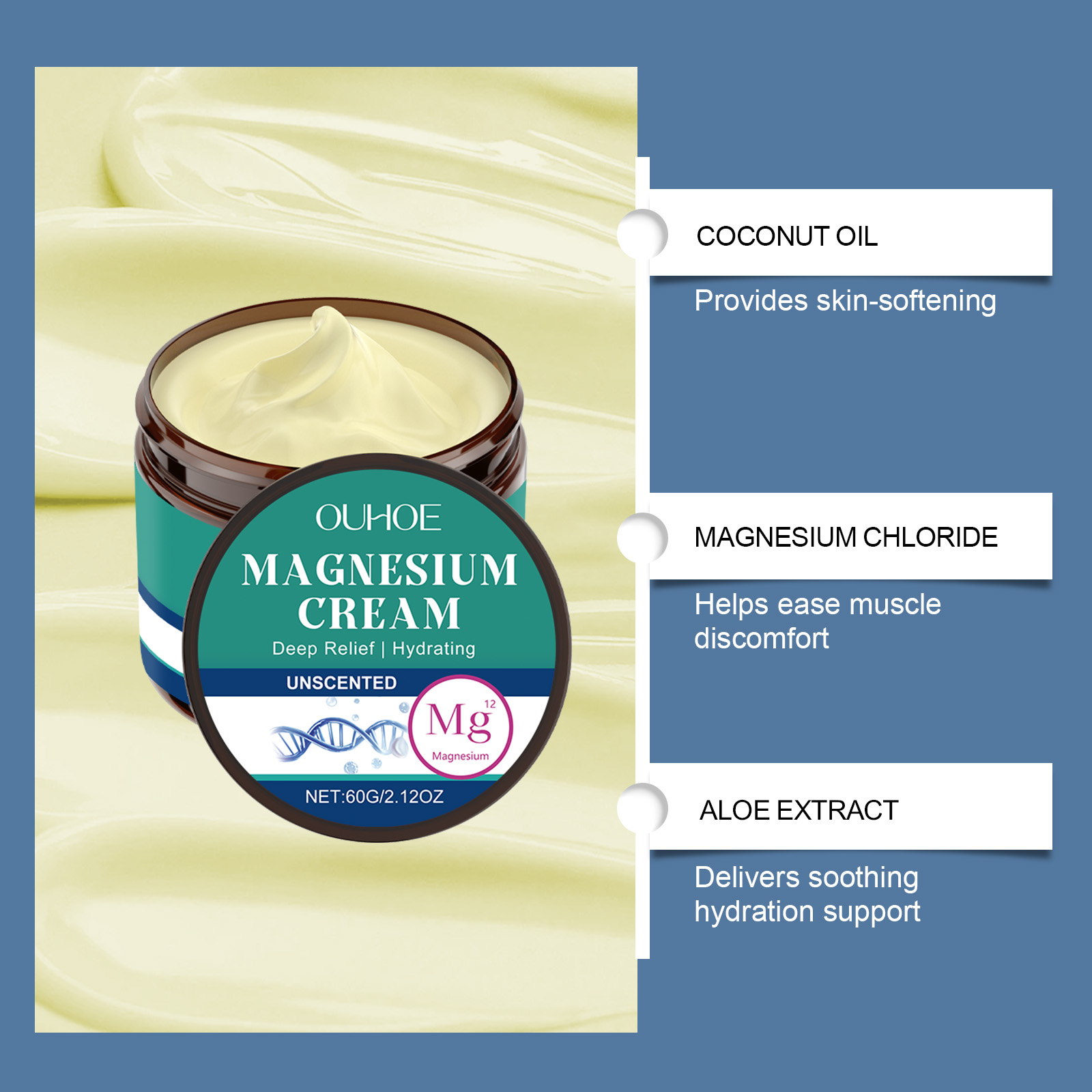 我们的无香型身体舒缓镁霜,由椰子油、芦荟叶提取物精心调配而成。专为缓解高强度锻炼后的僵硬感设计。使用方法极为便捷:清洁后,擦干皮肤表面的水分,取一小块硬币大小的膏体,在手心温热以打圈运动按摩直至吸收按摩。并且可以促进放松以改善睡眠质量,改善质地,持久保湿。