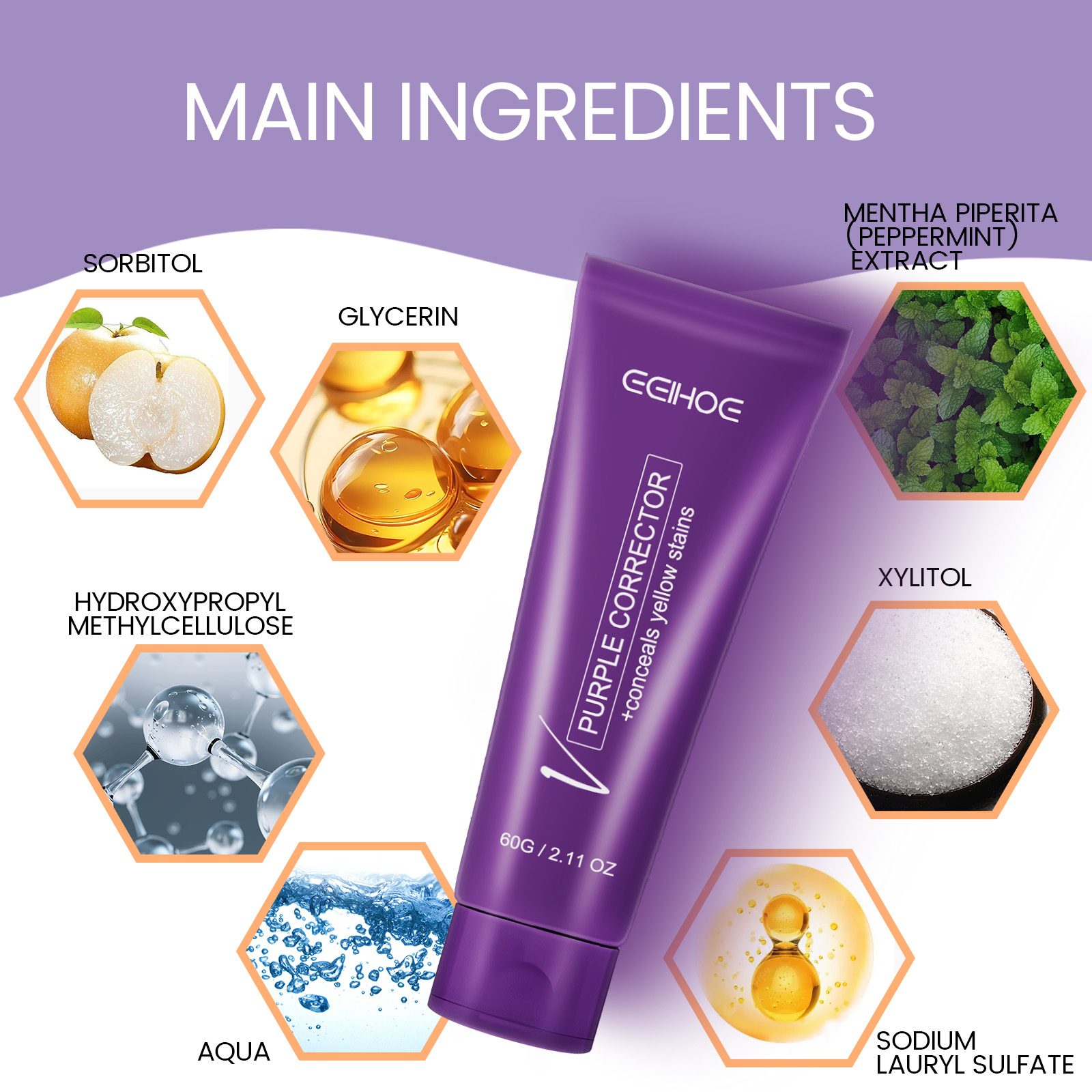 我们的紫色牙膏含有月桂醇硫酸酯钠、羟丙基甲基纤维素。它可以缓解牙龈不适,抑制有害细菌滋生,有效清除牙齿表面的牙菌斑和牙渍。它的使用方法很简单:将产品挤在牙刷上,轻轻刷牙齿和舌苔,清洁2-3分钟即可。使用后有助于改善口腔环境,呵护口腔健康,去除口腔细菌,帮助解决口臭。
