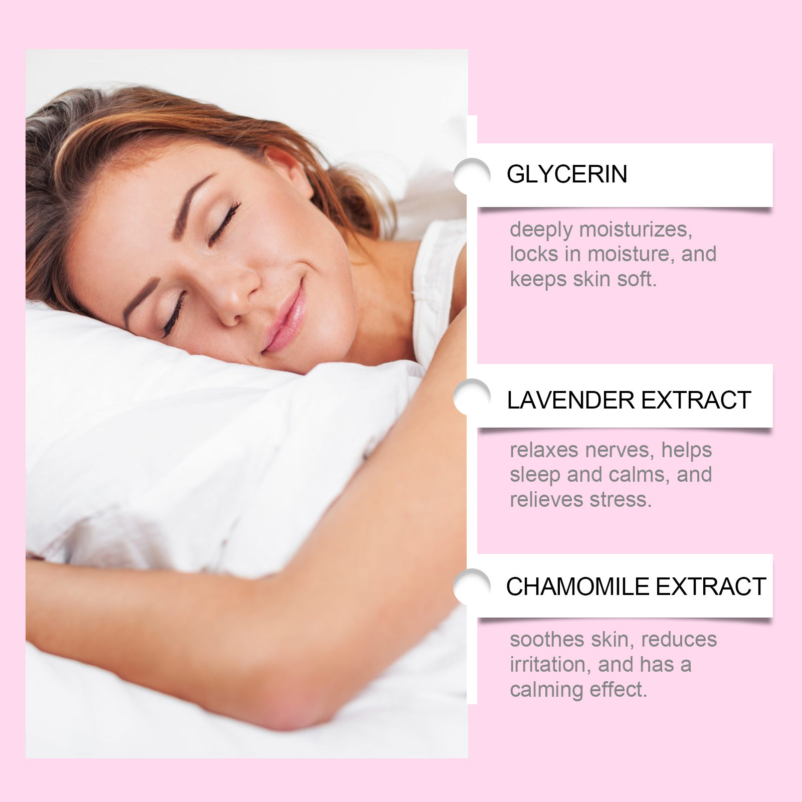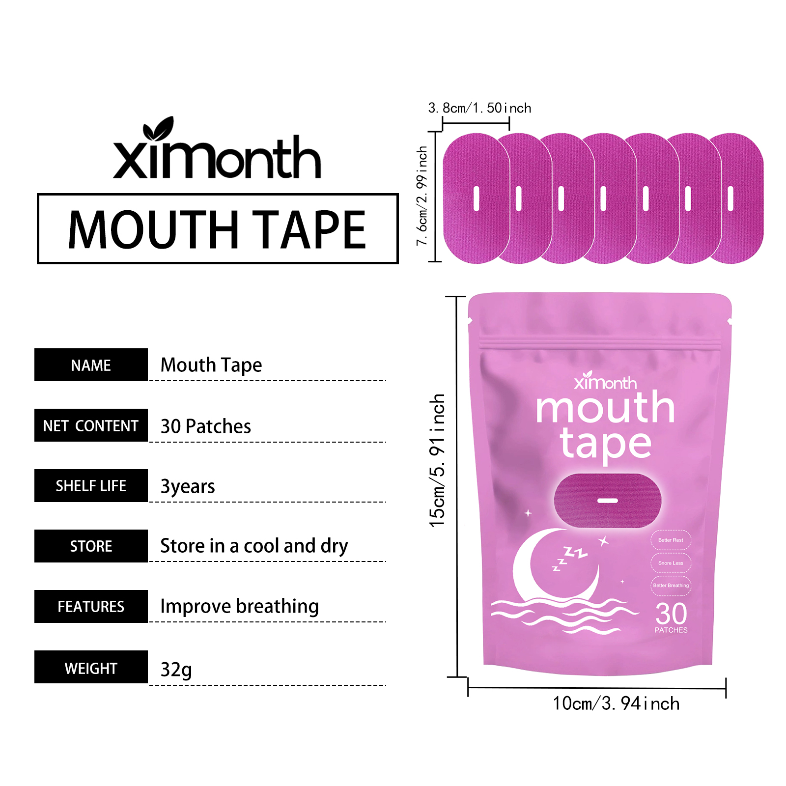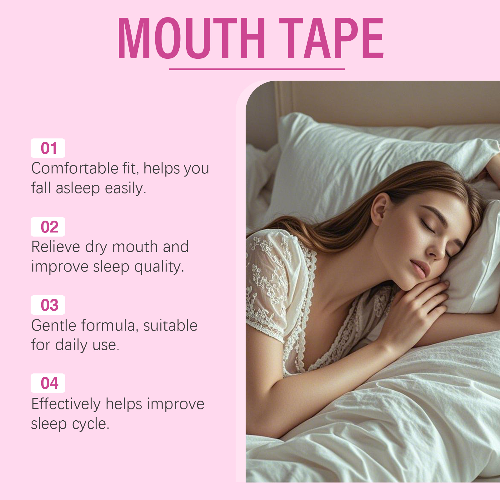 我们的睡眠贴。由迷迭香油、甘油、薰衣草提取物精心调配而成。专为帮助改善鼻呼吸的流畅性,减少因呼吸不畅引起的睡眠问题设计。使用方法极为便捷:在睡觉前清洁并干燥嘴巴周围的皮肤。然后把这个产品粘在你的嘴上,醒来后把它取下来。并且可以为您的睡眠,提供额外的舒缓保护,让您告别打鼾烦恼。