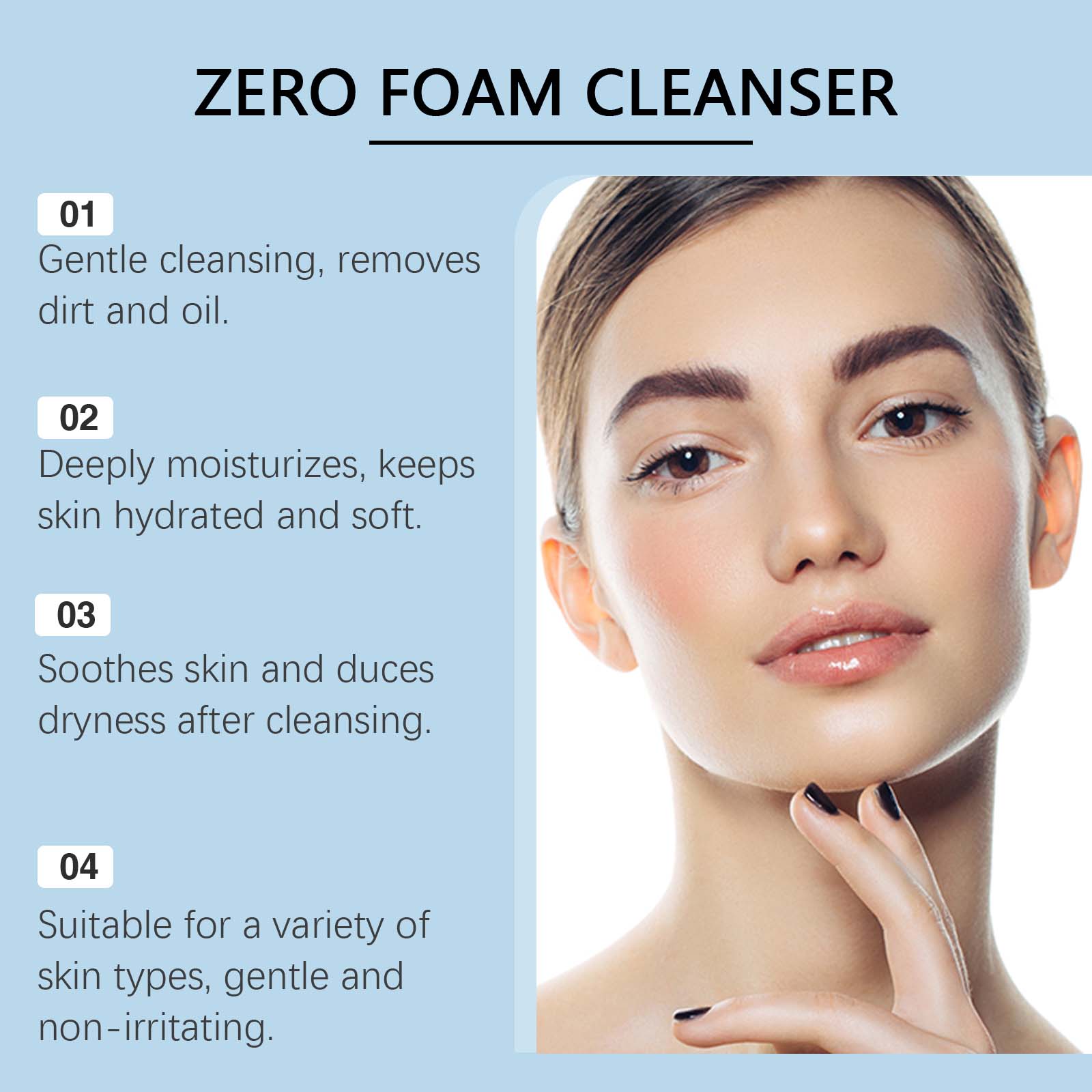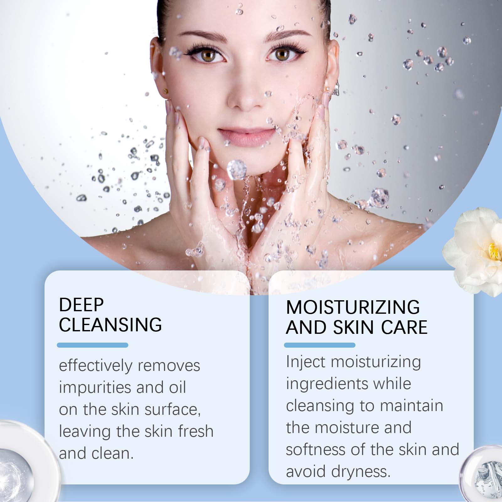 我们的保湿洁面乳,由茉莉花提取物、山茶花提取物精心调配而成。专为有效去除皮肤表面的杂质和油脂,使皮肤清新洁净设计。使用方法极为便捷:用温水清洁双手并湿润脸部。取适量洁面乳,加入少量水,揉搓至起泡。用手指尖均匀地涂抹在脸上。用清水冲洗脸部,然后用干净的毛巾擦干。并且可以在清洁时注入保湿成分,以保持皮肤的湿润和柔软,避免干燥。