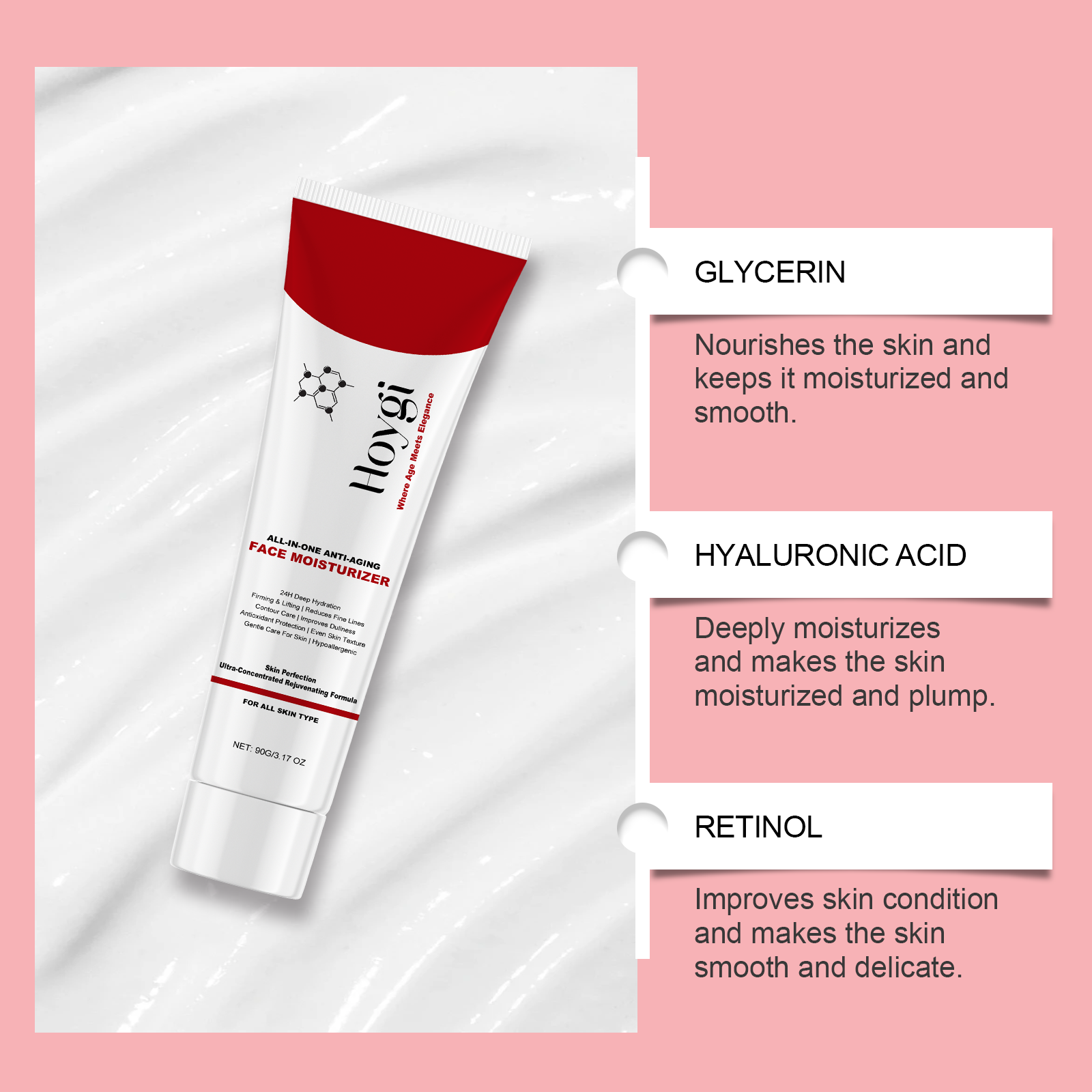 我们的视黄醇肌肤霜,由三乙醇胺、透明质酸、视黄醇精心调配而成。专为滋养肌肤,使肌肤细腻光滑设计。使用方法极为便捷:清洁你的脸并保持干燥。将适量本品均匀涂抹于面部。轻轻按摩直至吸收。并且使用后持续保湿,改善皮肤干燥。